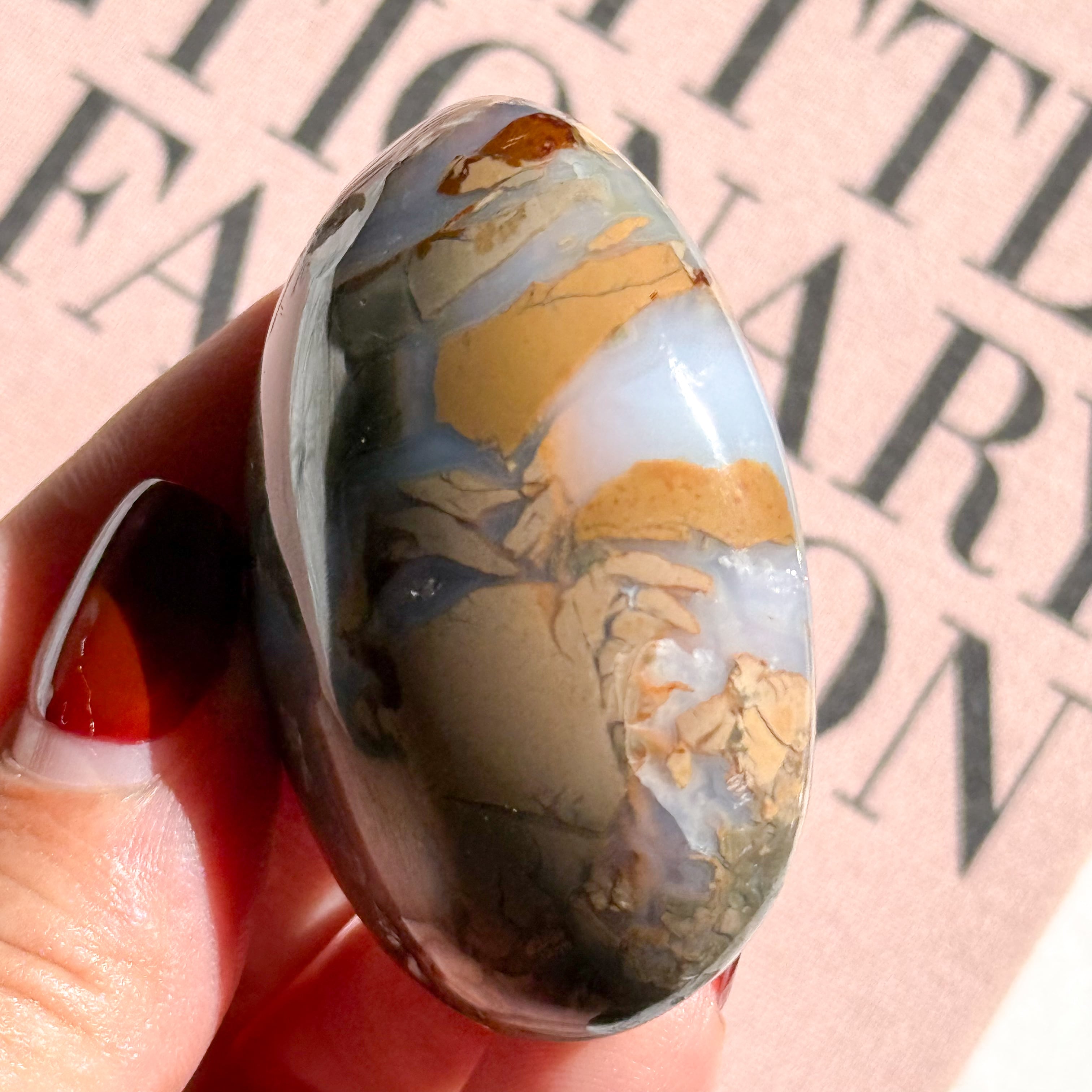 秋の空気を綴じ込めたような深いカラーが魅力。隙間を埋めるのはアゲートで、奥行きのある乳白色のパートが幻想的です。