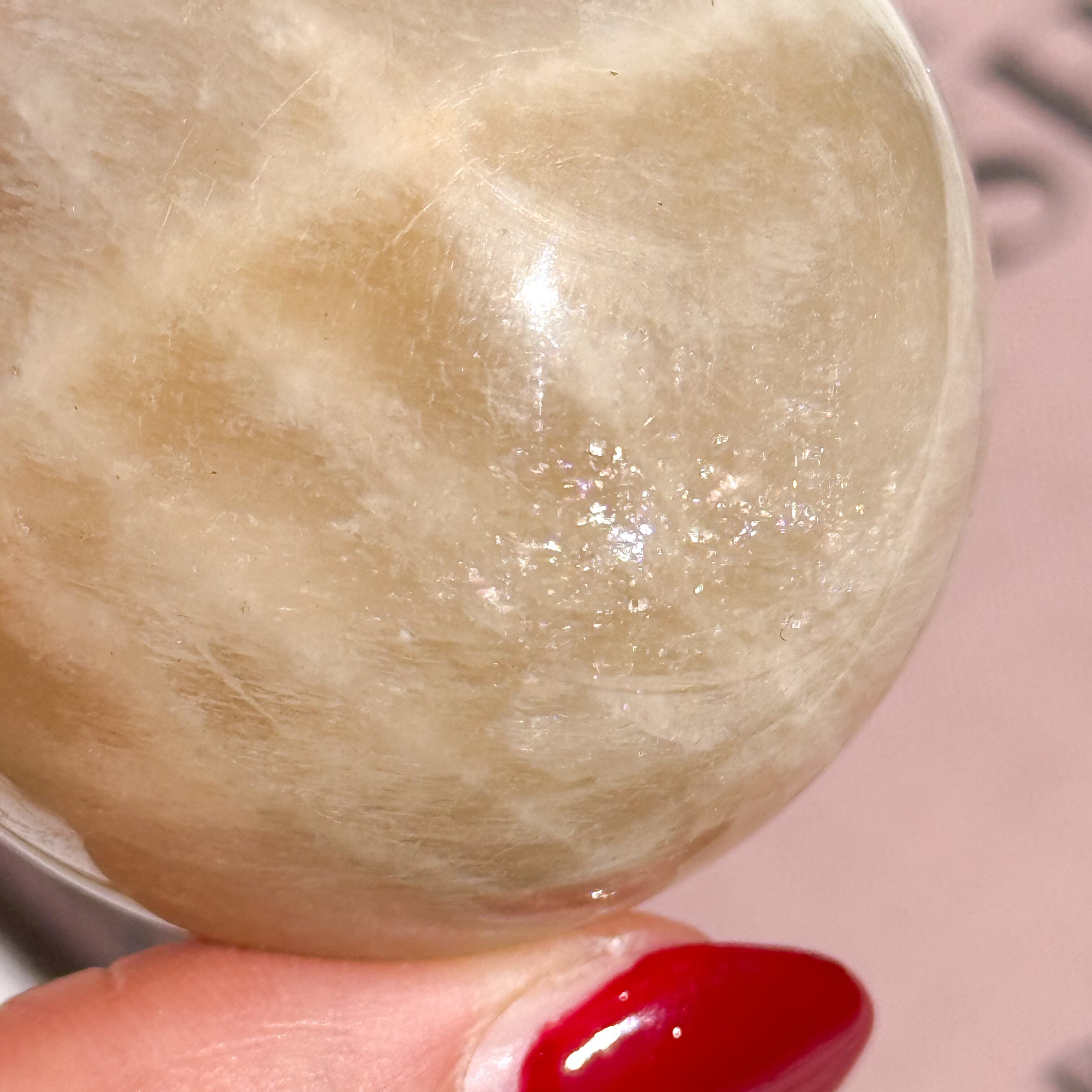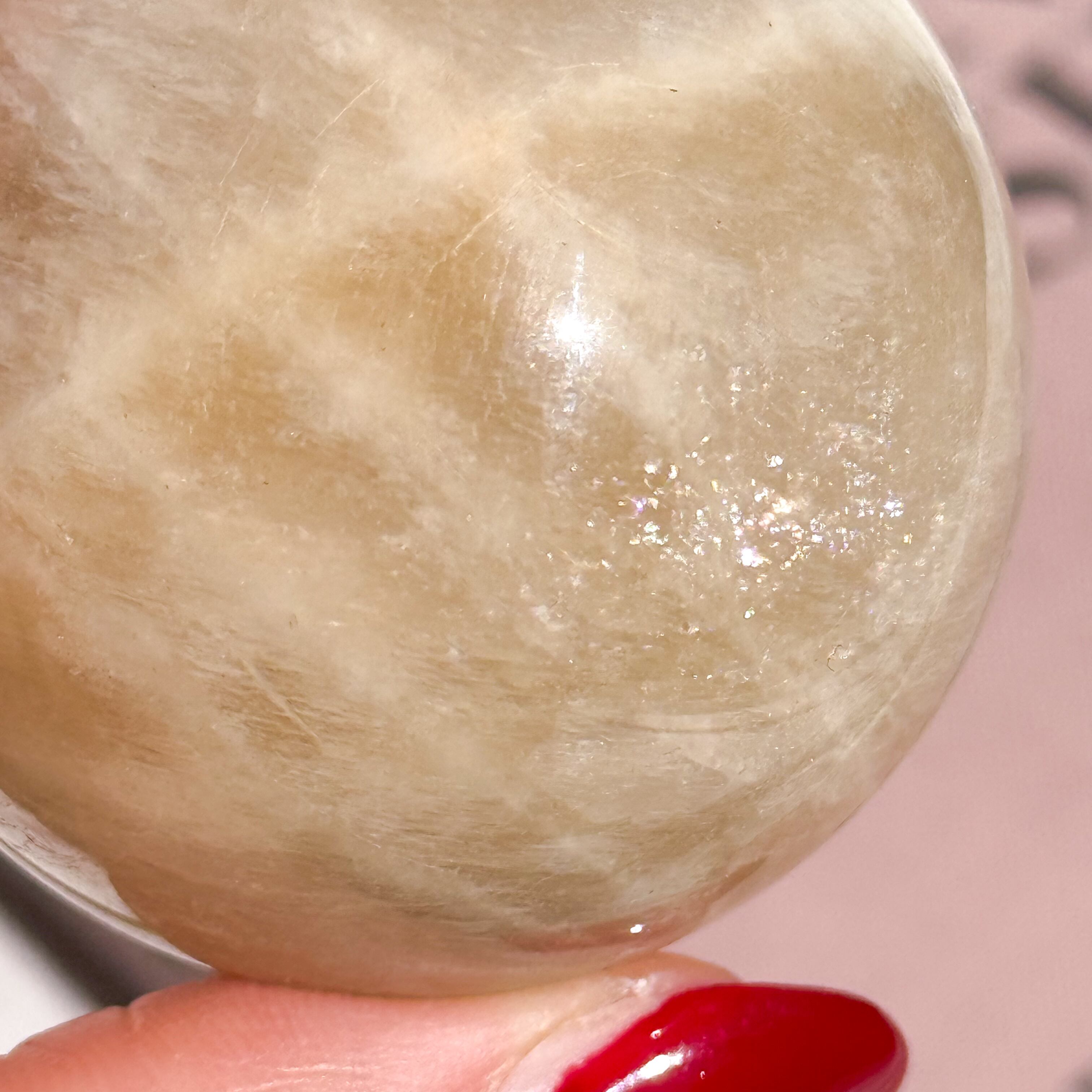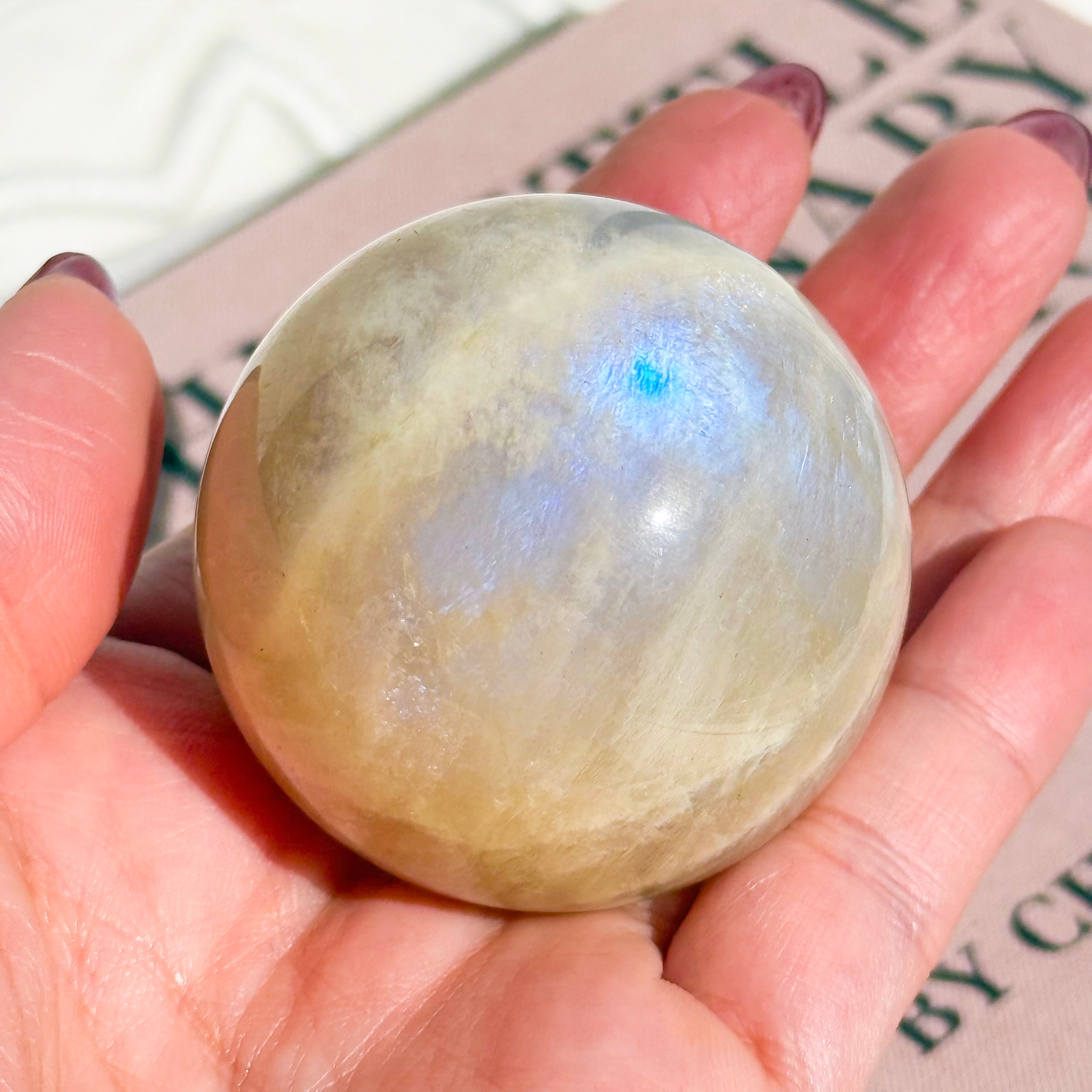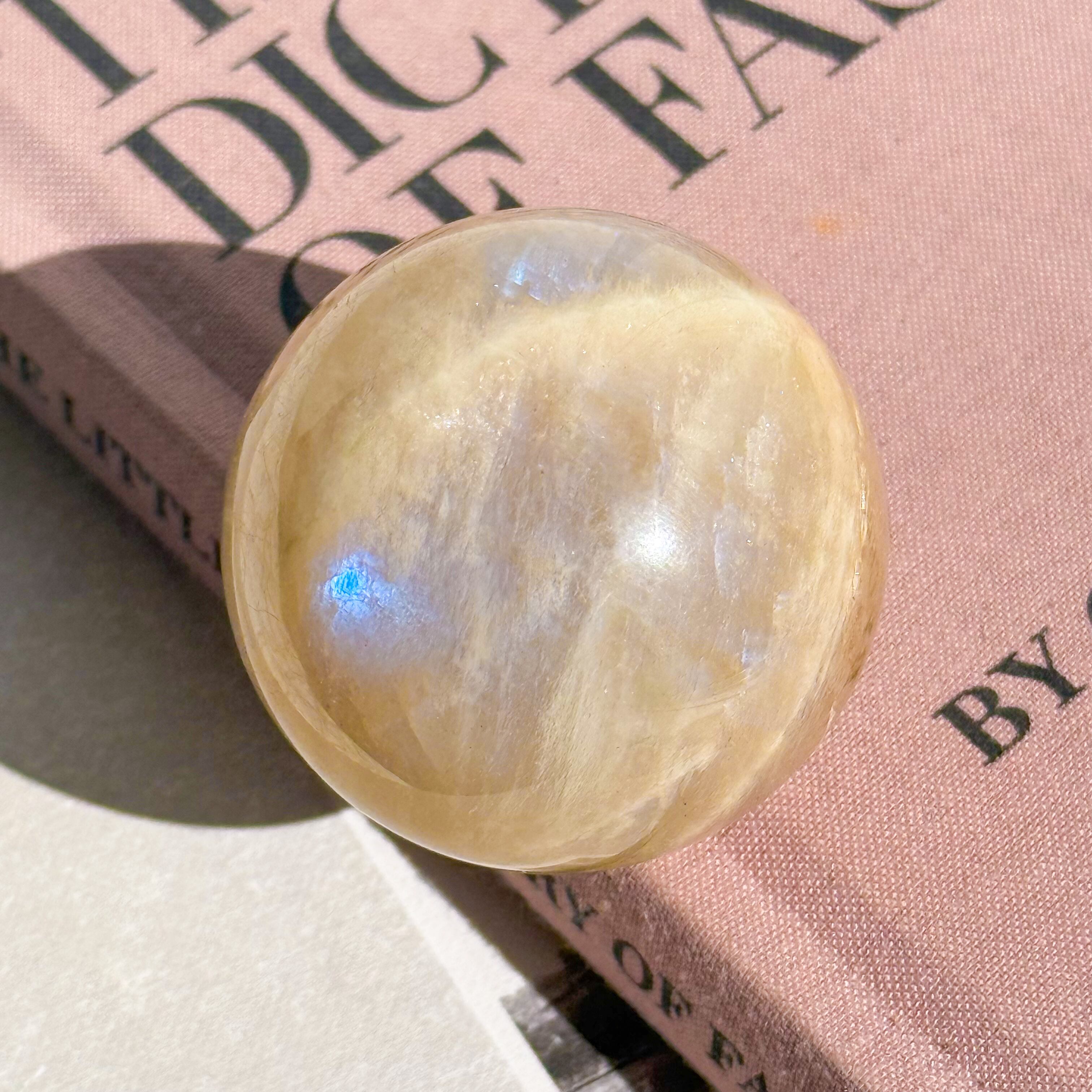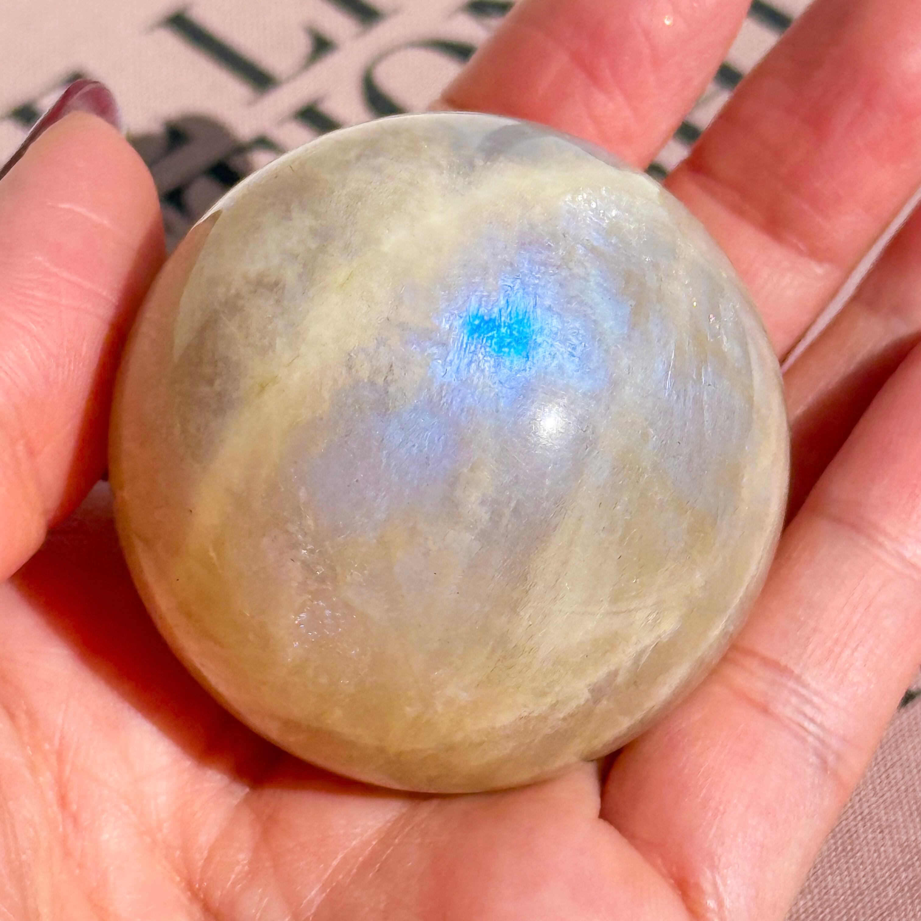 タンザニア産のムーンストーンのスフィアです。 瞬くように入るブルーのシラーが最高に美しいピース。 ホワイト部分にはキラキラと輝くアベンチュレッセンス効果が見られます。非の打ち所のない、美しいフルムーン。 Measurements: 約 46mm (直径) Weight - 138g タンザニア産