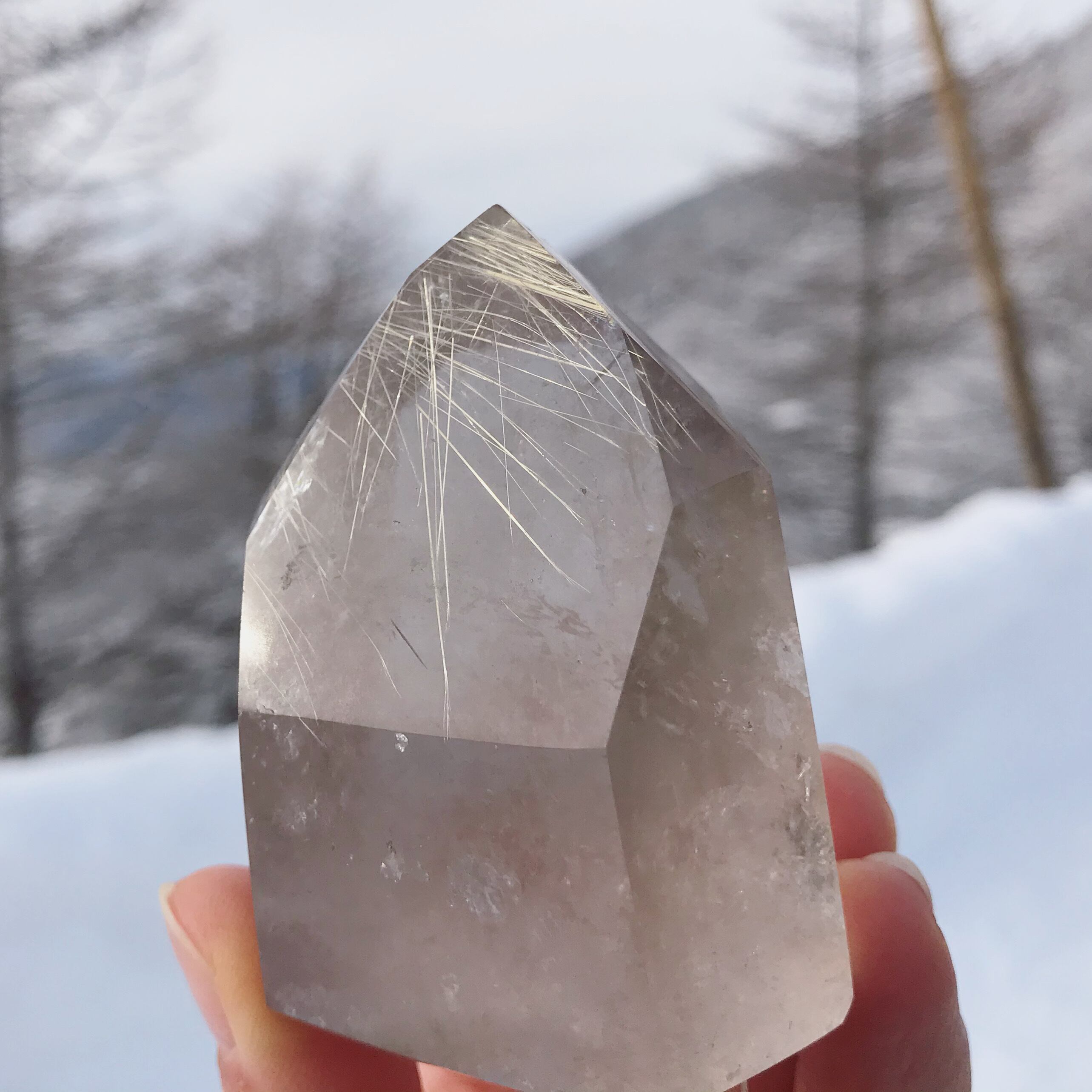 ポイントの上部に繊細に入ったルチルと、ルチルの奥にみえるカラフルな虹が特徴的です。