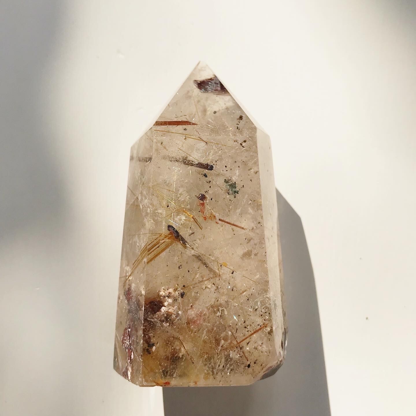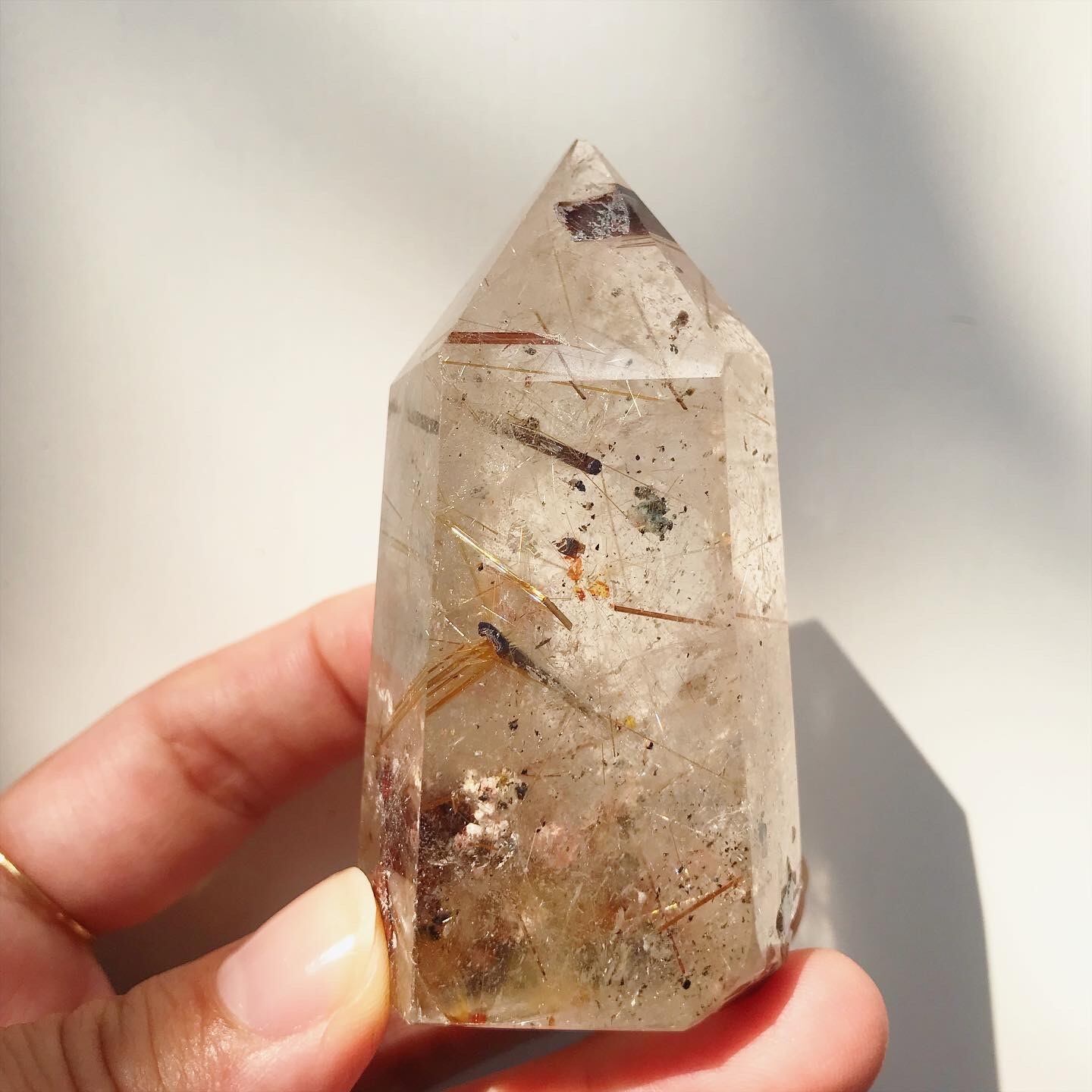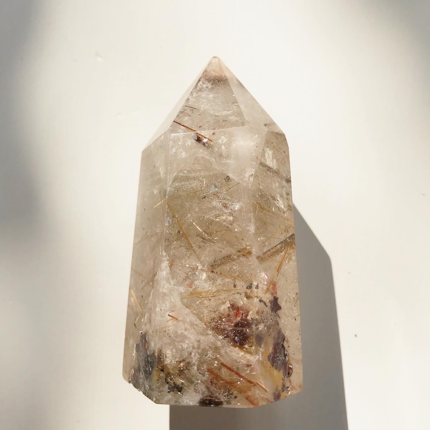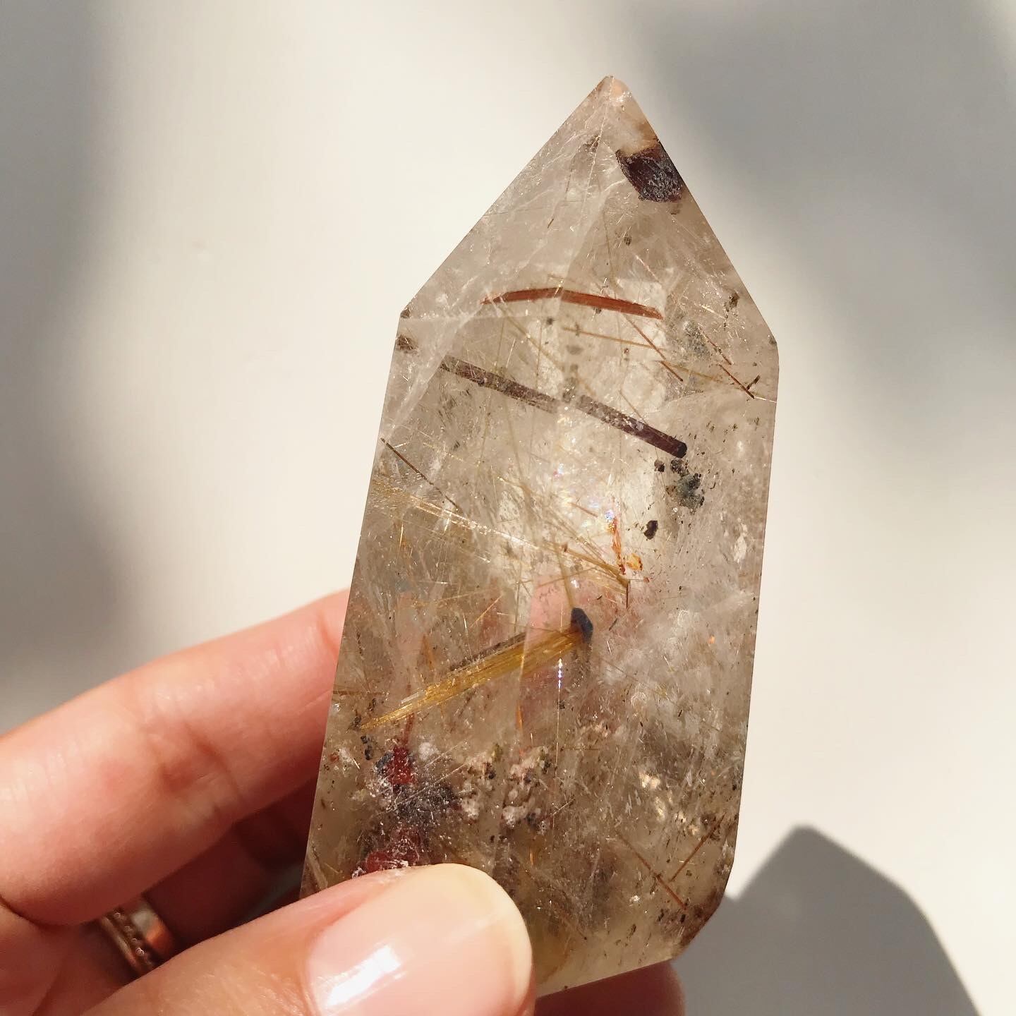 コッパーやゴールドカラーの、様々な太さのルチルが