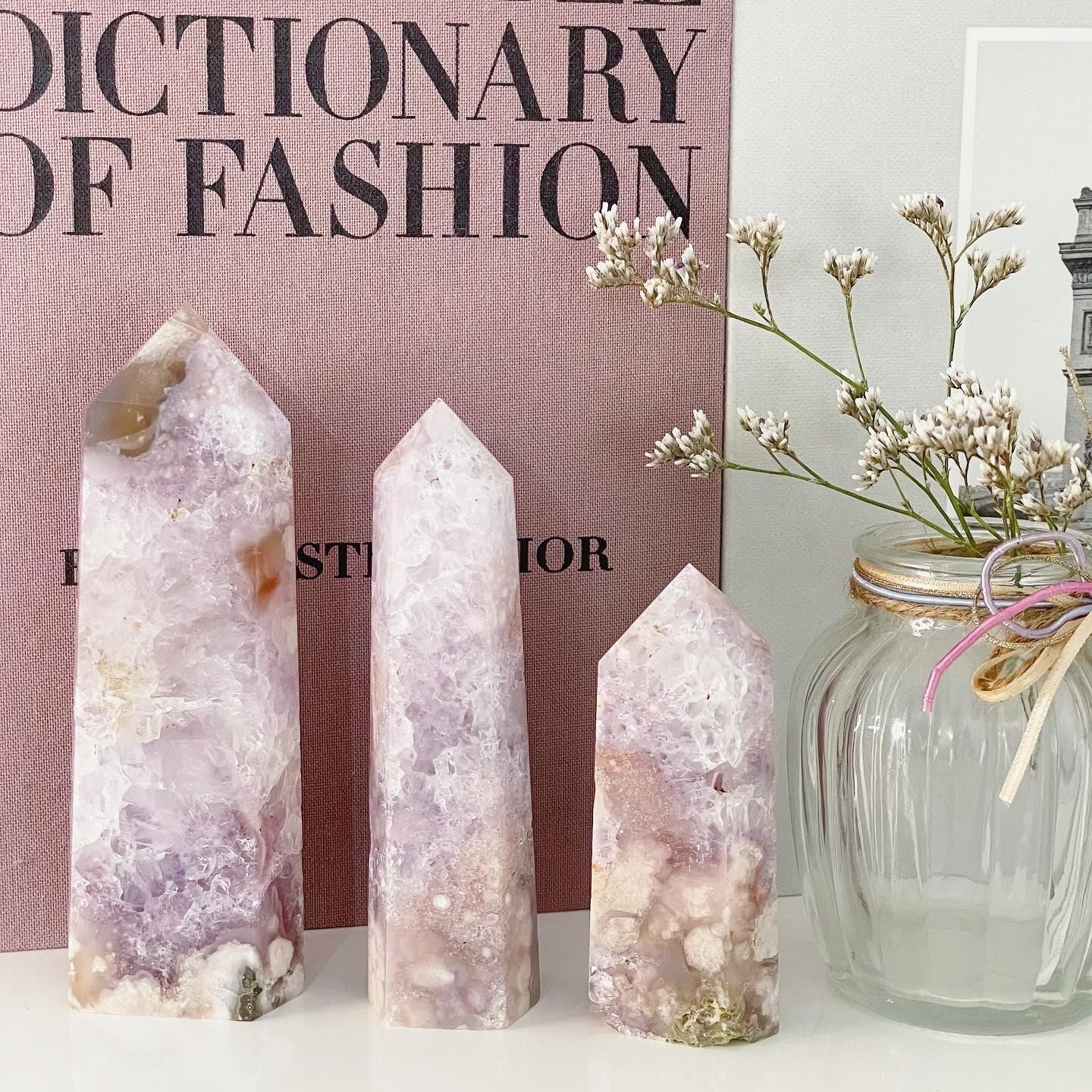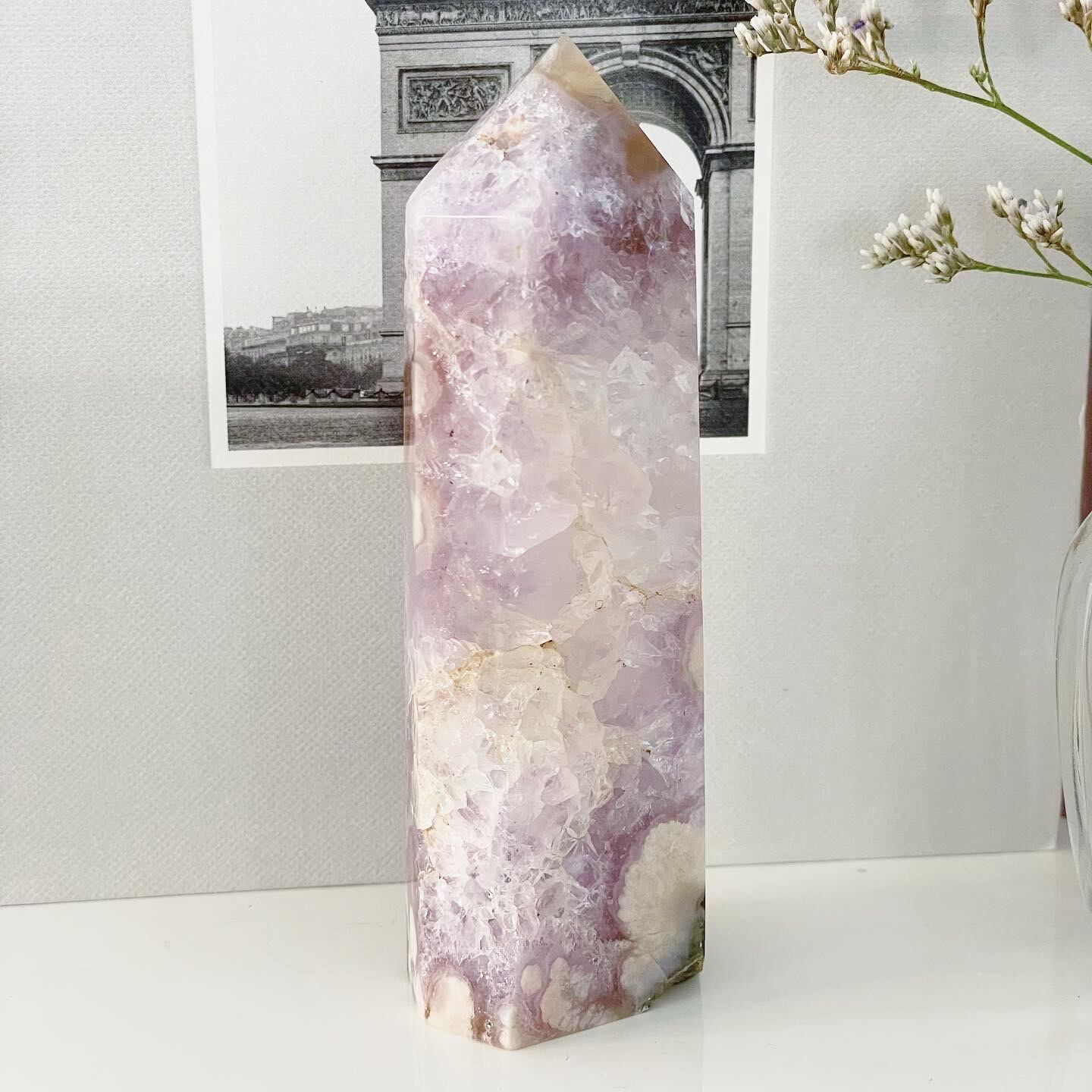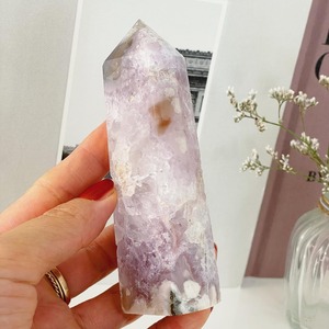 柔らかいピンクのフラワーアゲートは、ボディの下部をメインに彩り、さらに中部にも小さなお花を散りばめたように、優しくやさしく入っています。