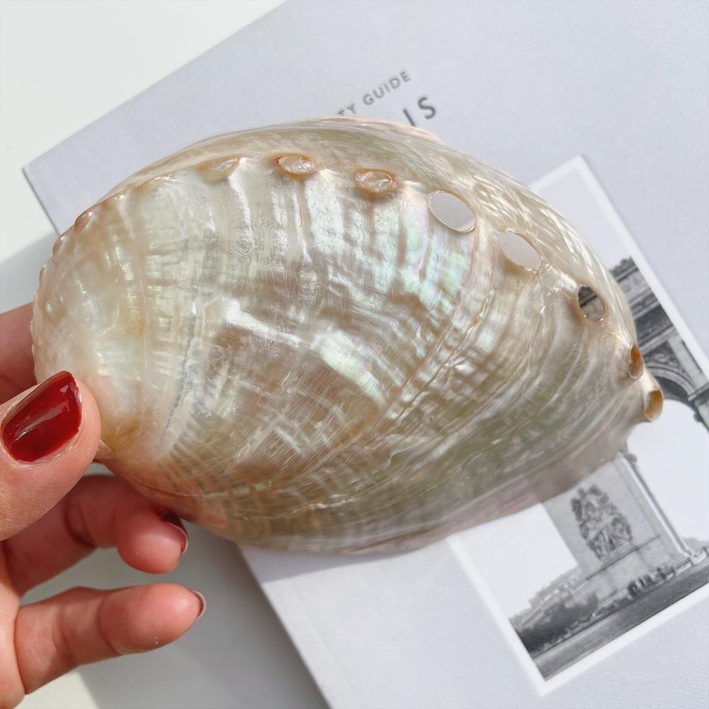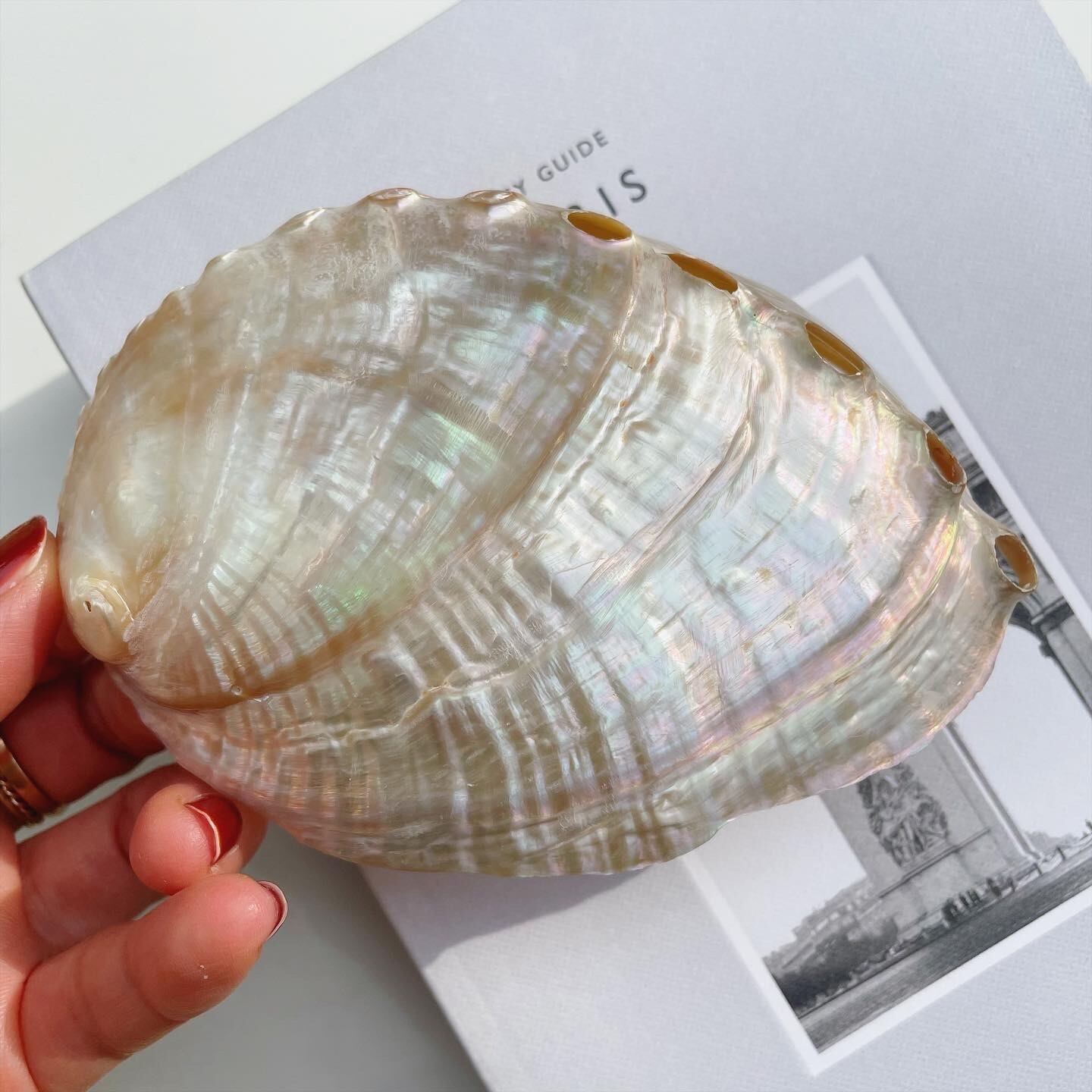 パールのような柔らかいホワイトに、虹の広がり方がとても美しいシェルです。