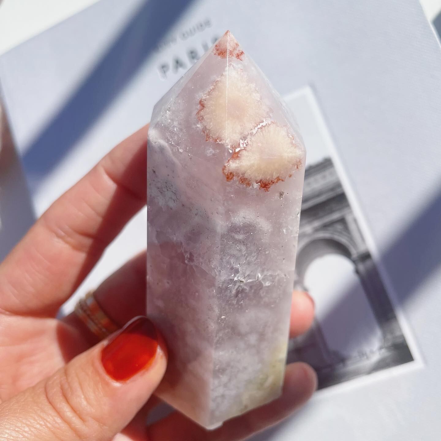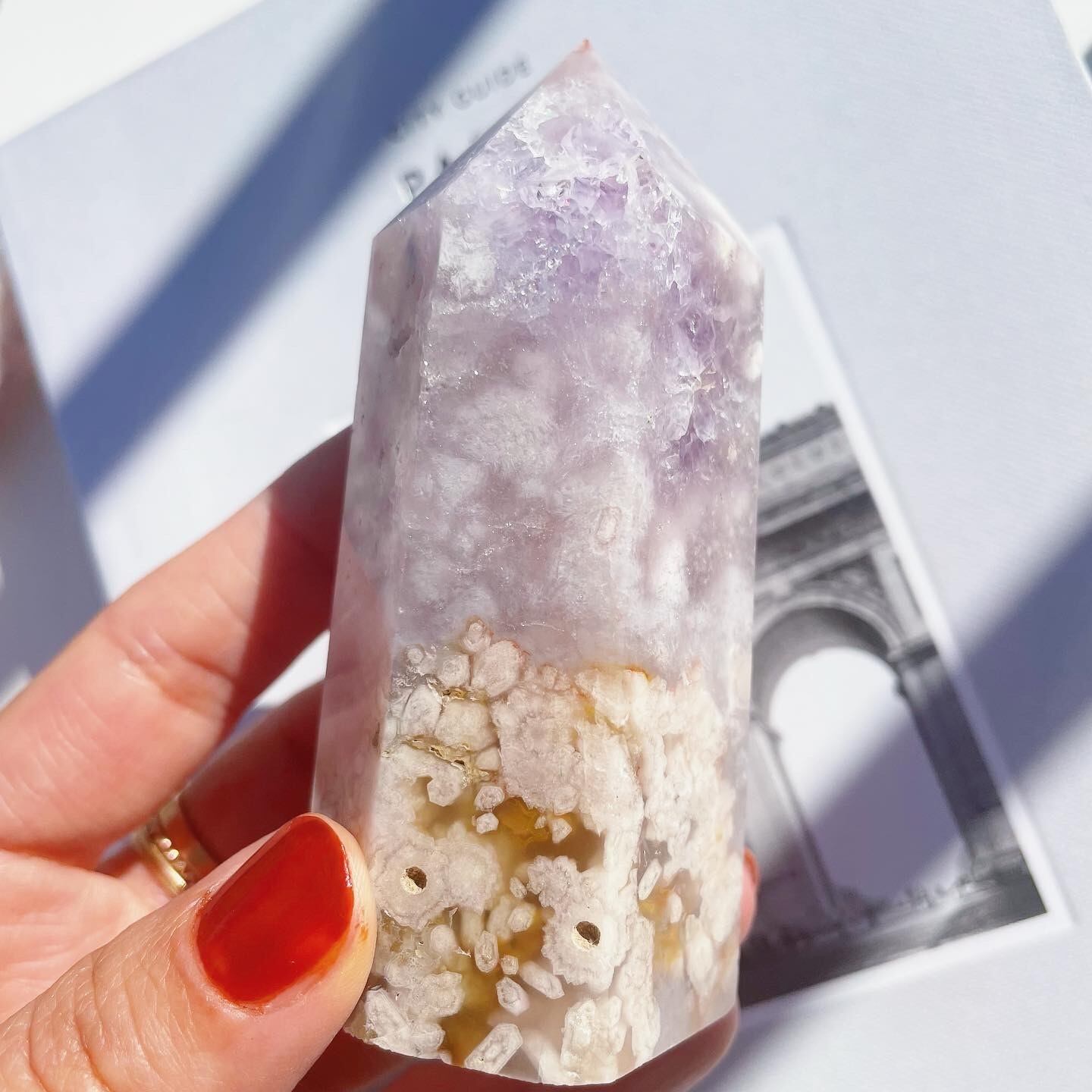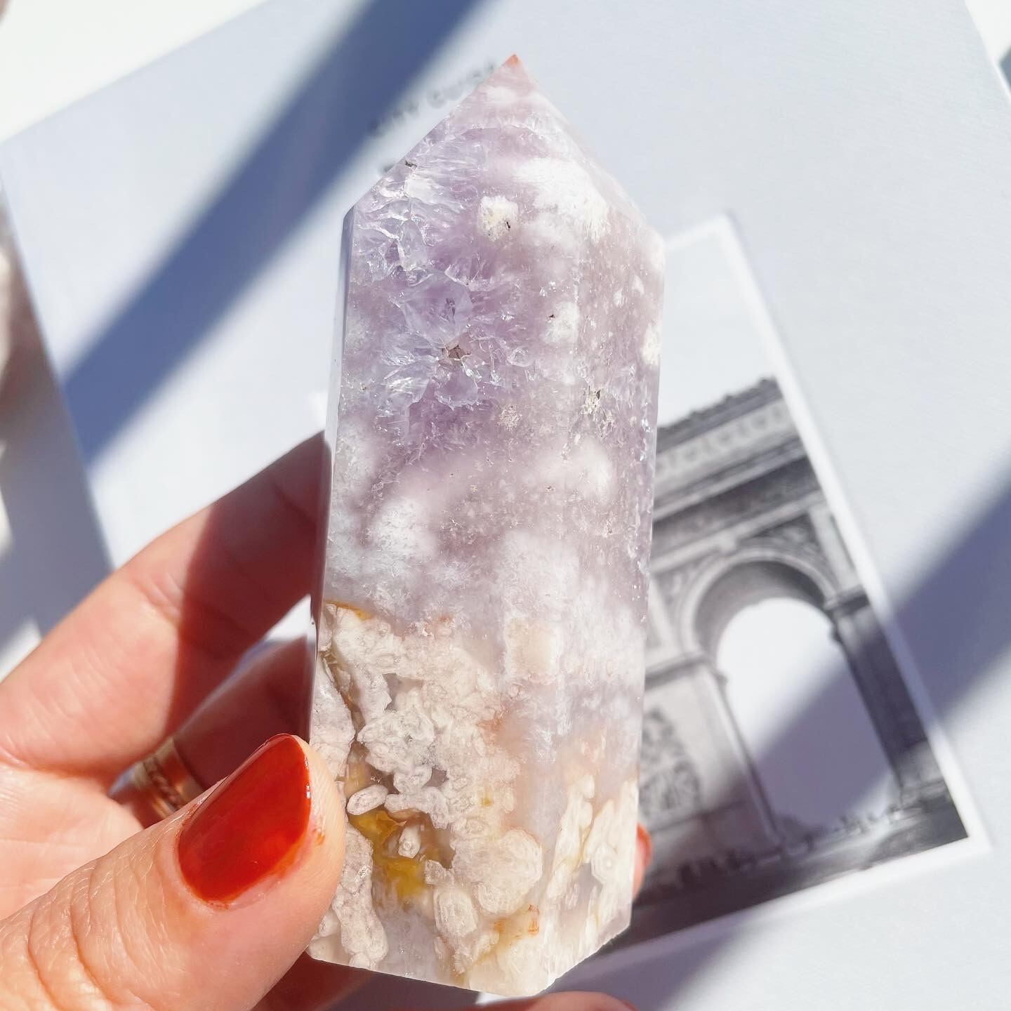 パープル、ライラック、柔らかいピンクの色の層が流れるような曲線を描き、まるで絵画のような印象のあるポイント。透明度のある紫が鮮やかな結晶部分(トップの部分)には小さな虹が沢山でます。