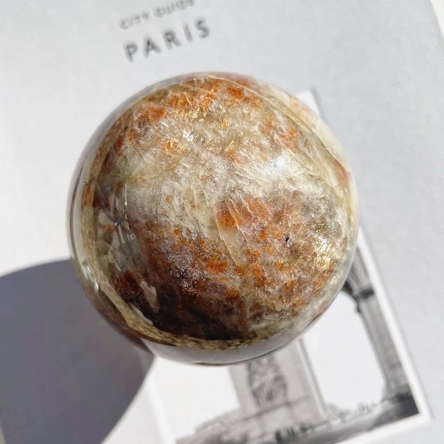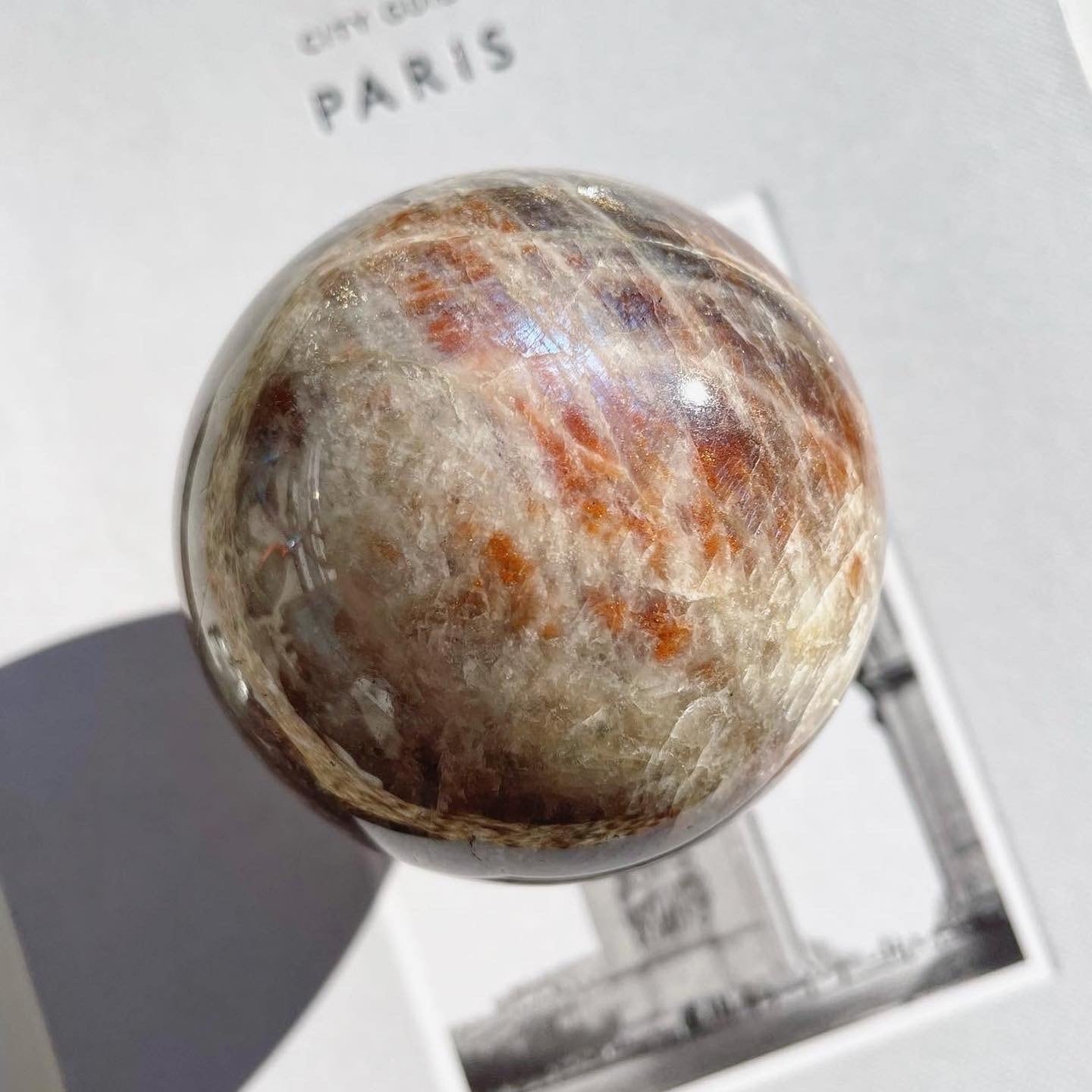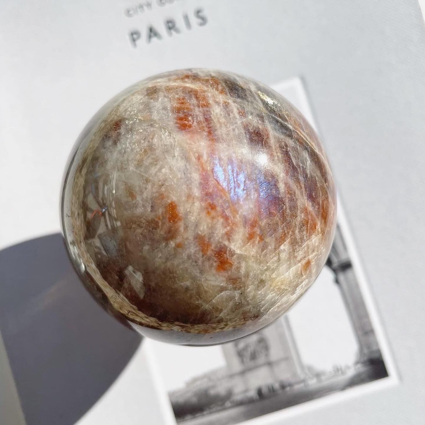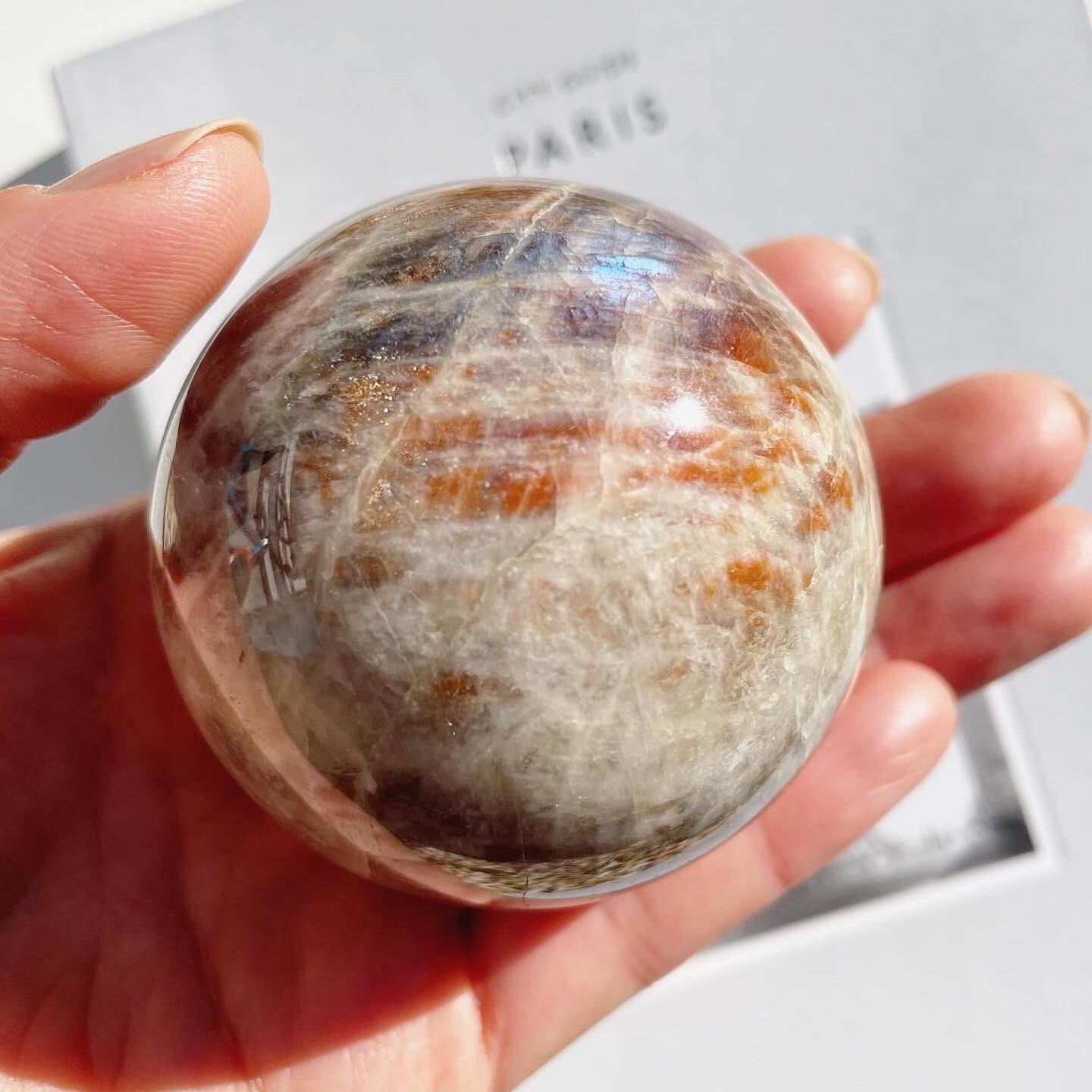 サンストーンの特徴である、オレンジ色に煌めくアベンチュレッセンス効果と、ムーンストーンに特徴的な、静かな光・青色のイリデッセンス効果、このふたつを併せ持つ、神秘的なストーンです♡