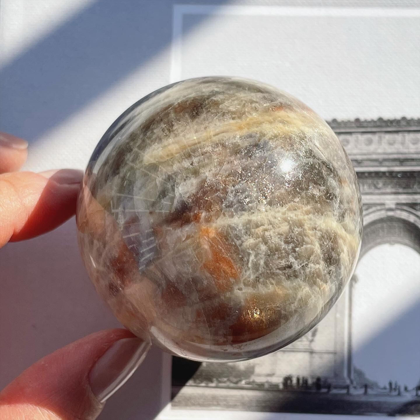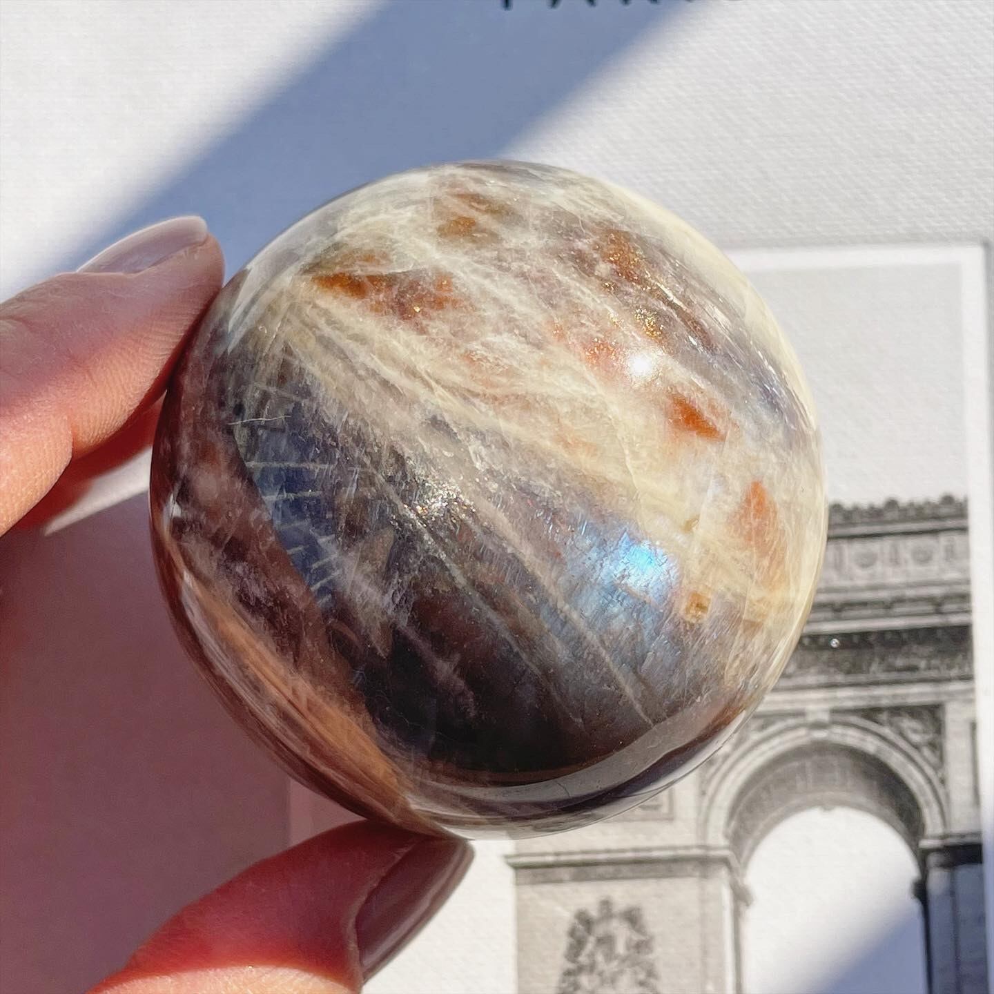 サンストーンの特徴である、オレンジ色に煌めくアベンチュレッセンス効果と、ムーンストーンに特徴的な、静かな光・青色のイリデッセンス効果、このふたつを併せ持つ、神秘的なストーンです♡