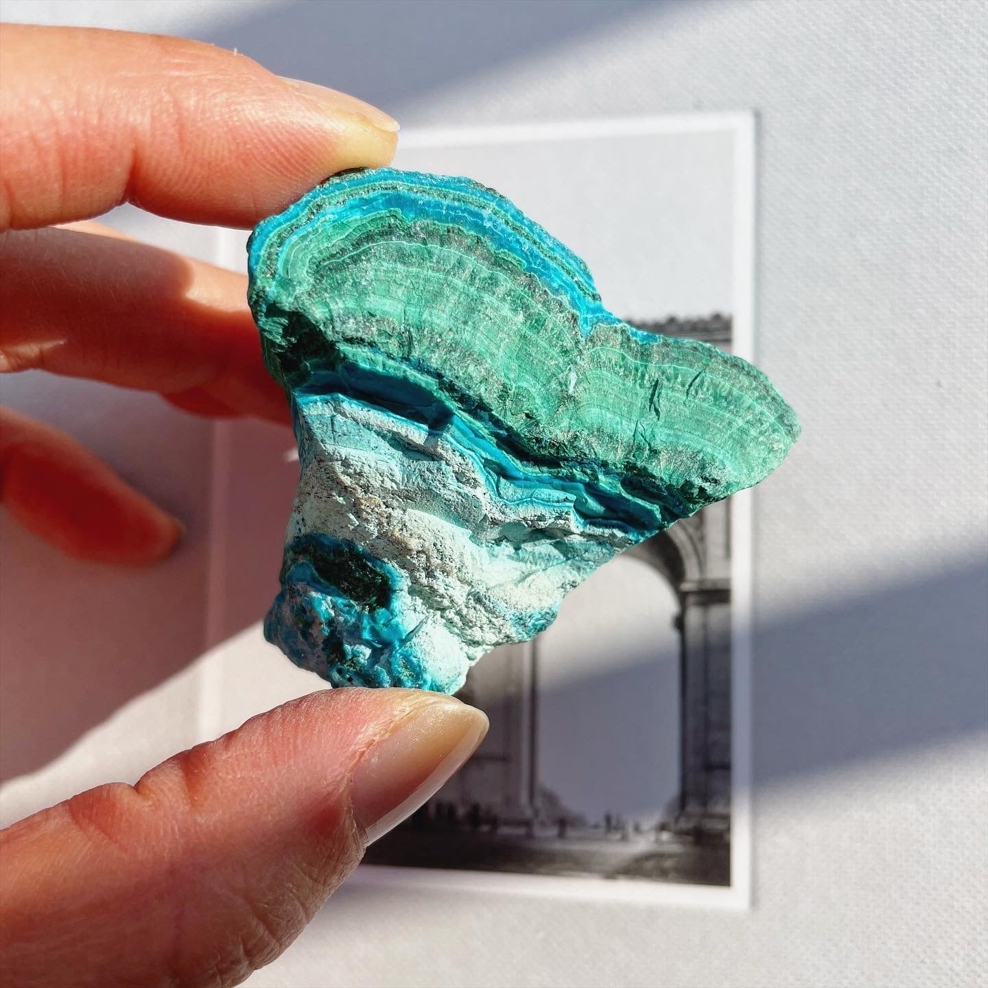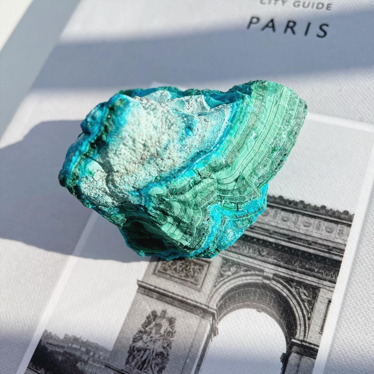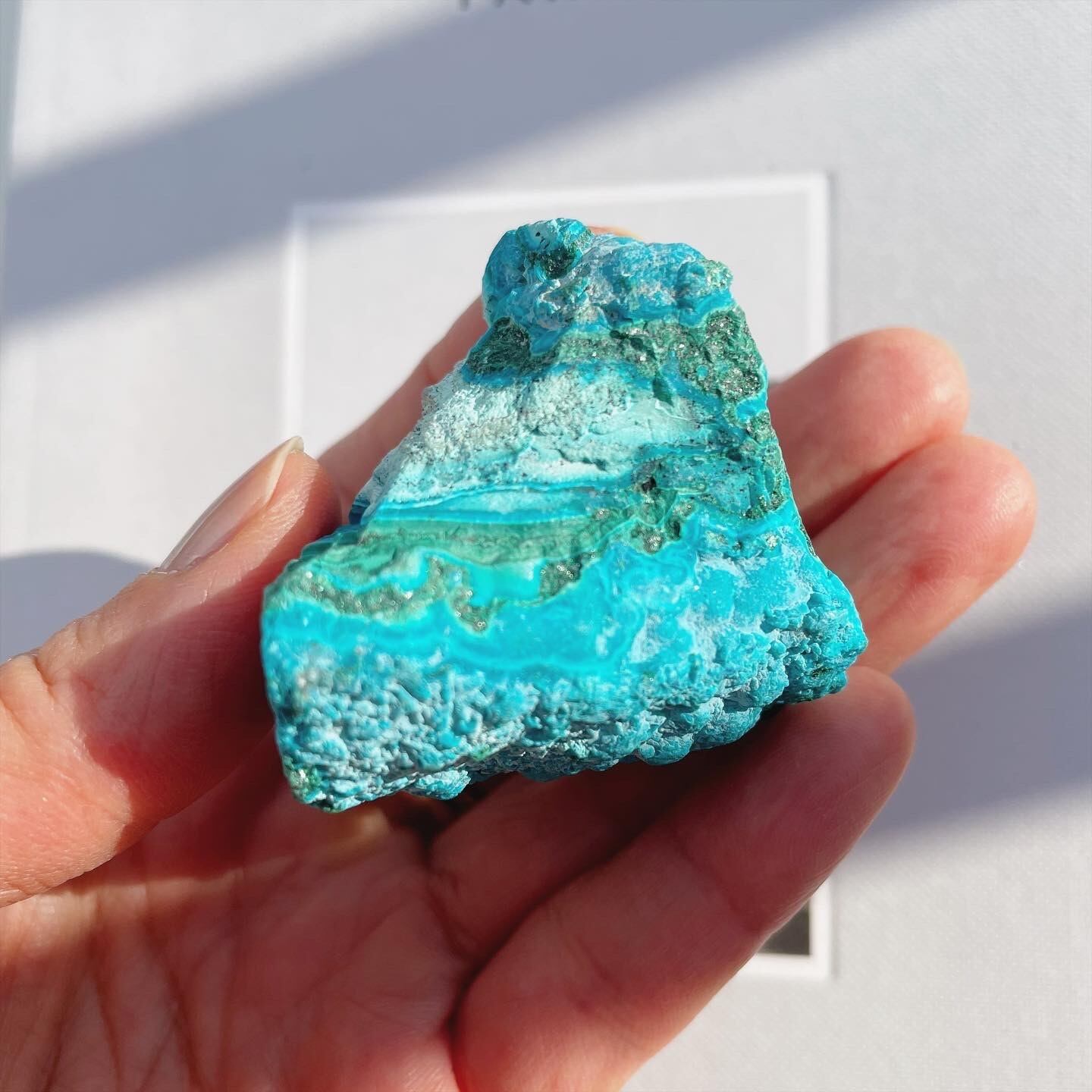 ビビッドなクリソコラのターコイズブルー、マラカイトのグリーンにホワイトが相まって美しい層を形成する、珍しい原石。