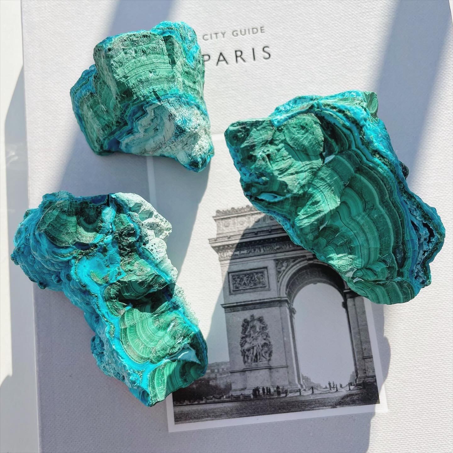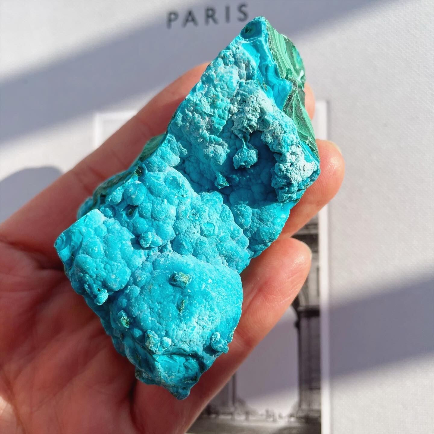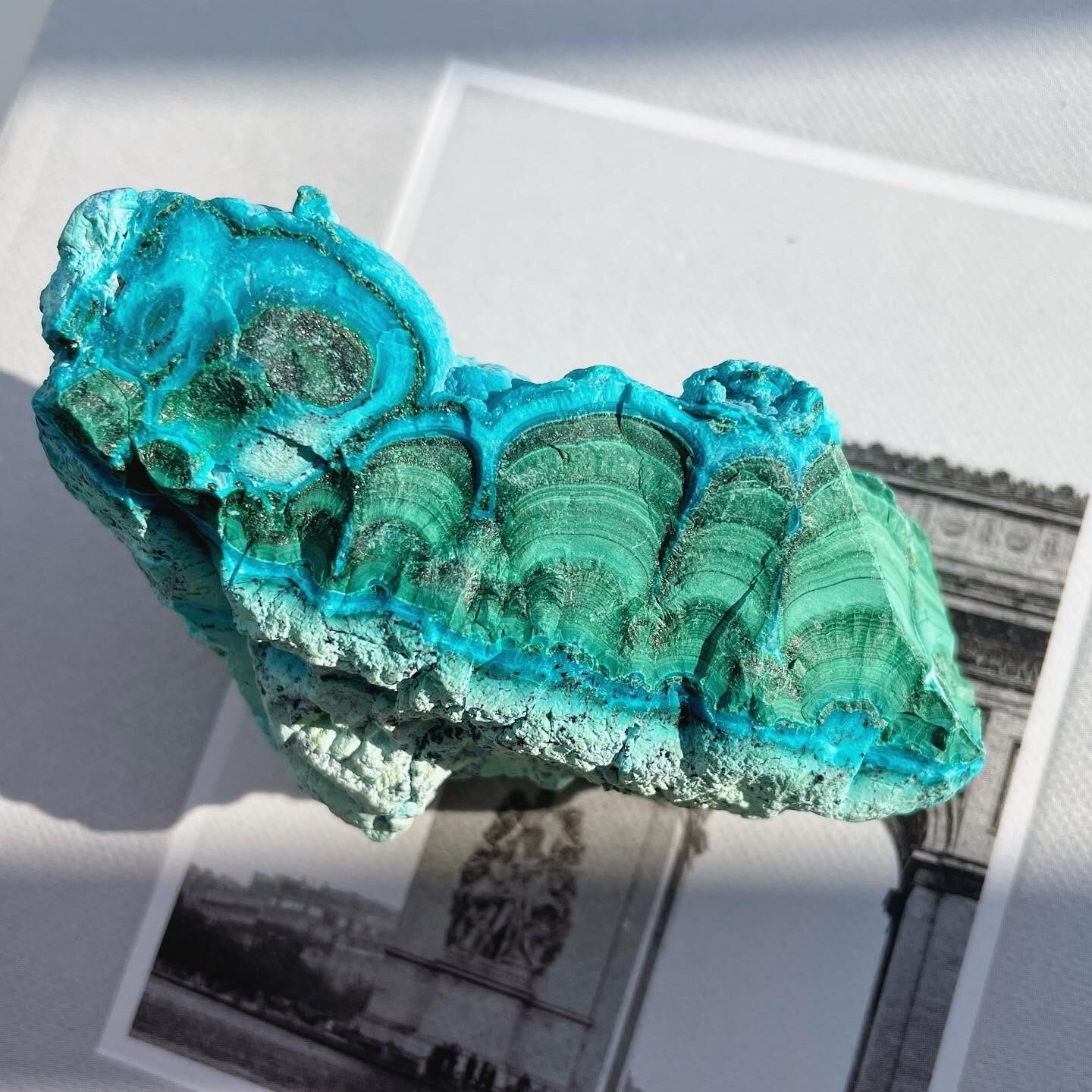 ビビッドなクリソコラのターコイズブルー、マラカイトのグリーンにホワイトが相まって美しい層を形成する、珍しい原石。