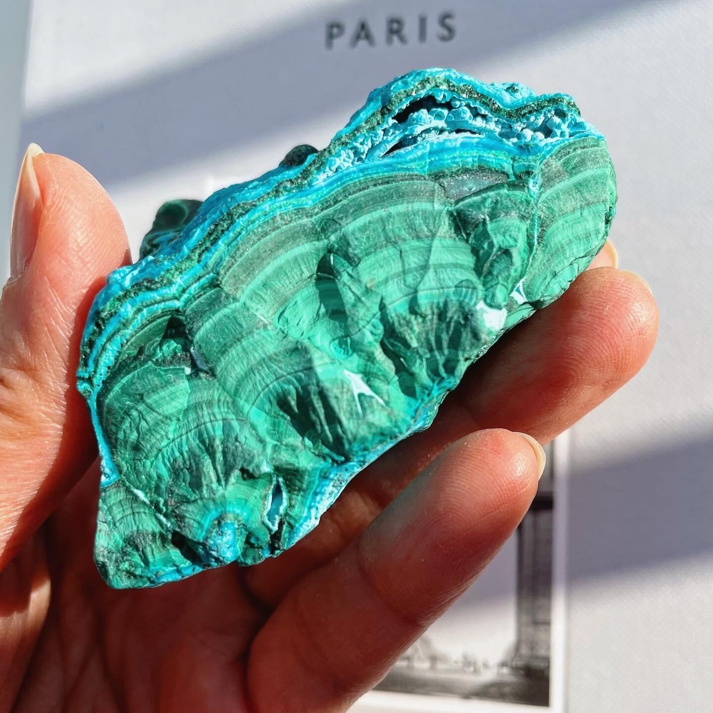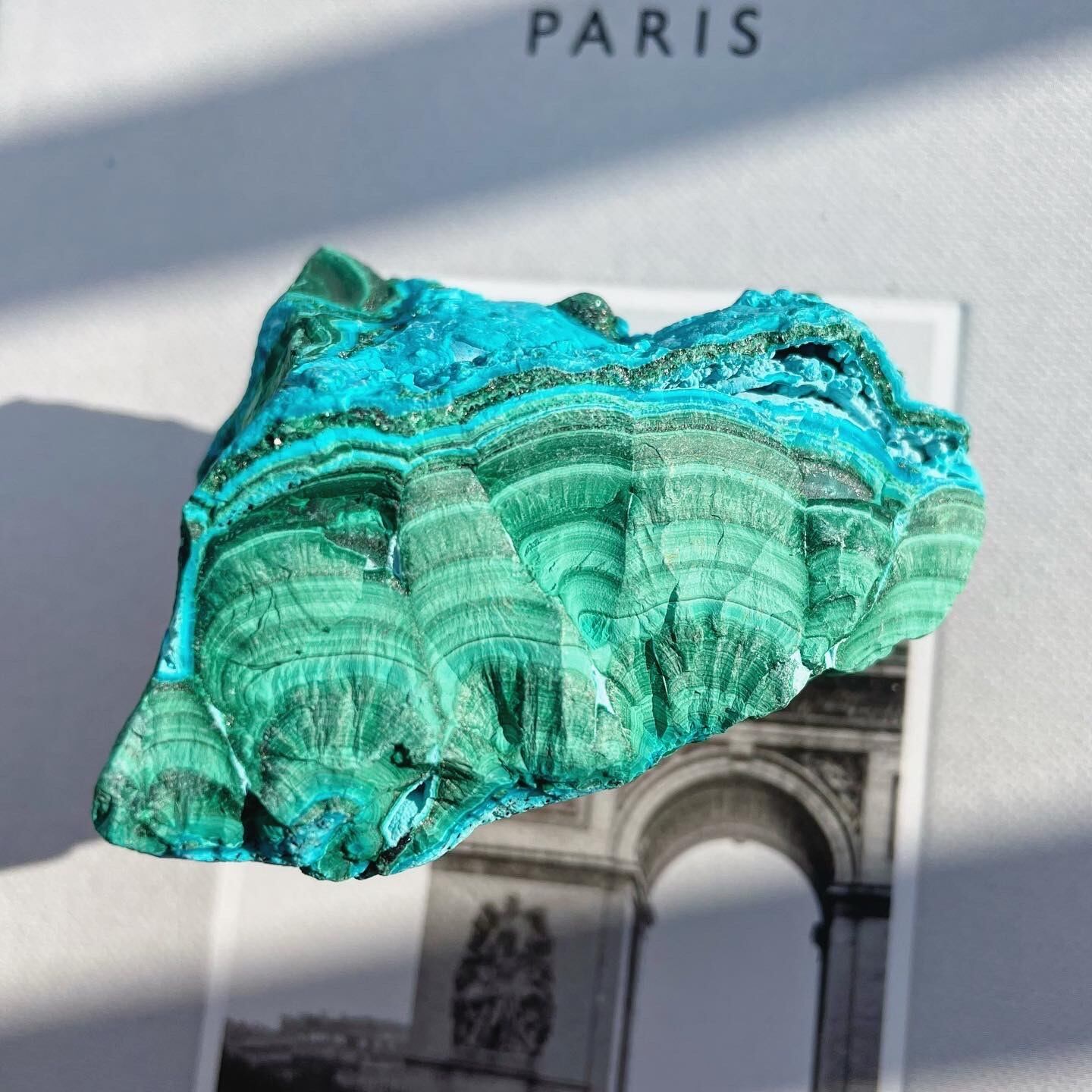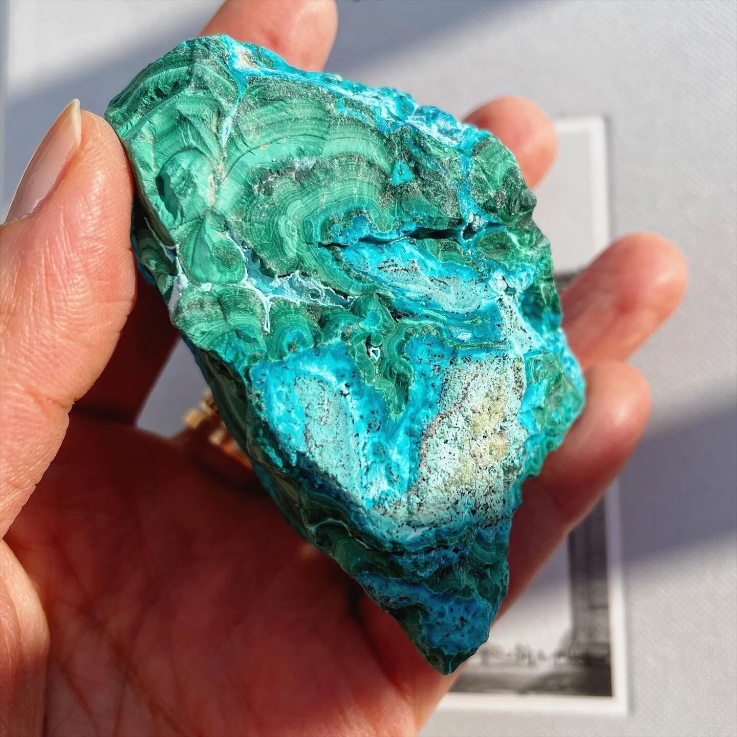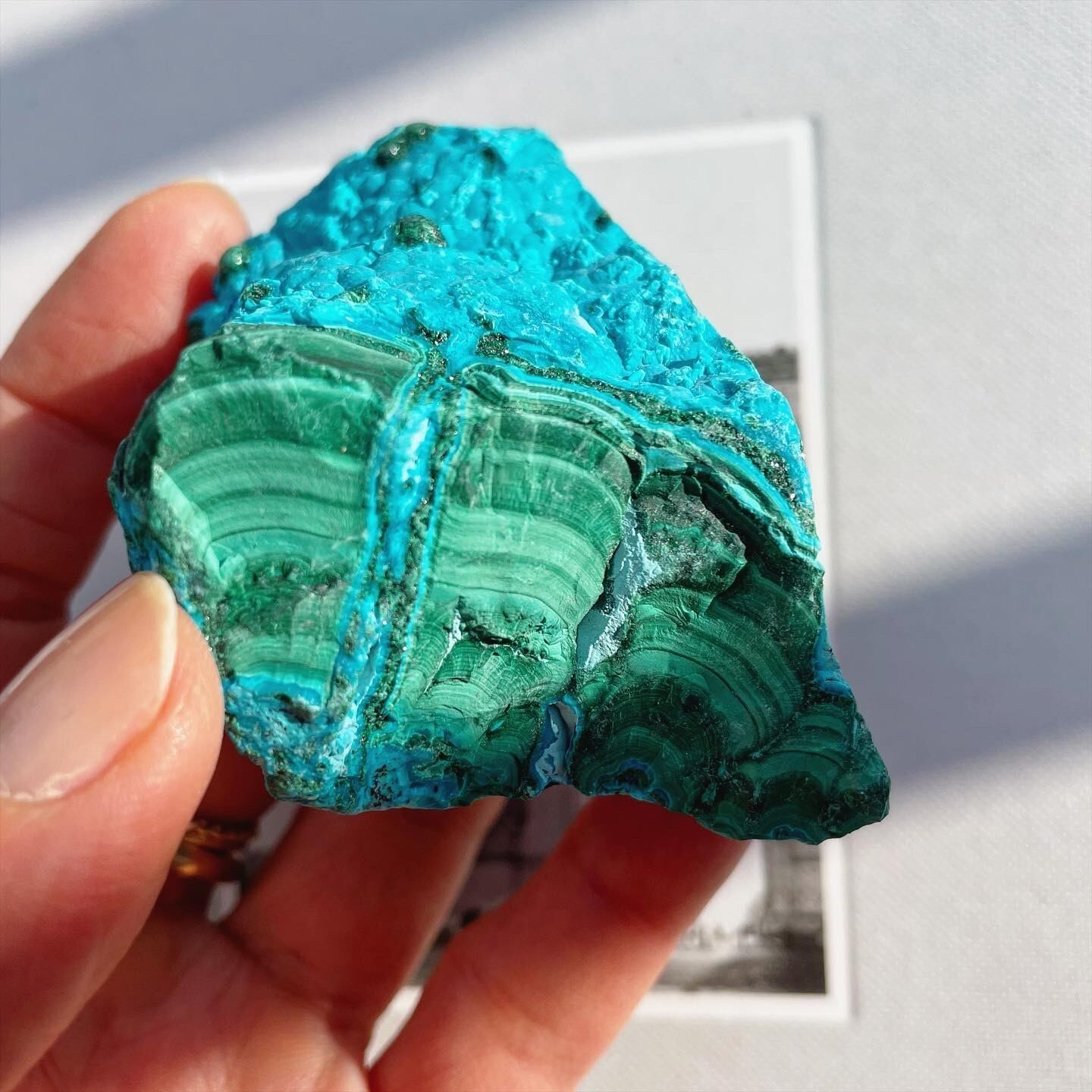 ビビッドなクリソコラのターコイズブルー、マラカイトのグリーンにホワイトが相まって美しい層を形成する、珍しい原石。