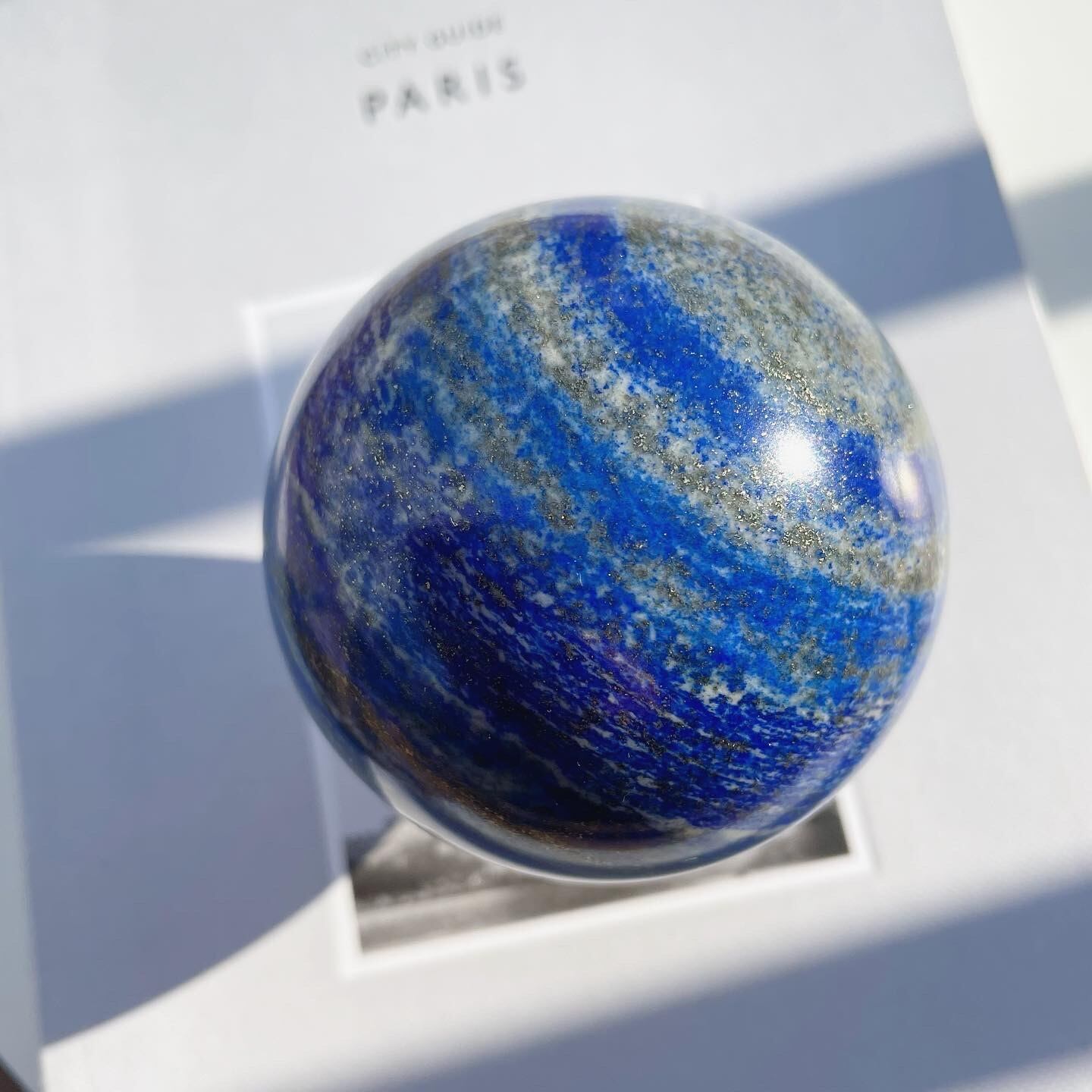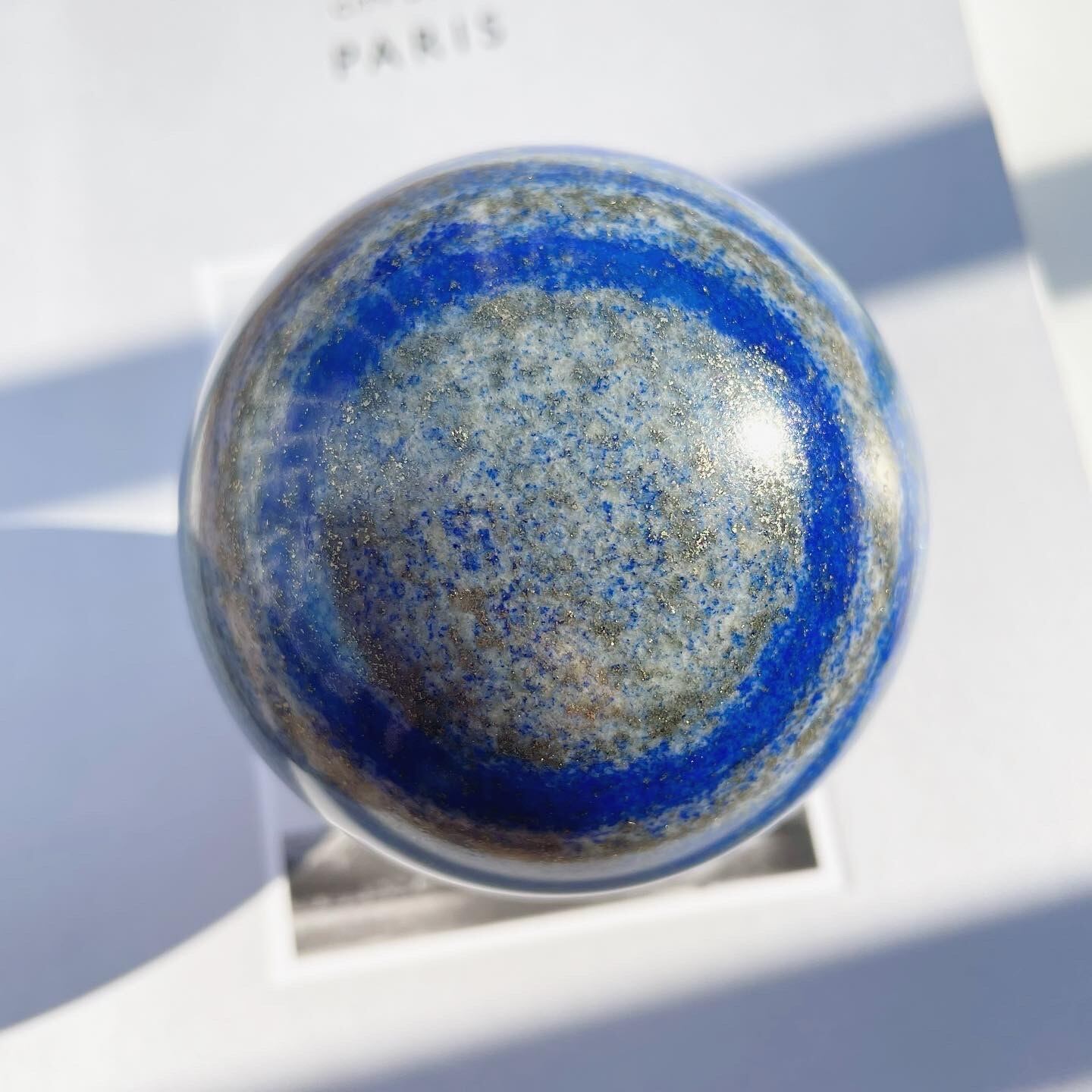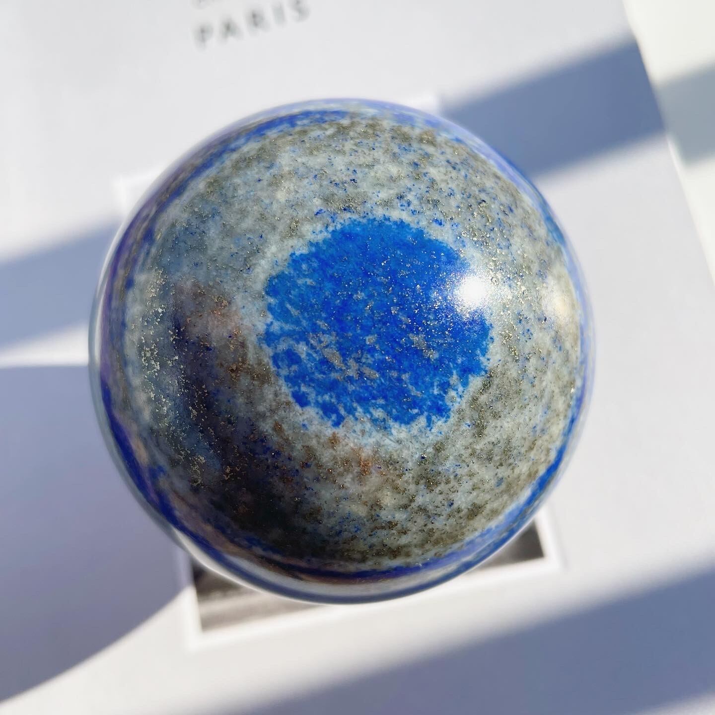鮮やかな発色。深いブルーの中に、ライン上に入るホワイトとパイライトのコントラストが映えるラピスラズリ♡