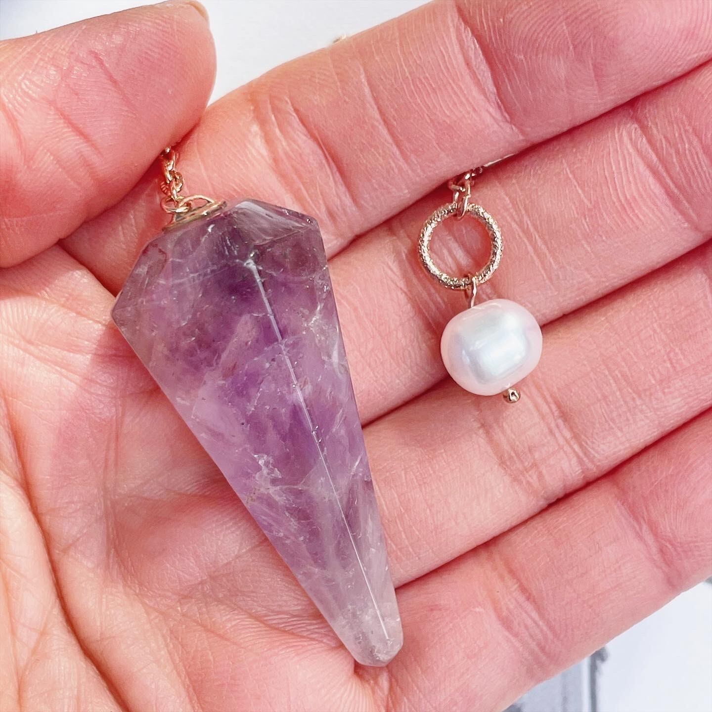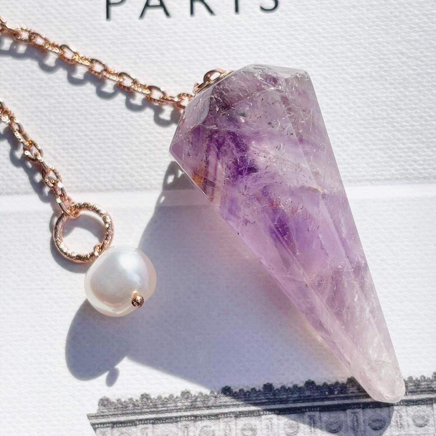 Fluxy特製、ピンクゴールドチェーンと淡水パールチャームがついたペンデュラムを作りました♡