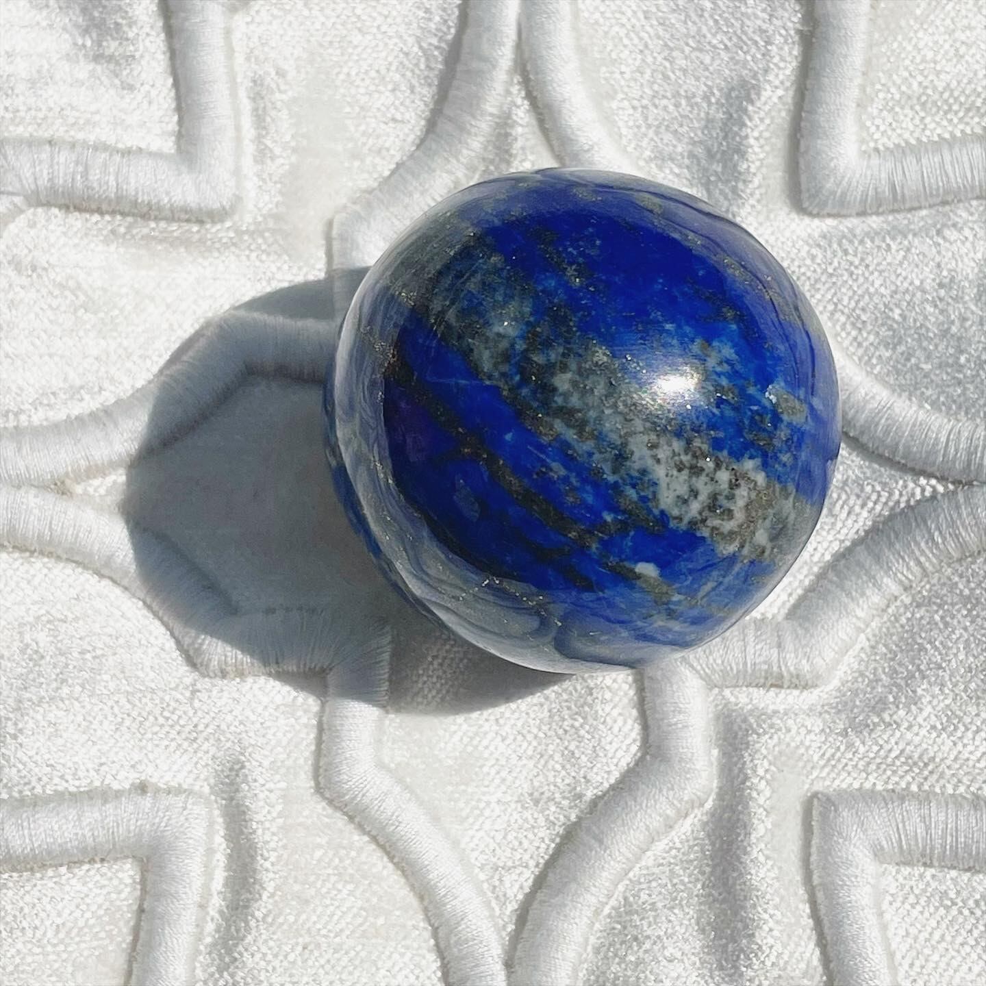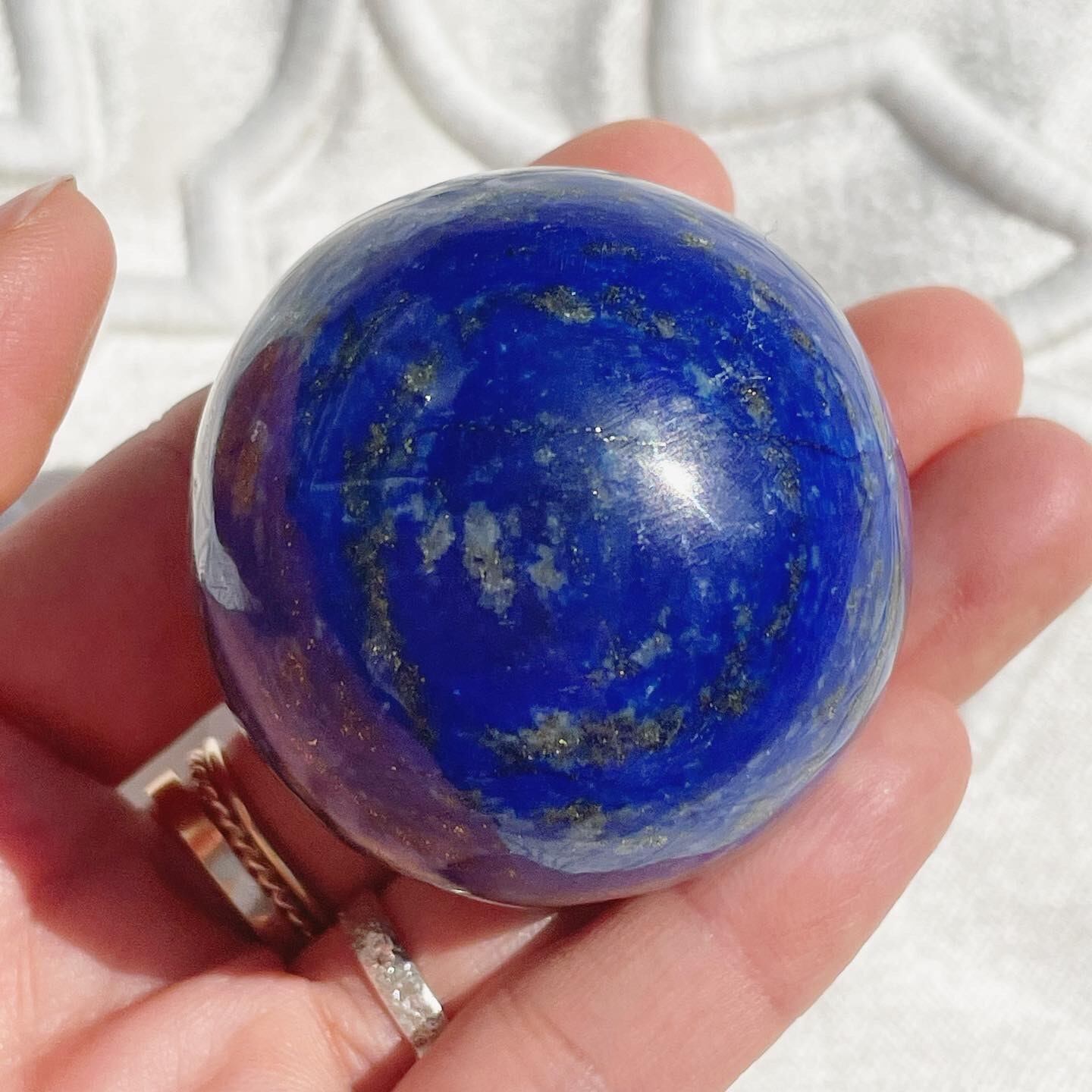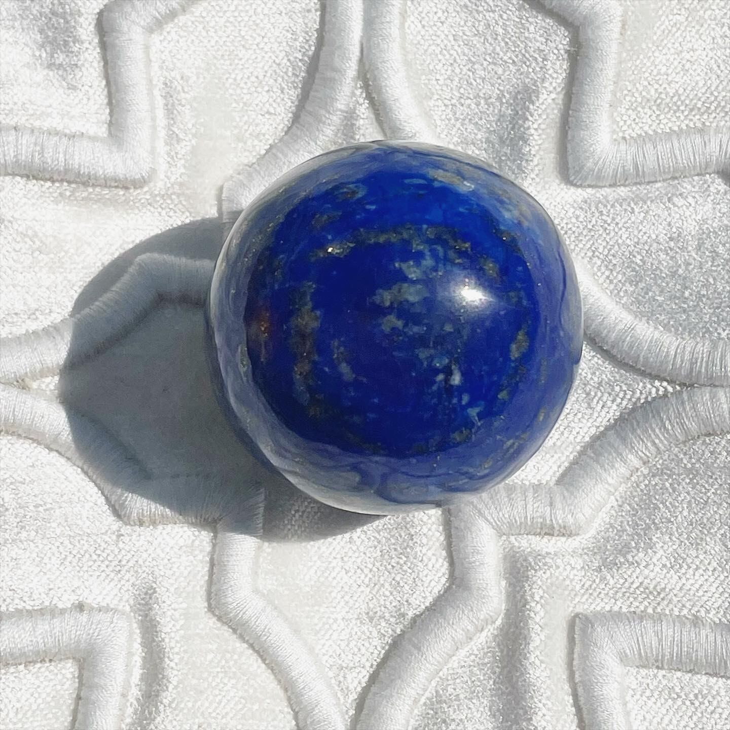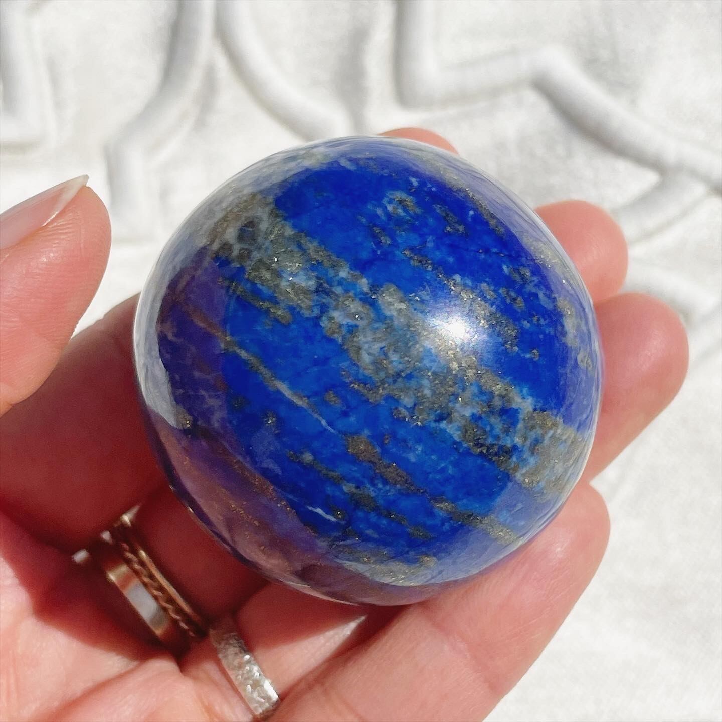 深い群青色の中に、ライン上に入るホワイトとパイライトのコントラストが映えるラピスラズリ。地球に、または天空、宇宙にも見える、深い美しさのあるスフィアです。