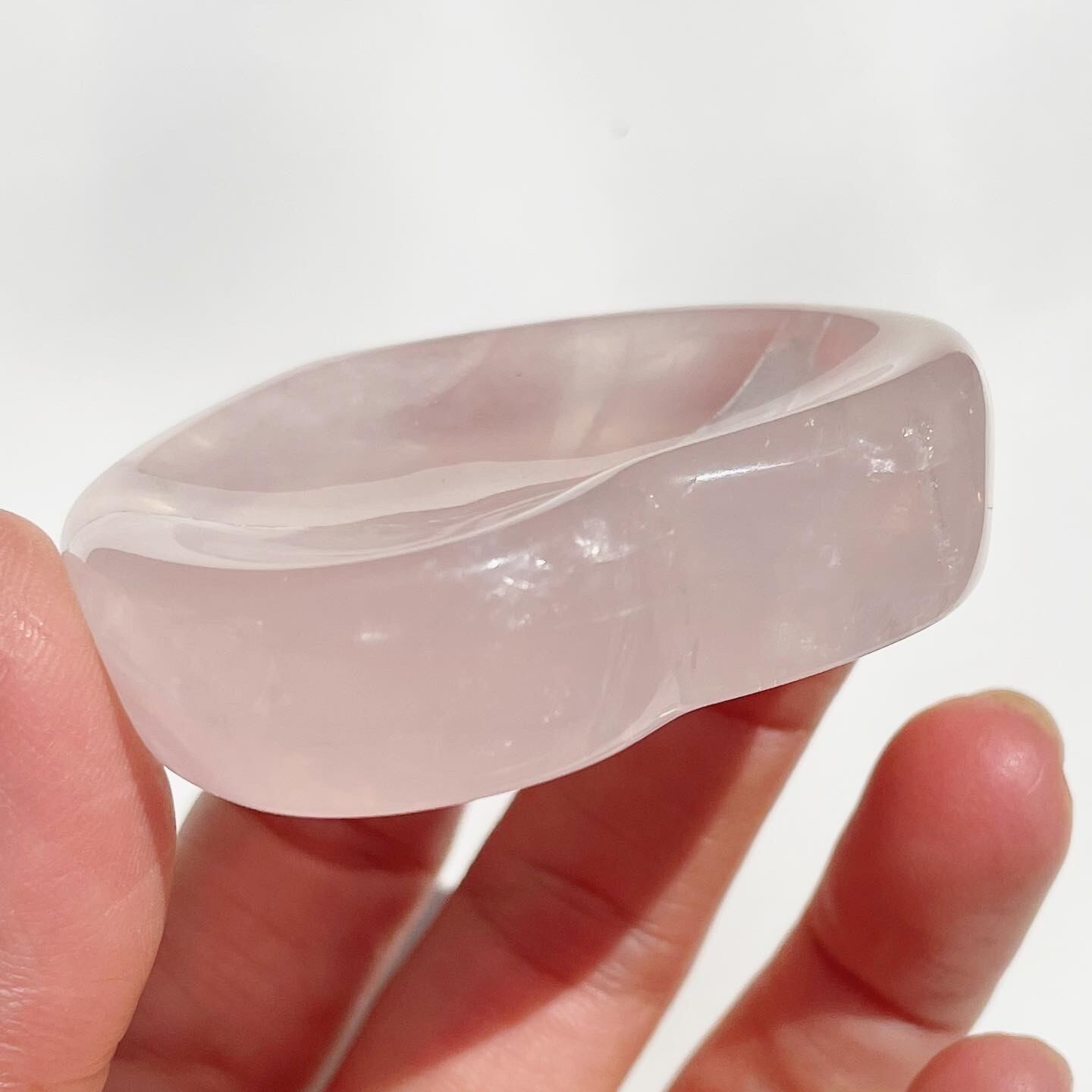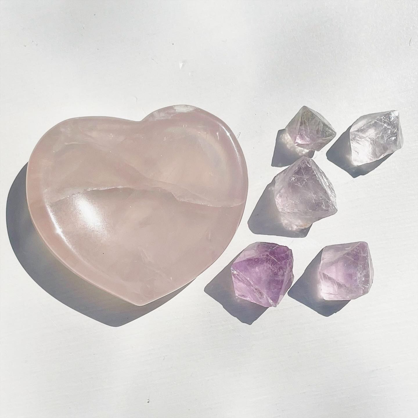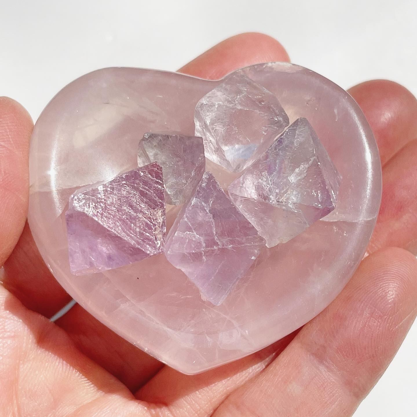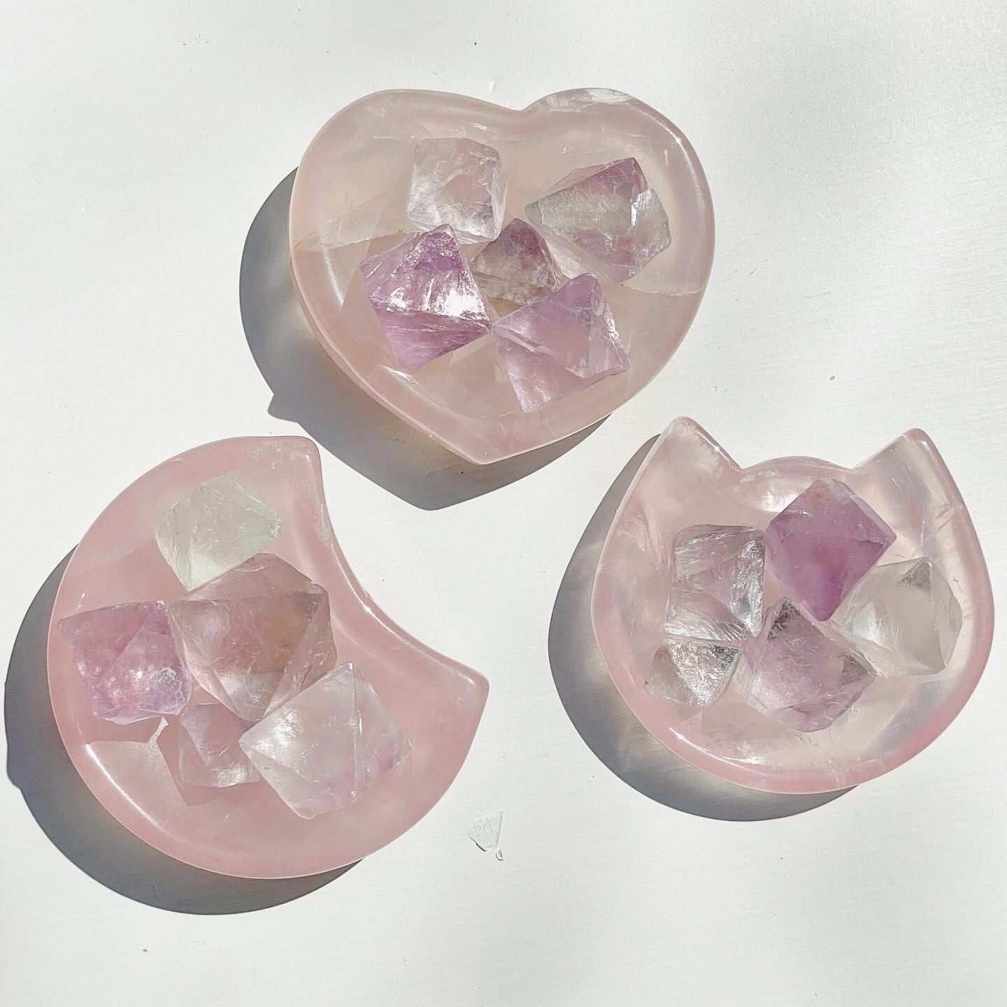 マダガスカル産のローズクオーツのボウルに、キャンディのようなマルチカラーのフローライトの八面体結晶を載せました♡フローライトの結晶は5つ入ります。