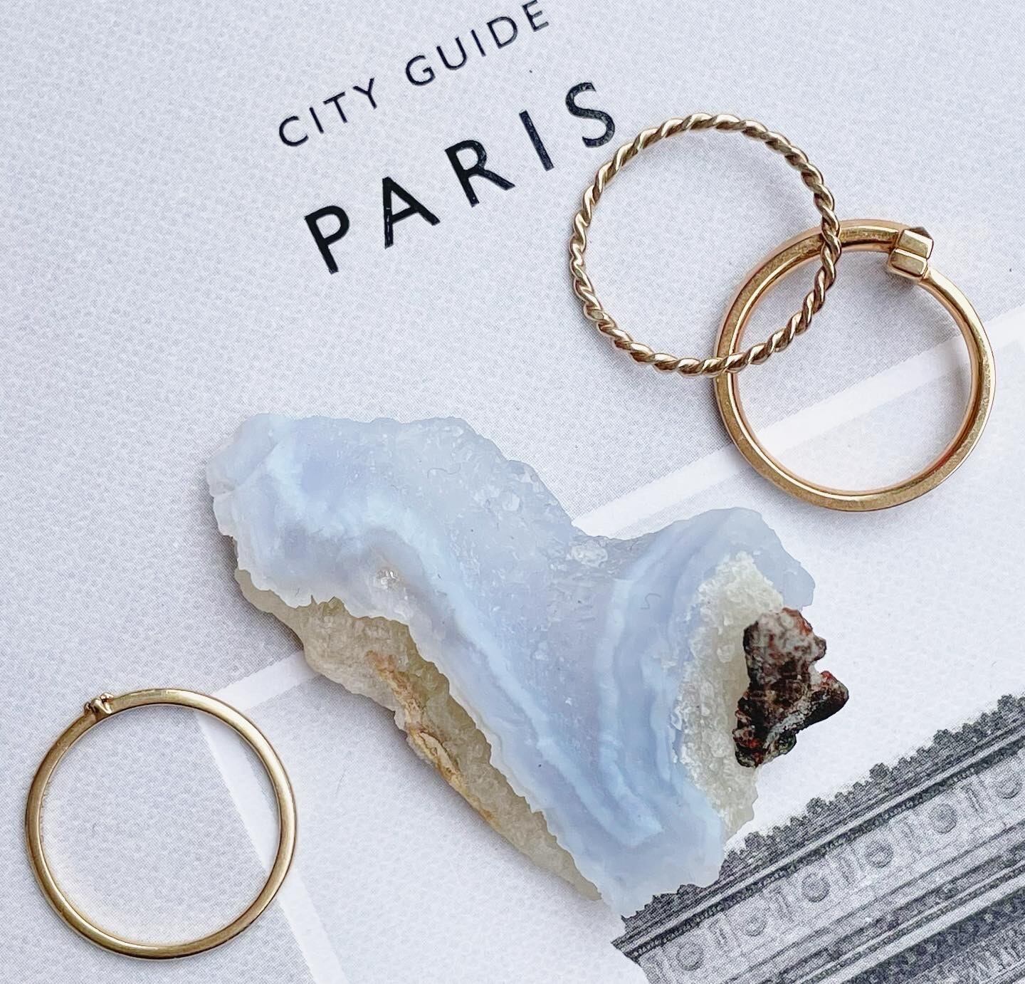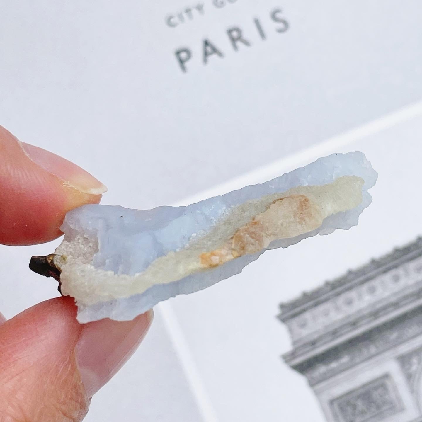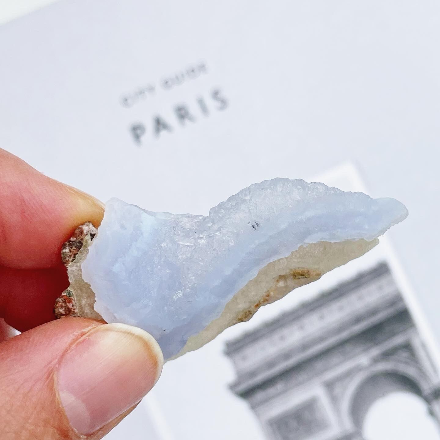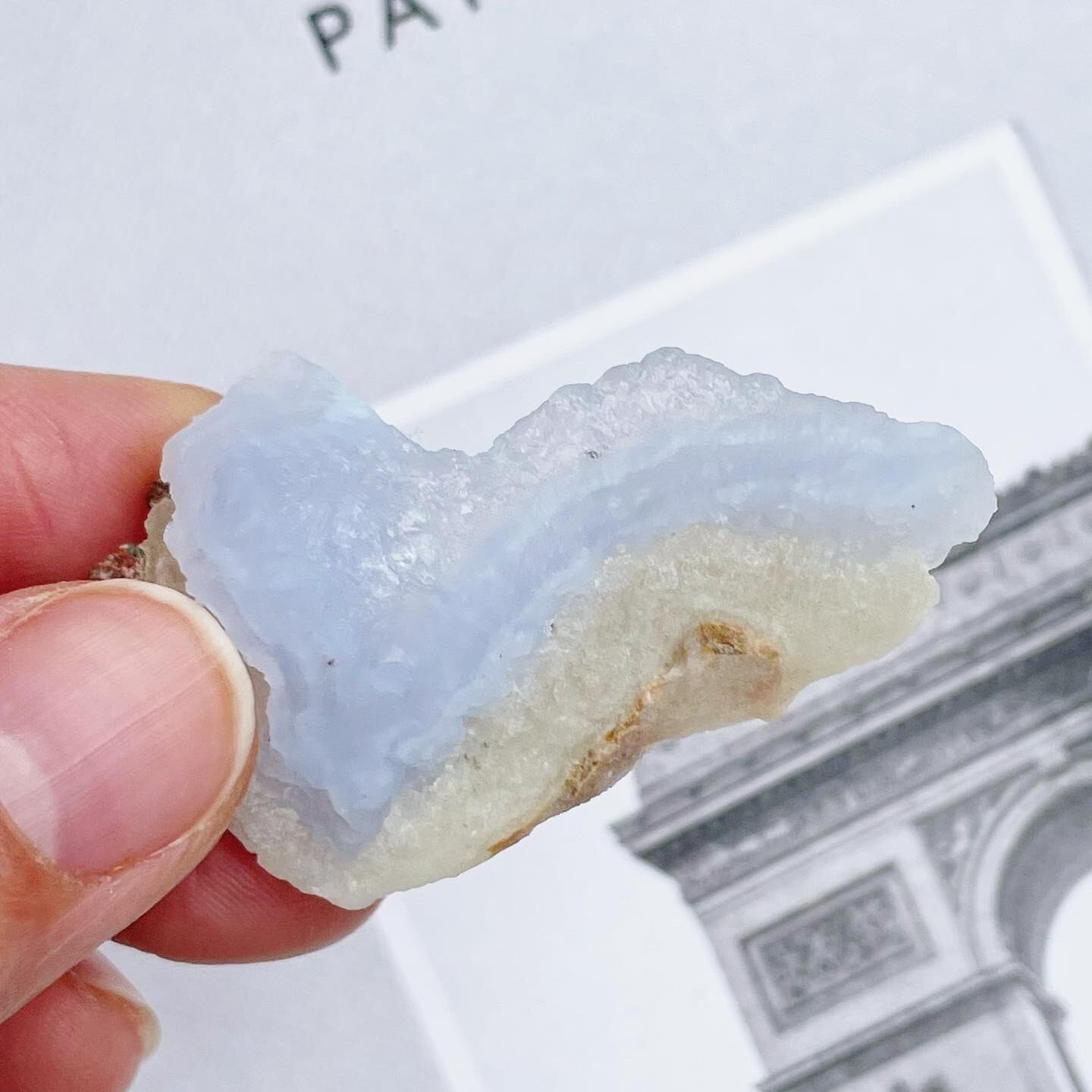 柔らかい薄群青色に、レースのように見える白い模様が入る瑪瑙です。