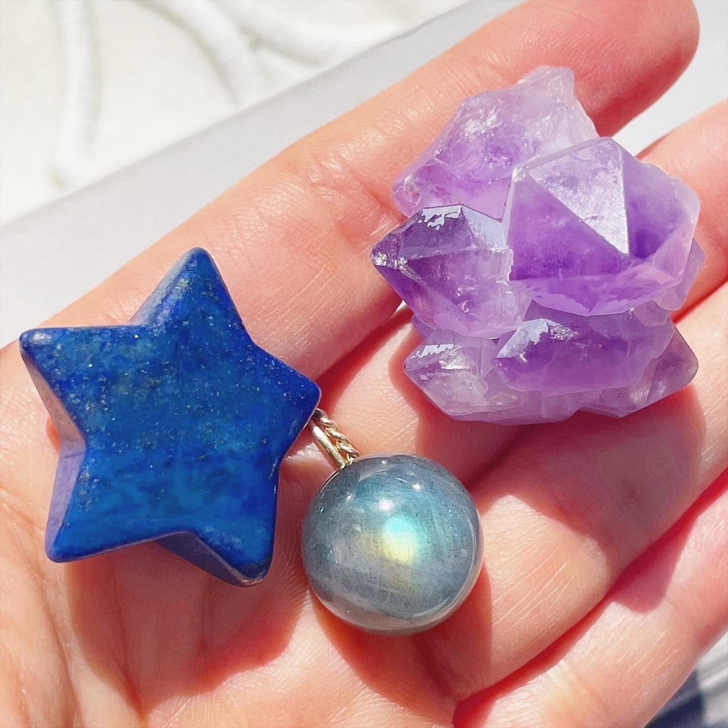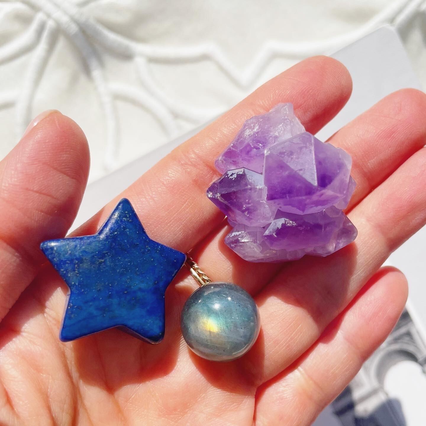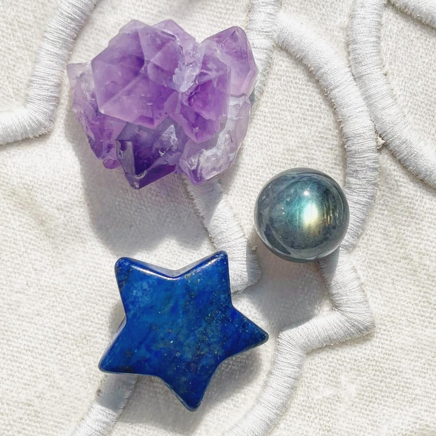 アメシストのクラスター、ラピスラズリのスター、しっかりとシラーが光るラブラドライトのスフィアを集めました。