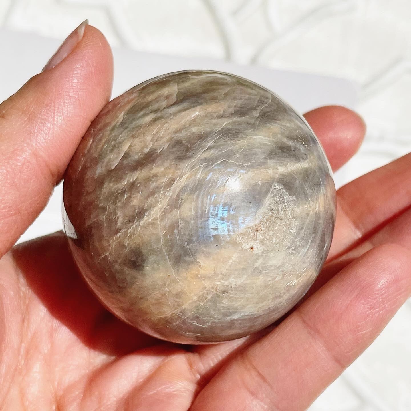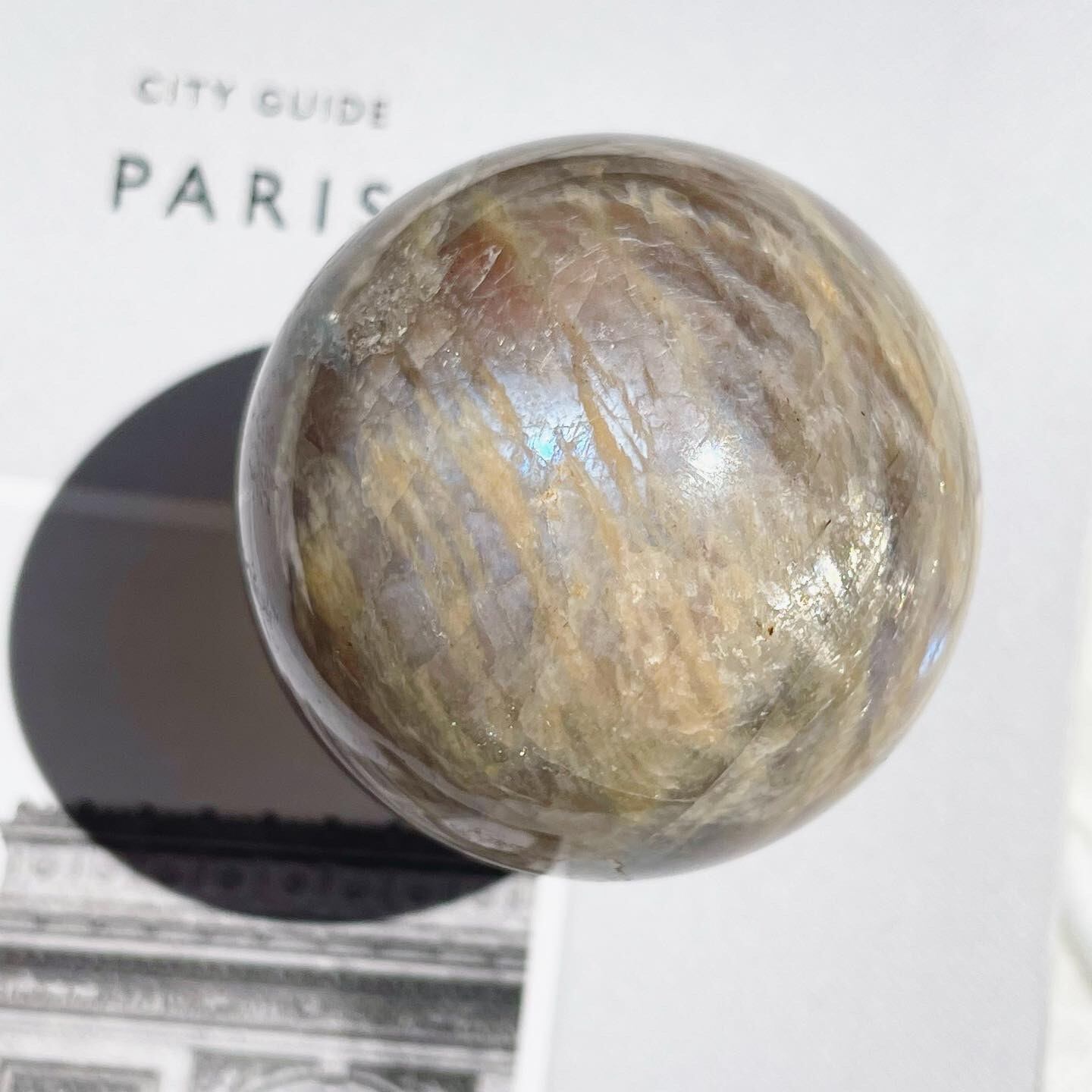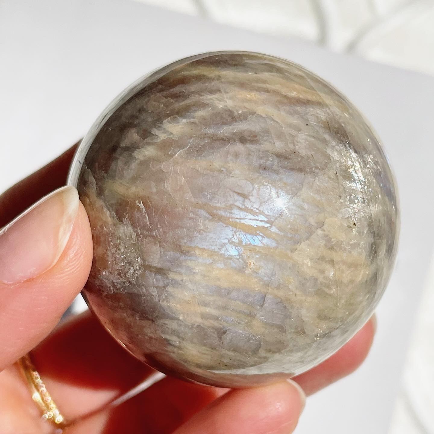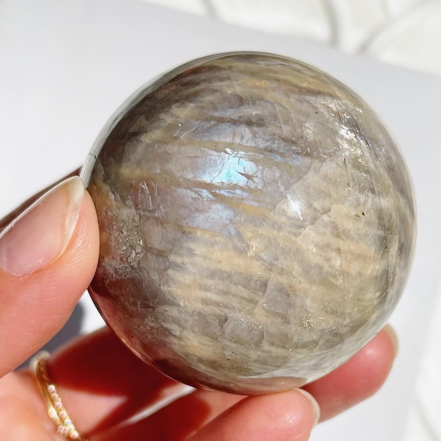 サンストーンの特徴である、シャンパンゴールド色に煌めくアベンチュレッセンス効果と、ムーンストーンに特徴的な、静かな光・青色のイリデッセンス効果、このふたつを併せ持つ、神秘的なストーンです♡