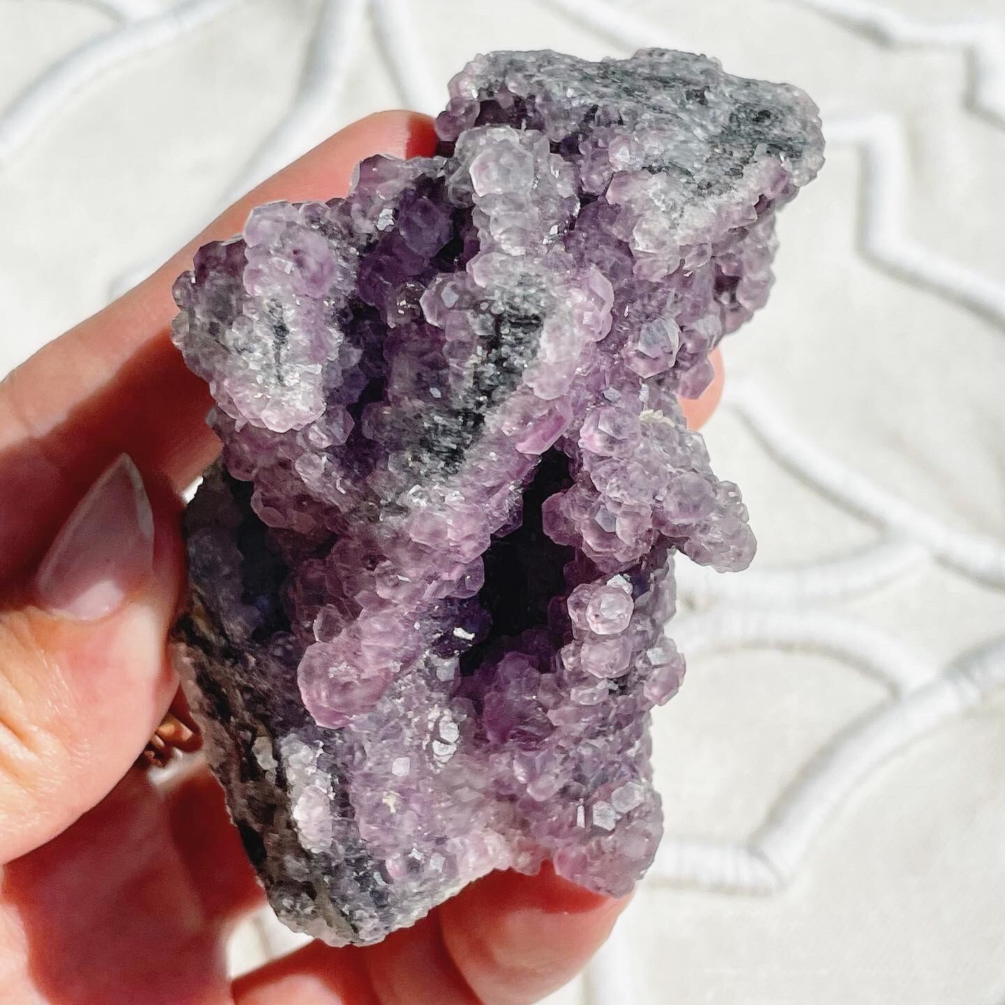 六角形の面で構成されるジェム(宝石)のようなピンクの結晶が、母岩を覆うように形成されています。裏側はクリアカラーのドゥルージーのような結晶が煌めきます。