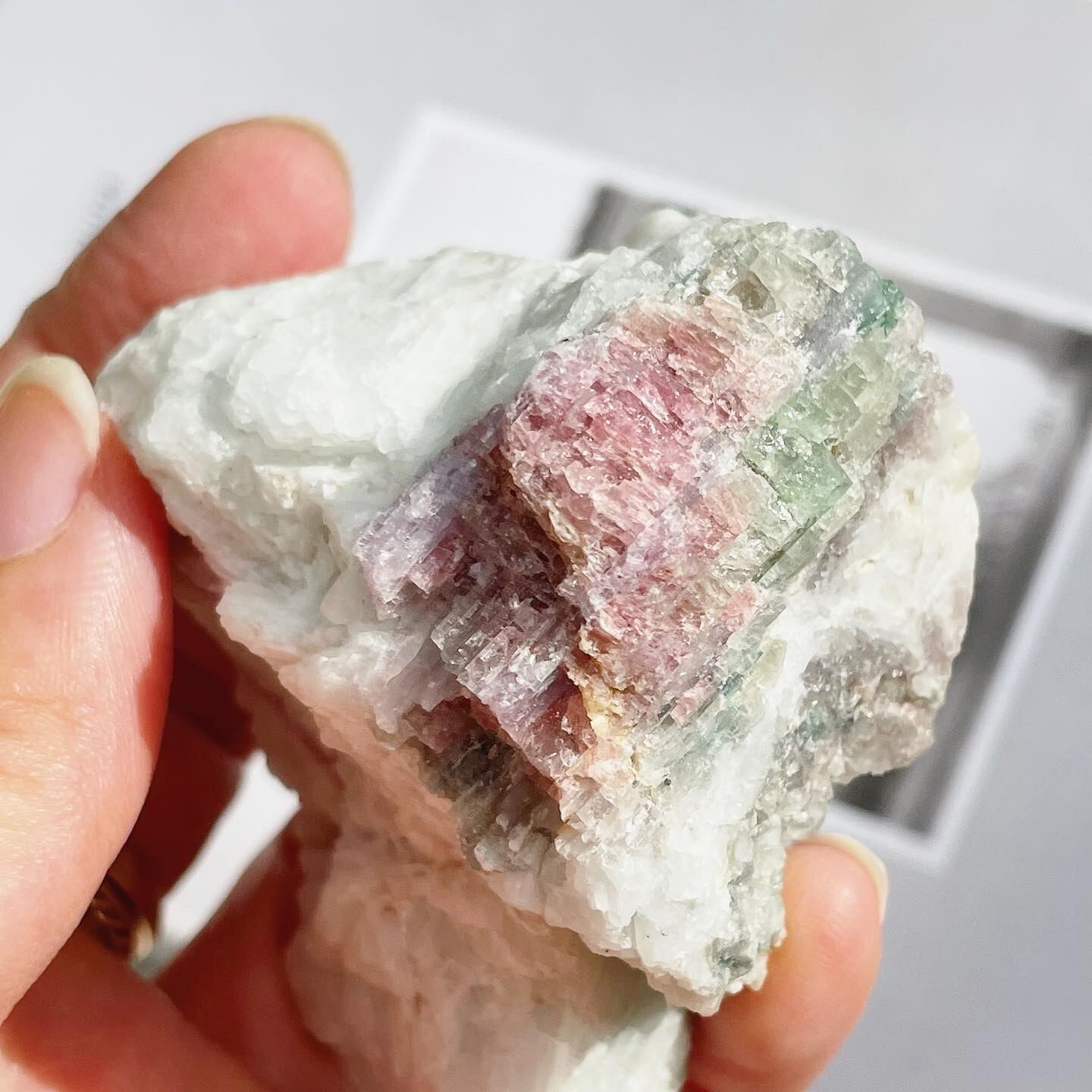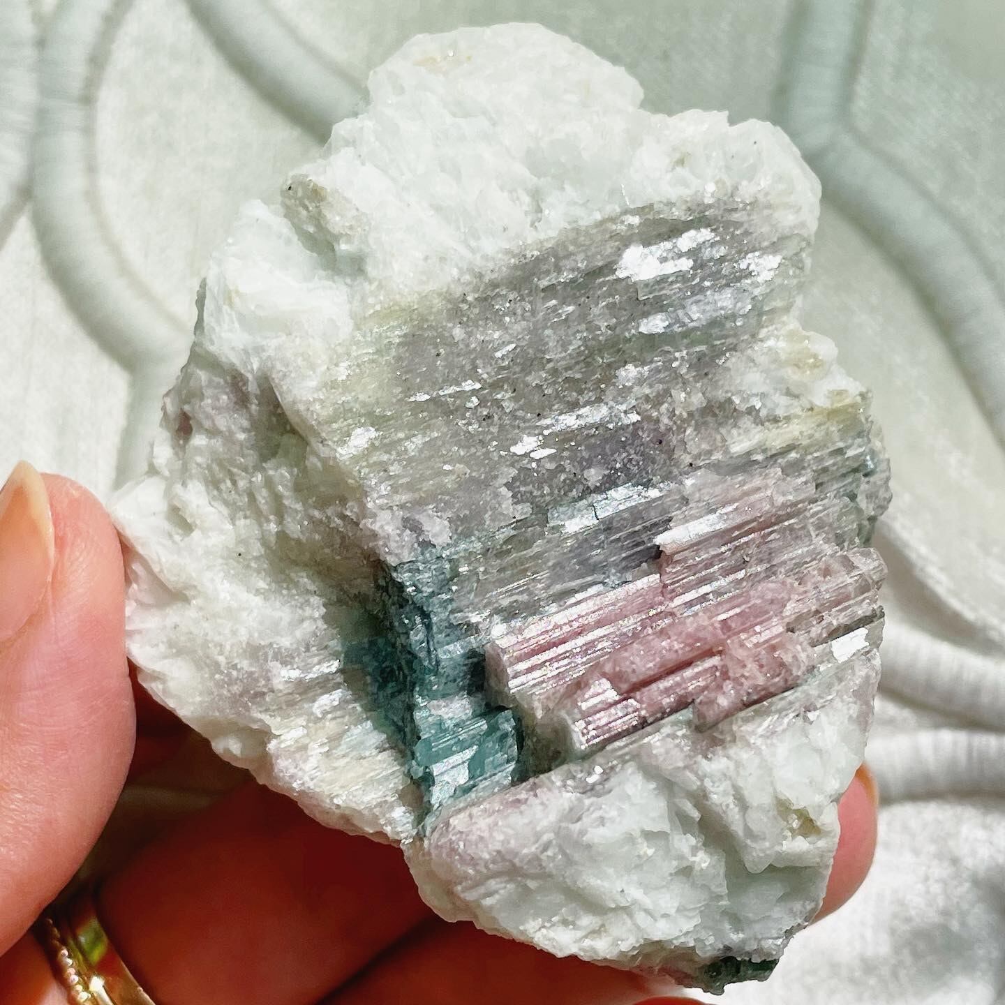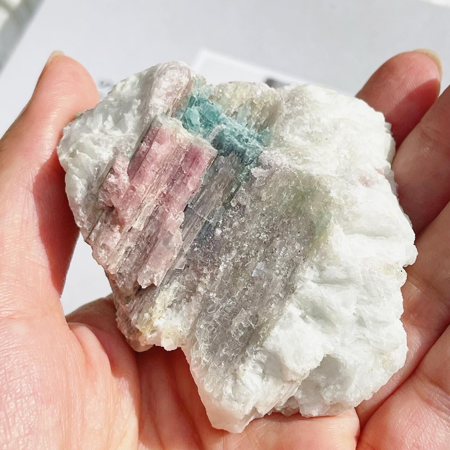 ピンクとブルー寄りのグリーンの発色もよく、結晶が縦のラインに向かって煌めきます。
