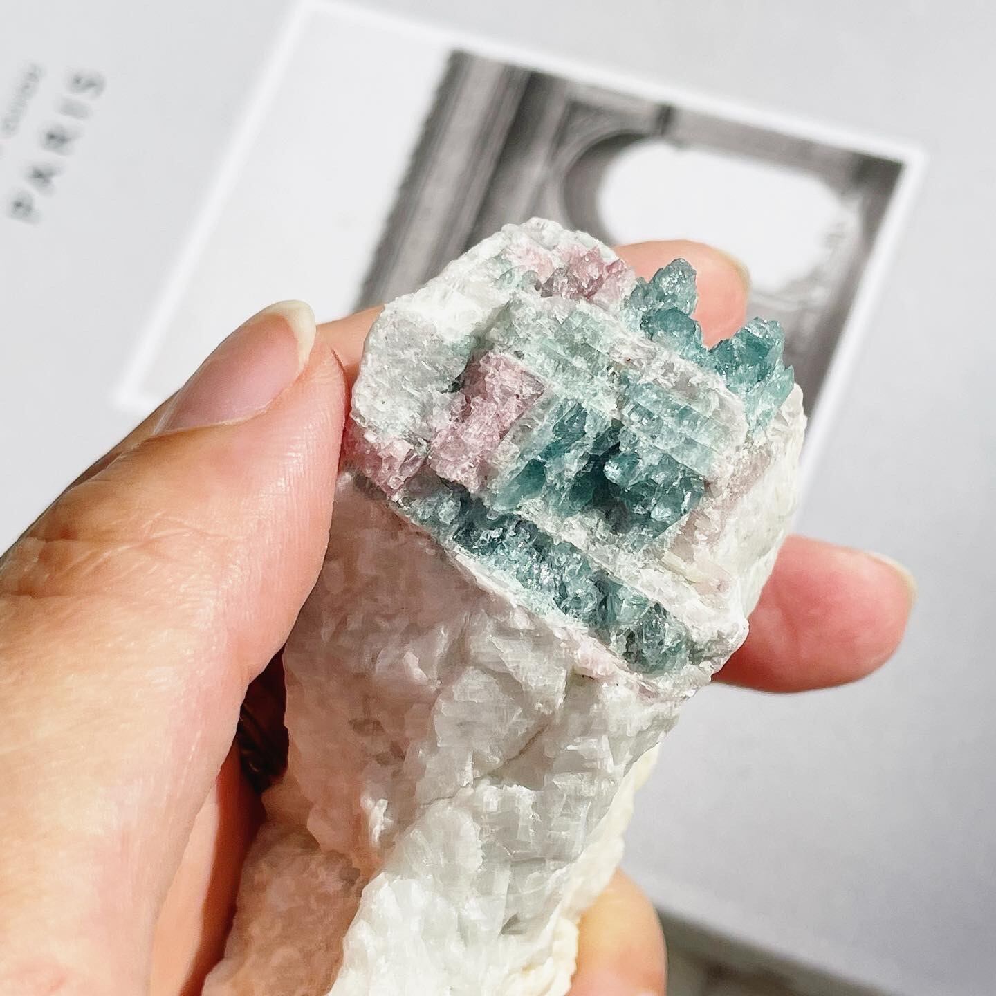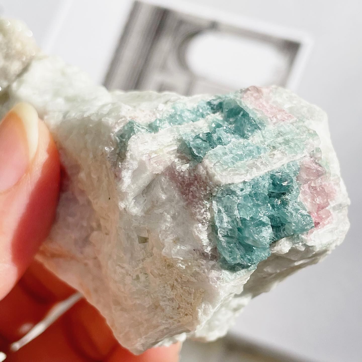 ピンクとブルー寄りのグリーンの発色もよく、母岩がラメのように光る部分もあります。