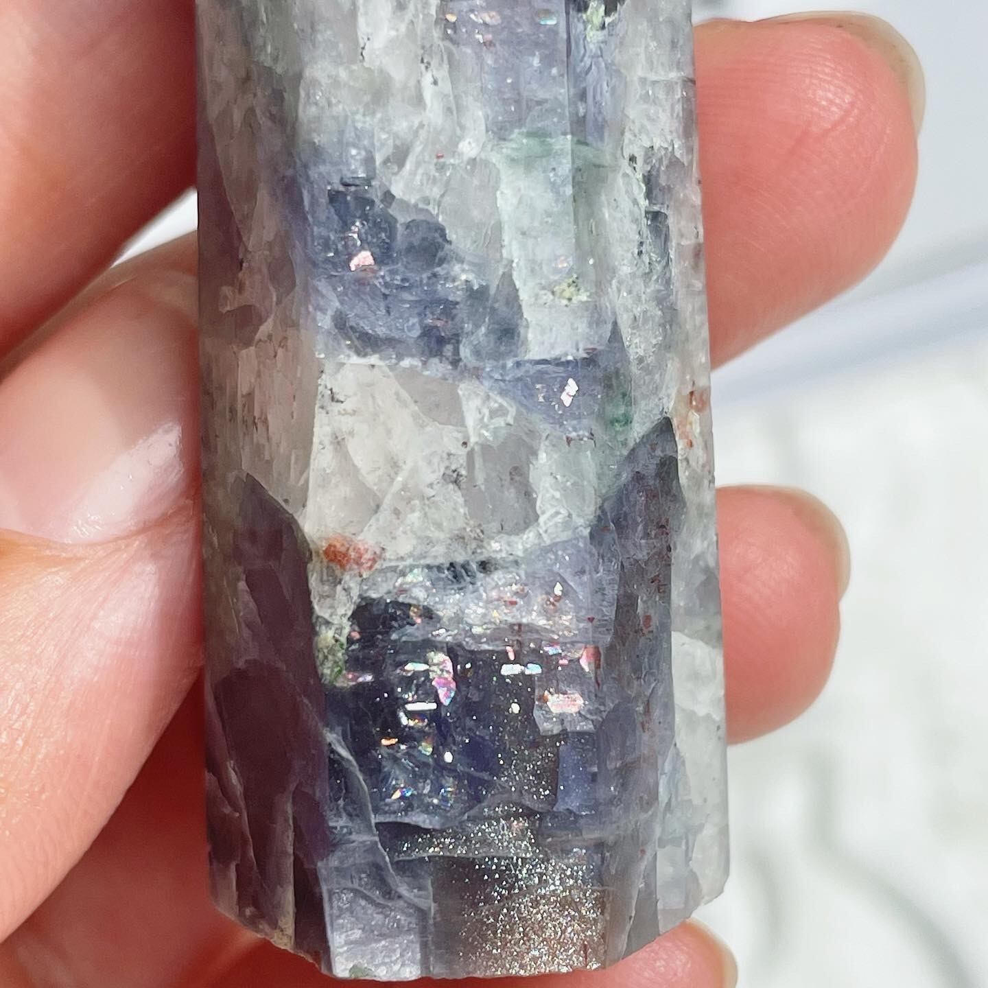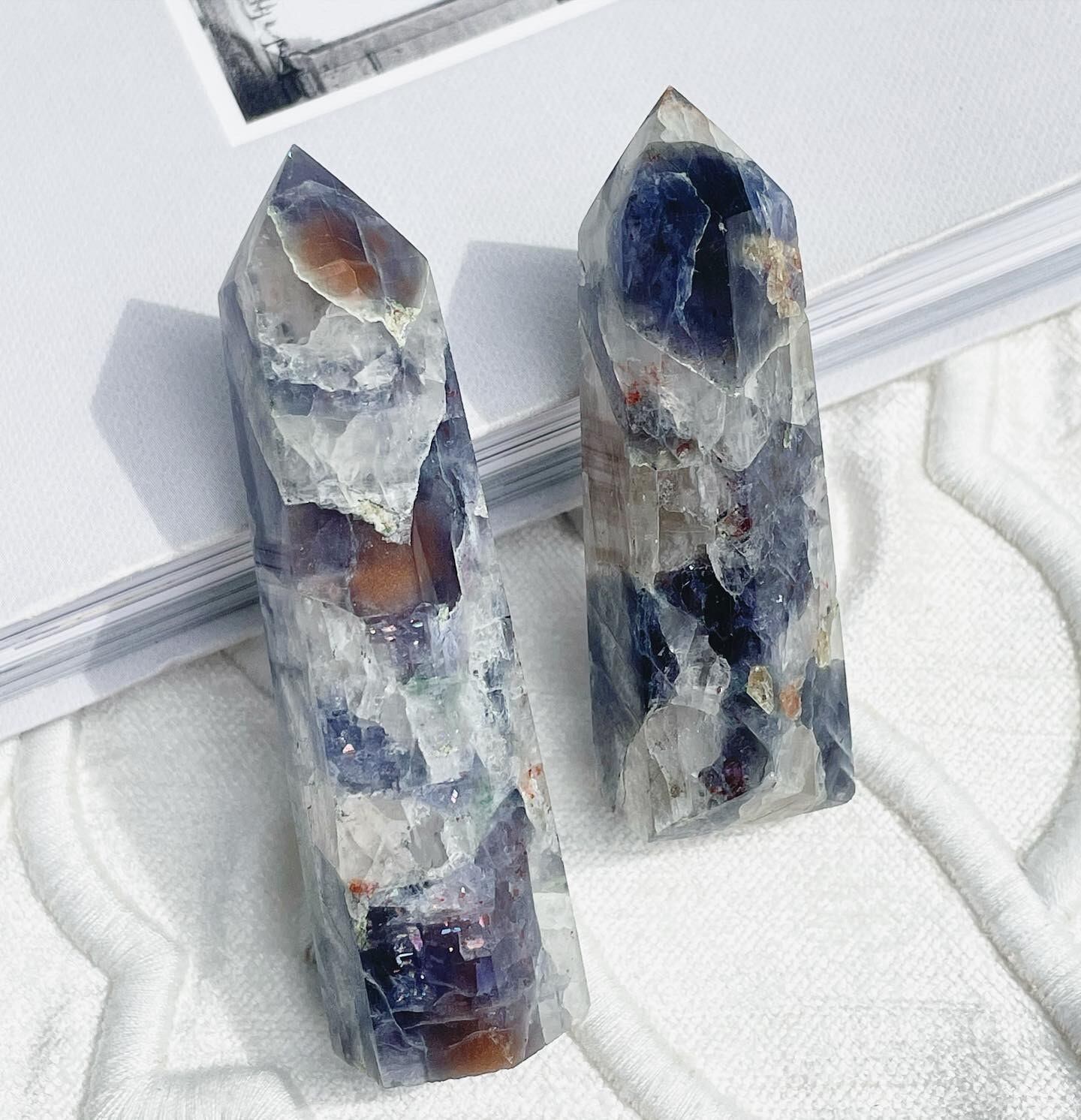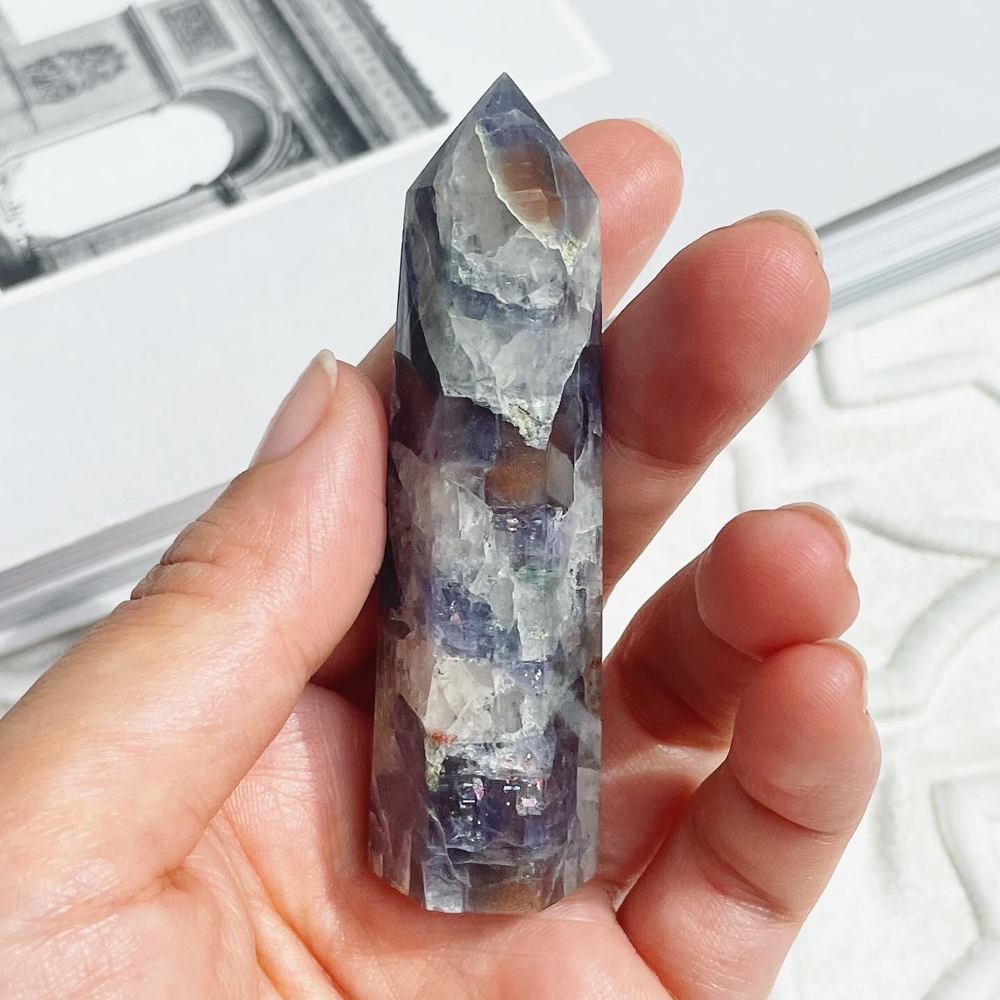 天然のクラックがはいるクォーツに、アイオライトが美しくはめ込まれたような、ステンドグラスやモザイク画を思わせるポイントです。