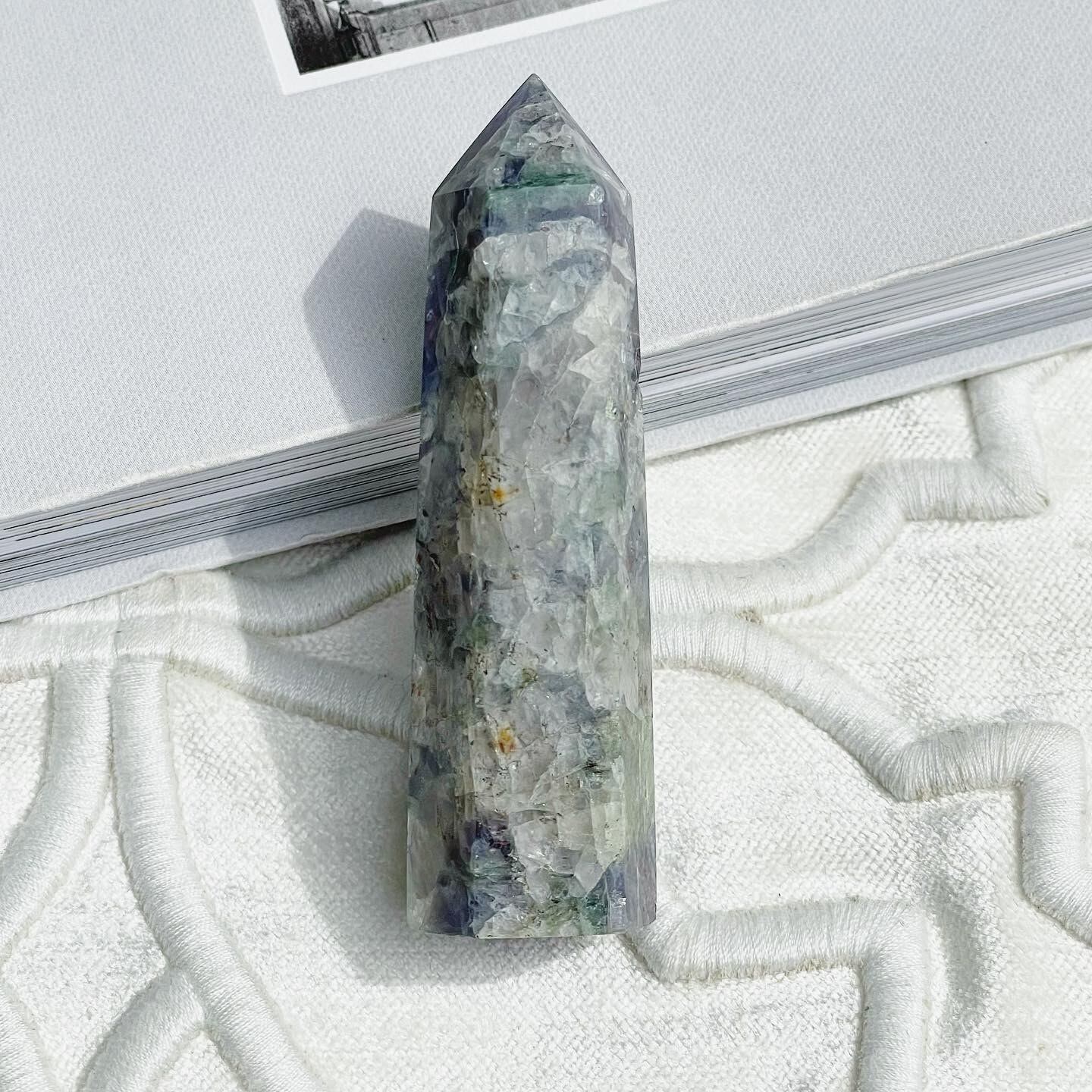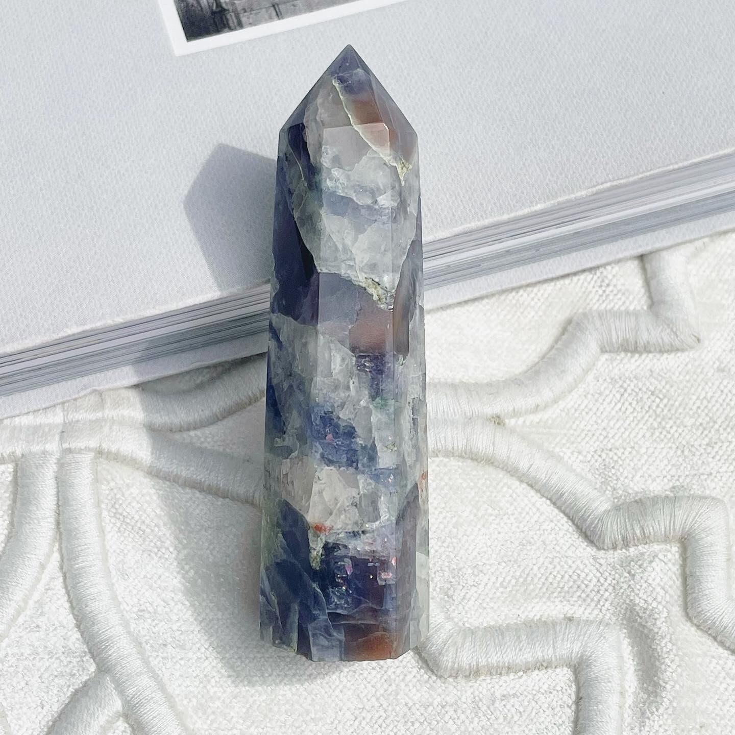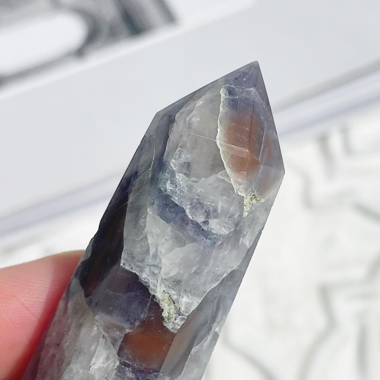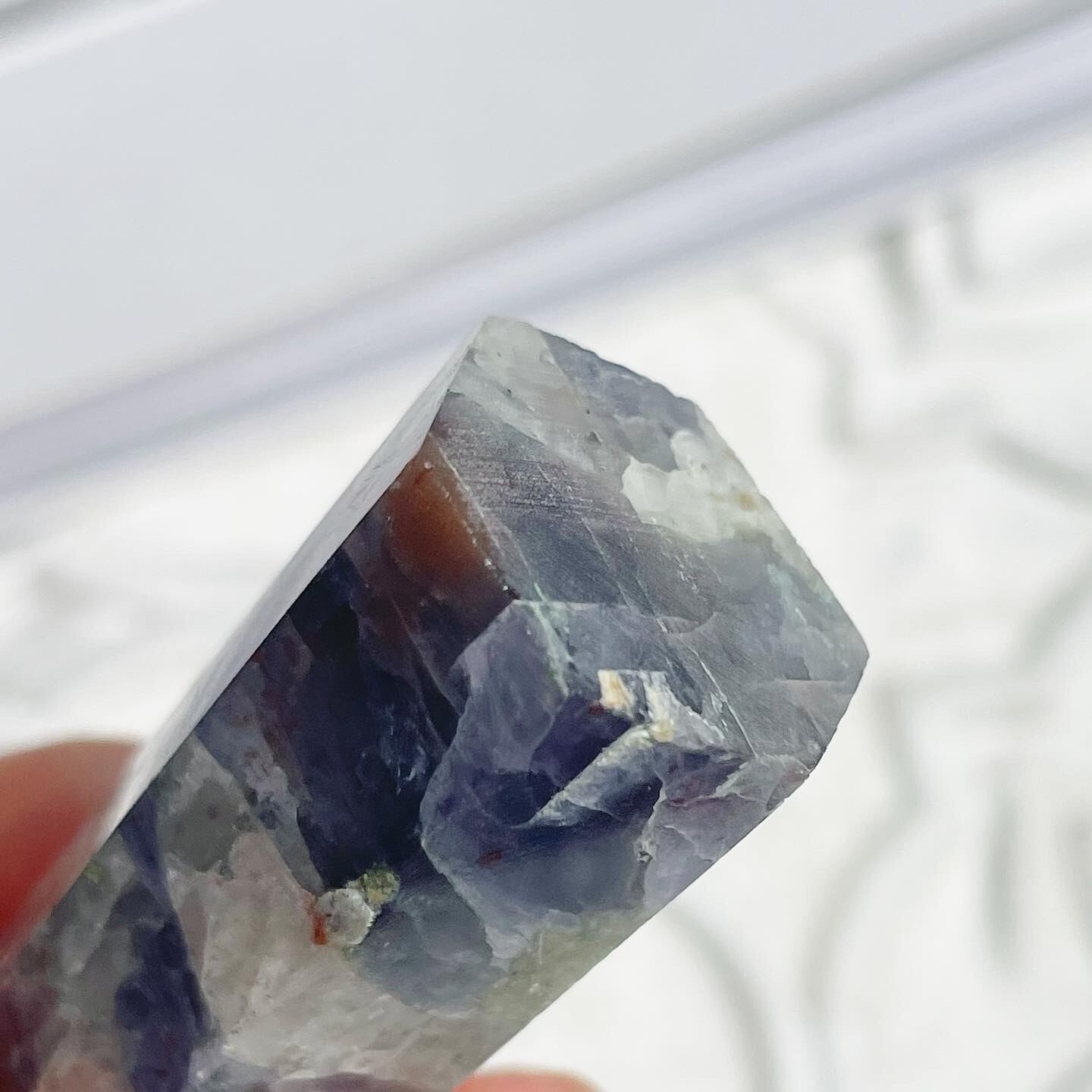 天然のクラックがはいるクォーツに、アイオライトが美しくはめ込まれたような、ステンドグラスやモザイク画を思わせるポイントです。