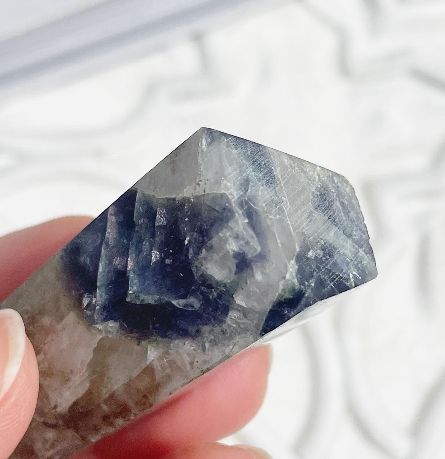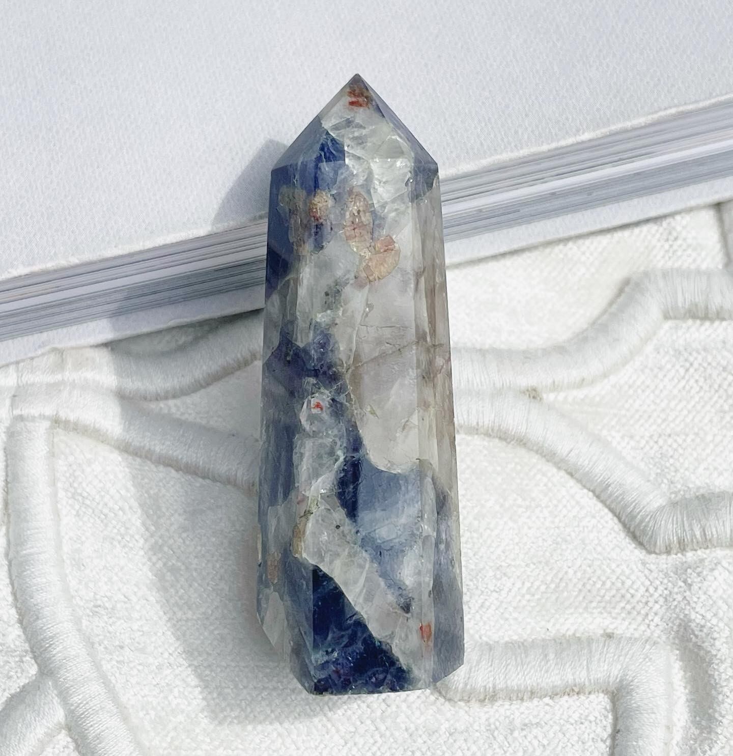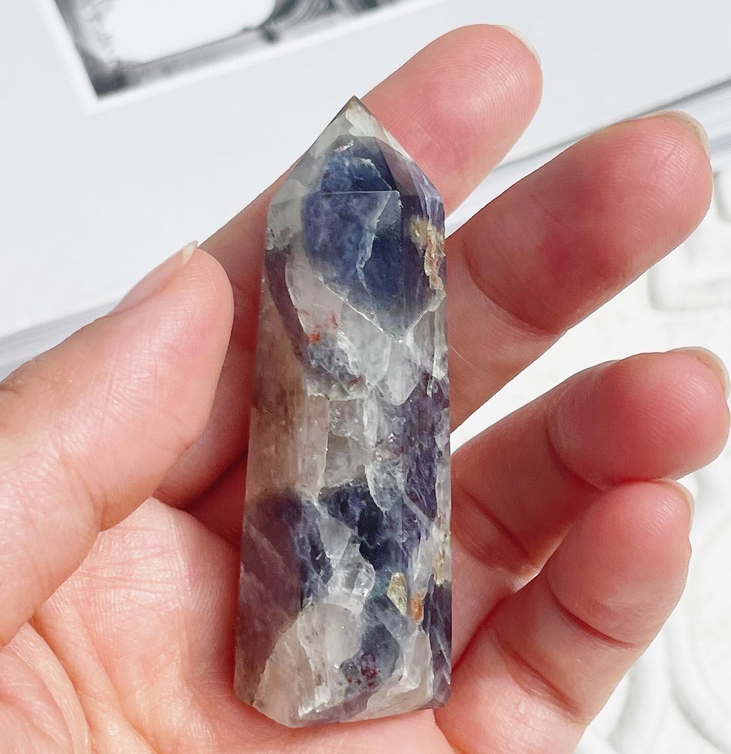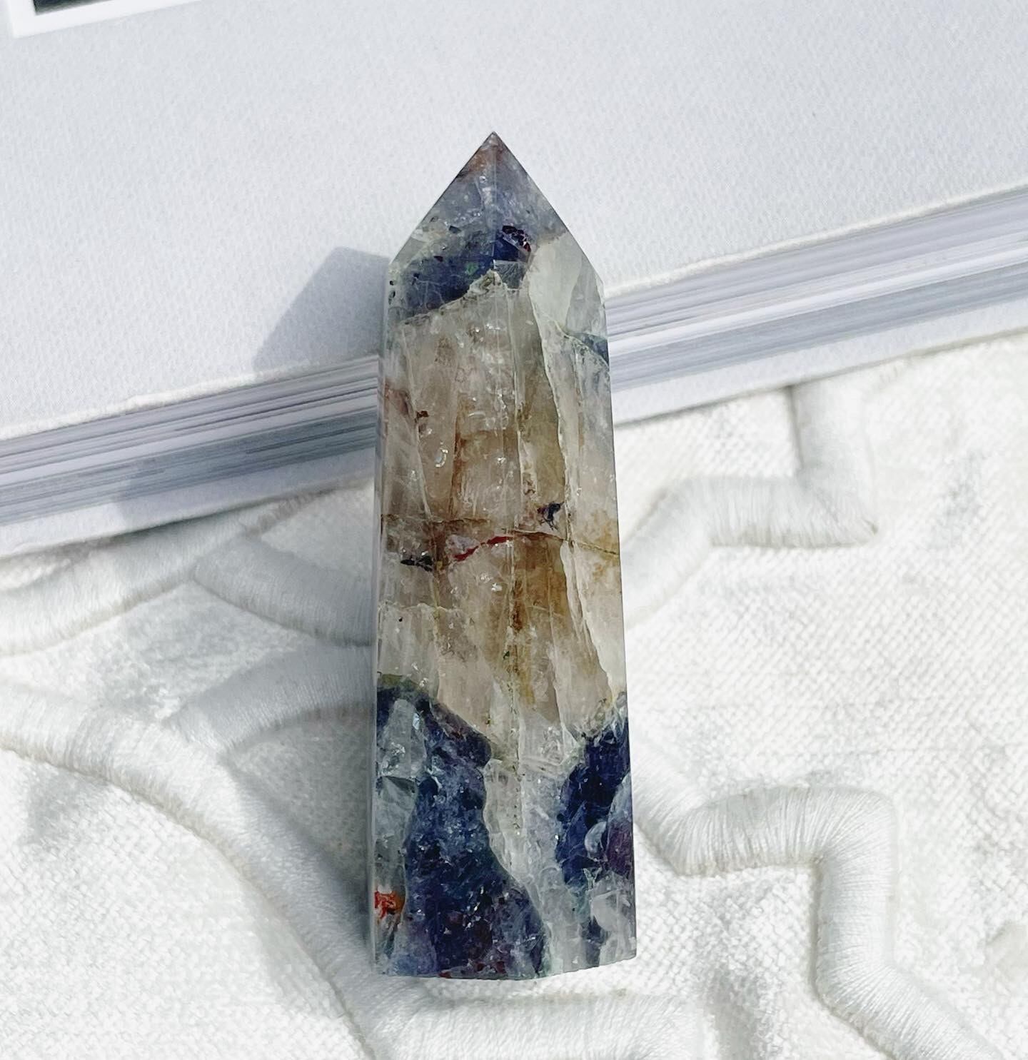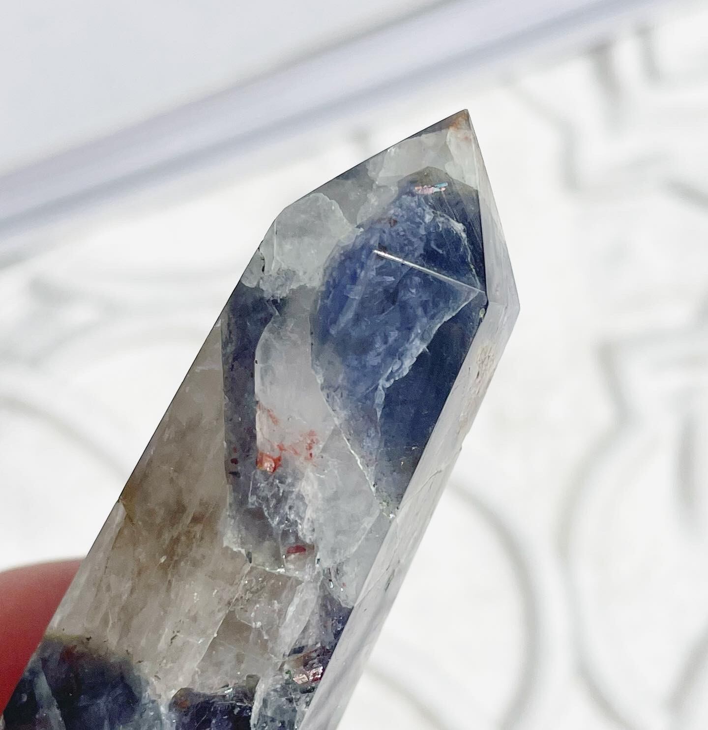 天然のクラックがはいるクォーツに、アイオライトが美しくはめ込まれたような、ステンドグラスやモザイク画を思わせるポイントです。