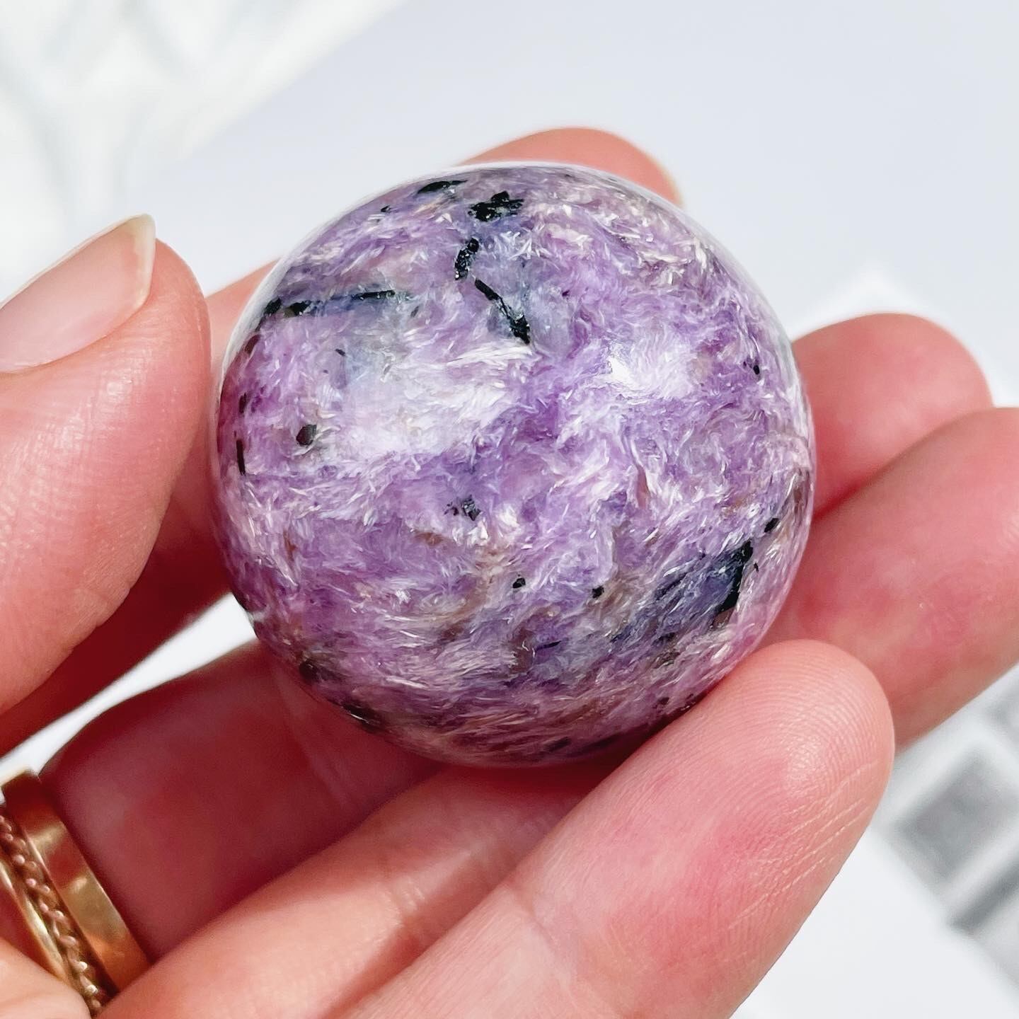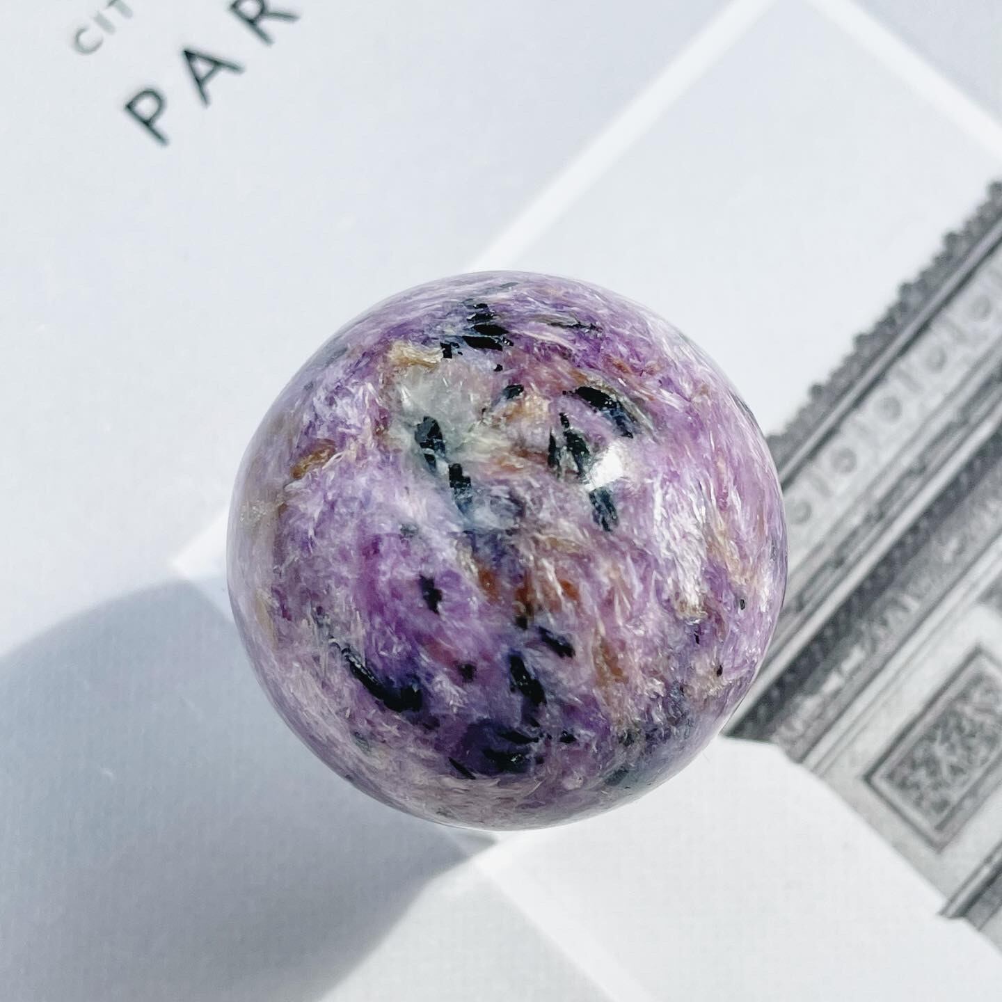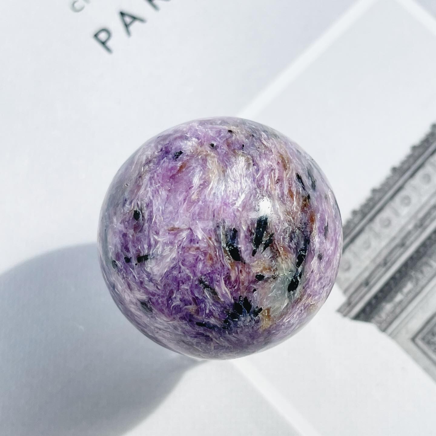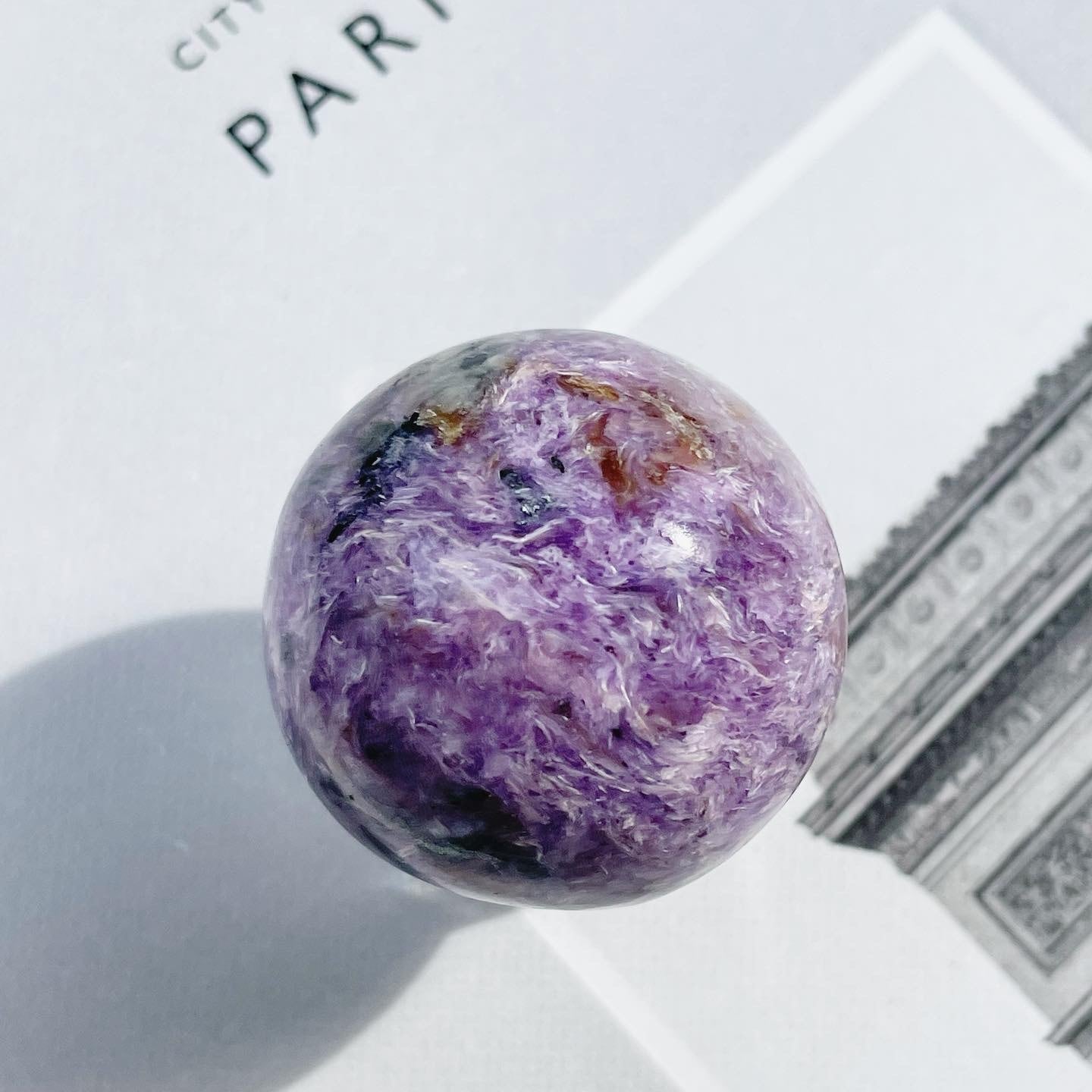 淡いライラックパープルの部分の、シルクのような光沢もチャロアイトの特徴。
