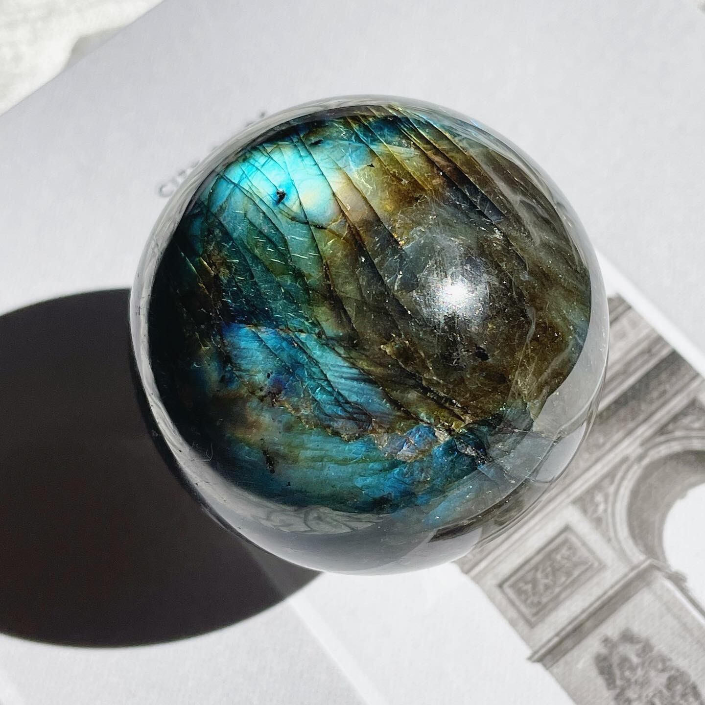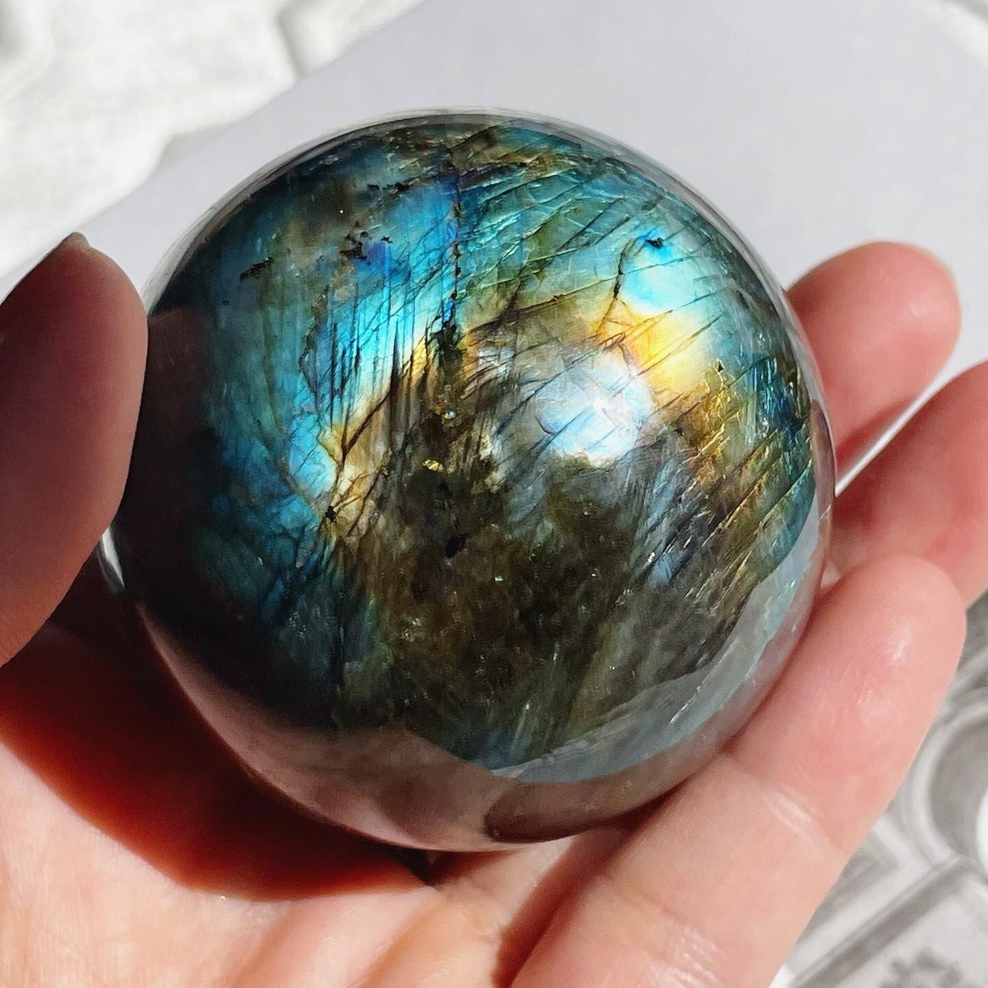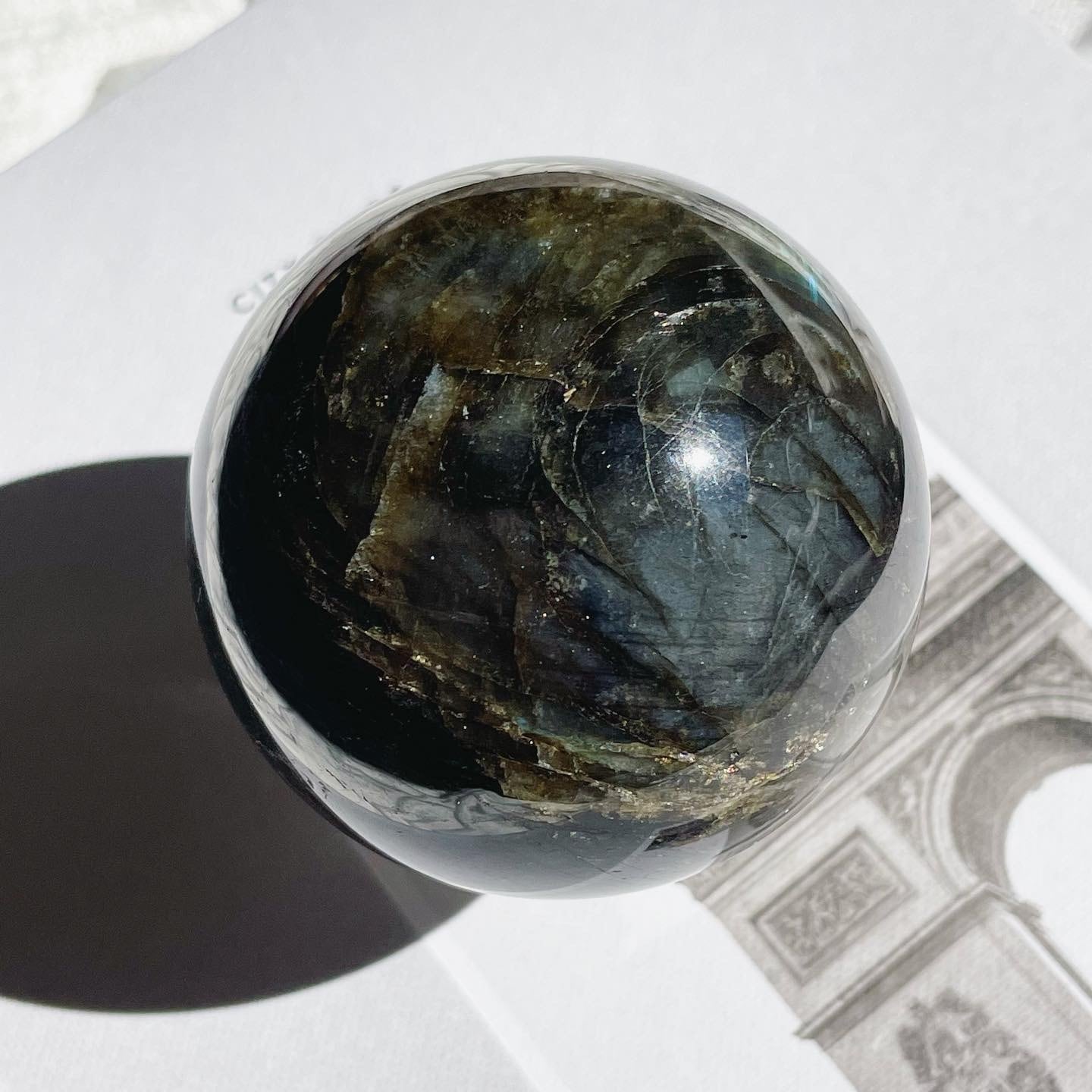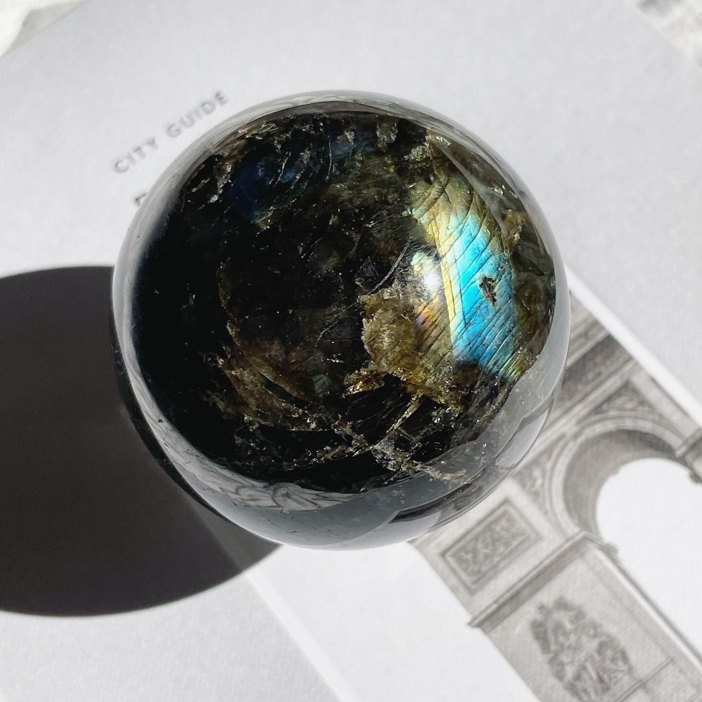 ダークグレイに青とゴールドのシラーが美しく入る、神秘的で新月のようなスフィア。