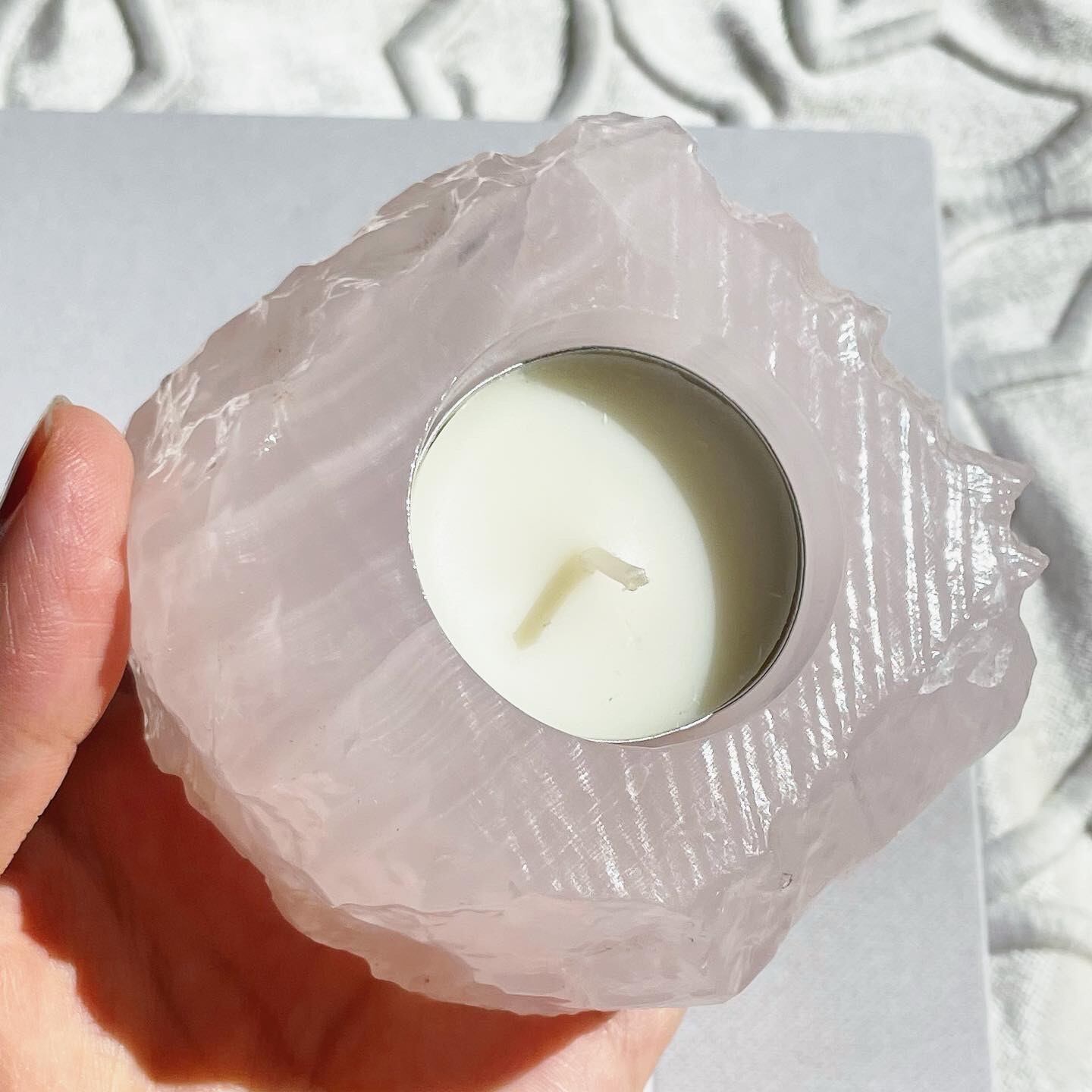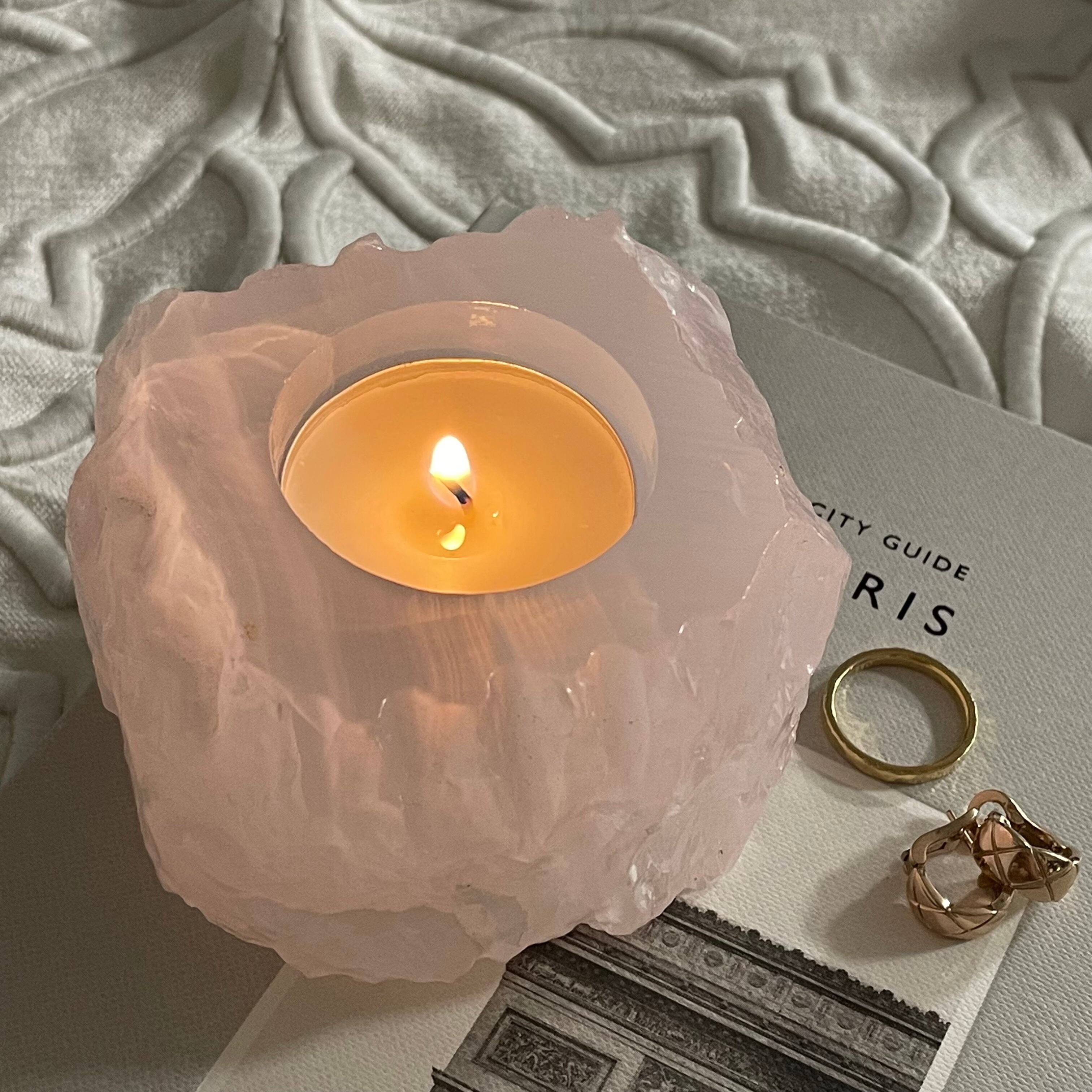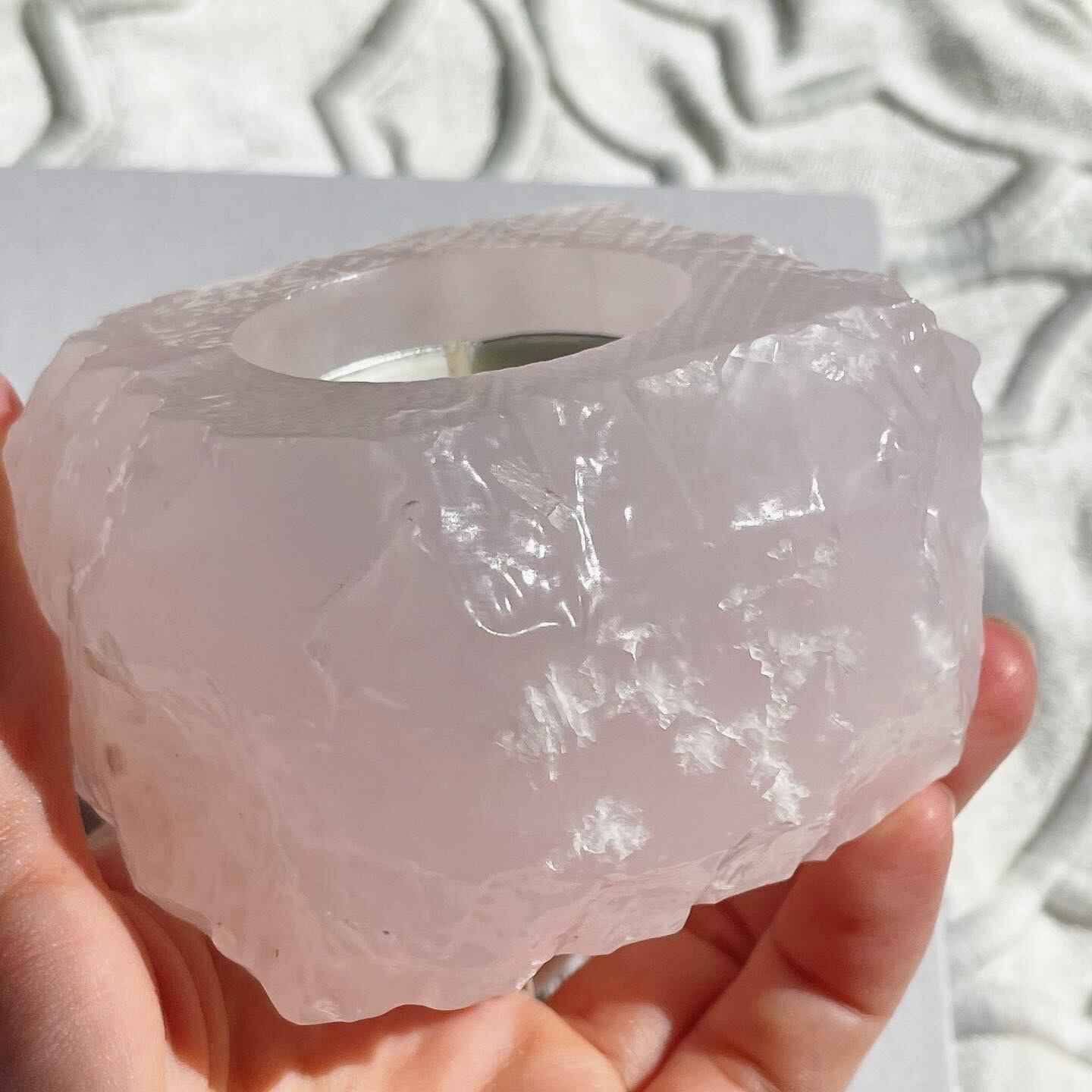 パキスタン産のピンクカルサイトのキャンドルスタンド。