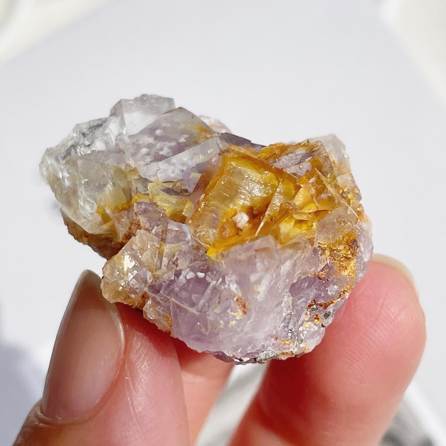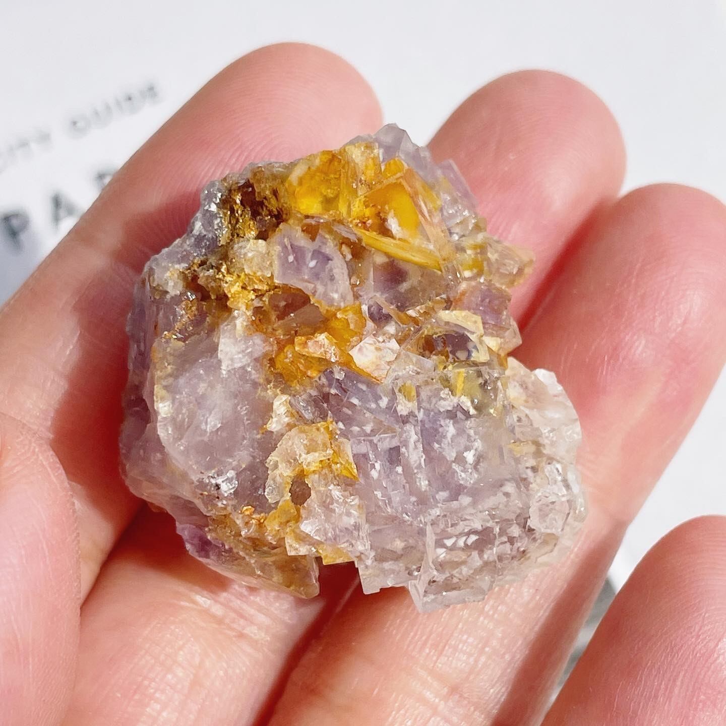 カラーレスなクリアのキューブ型フローライトの一部に、ヘマタイトが含有されオレンジの発色がみられる原石です。クリアなフローライト結晶を通して、母岩のパープルも見ることができる、カラフルなピースです。