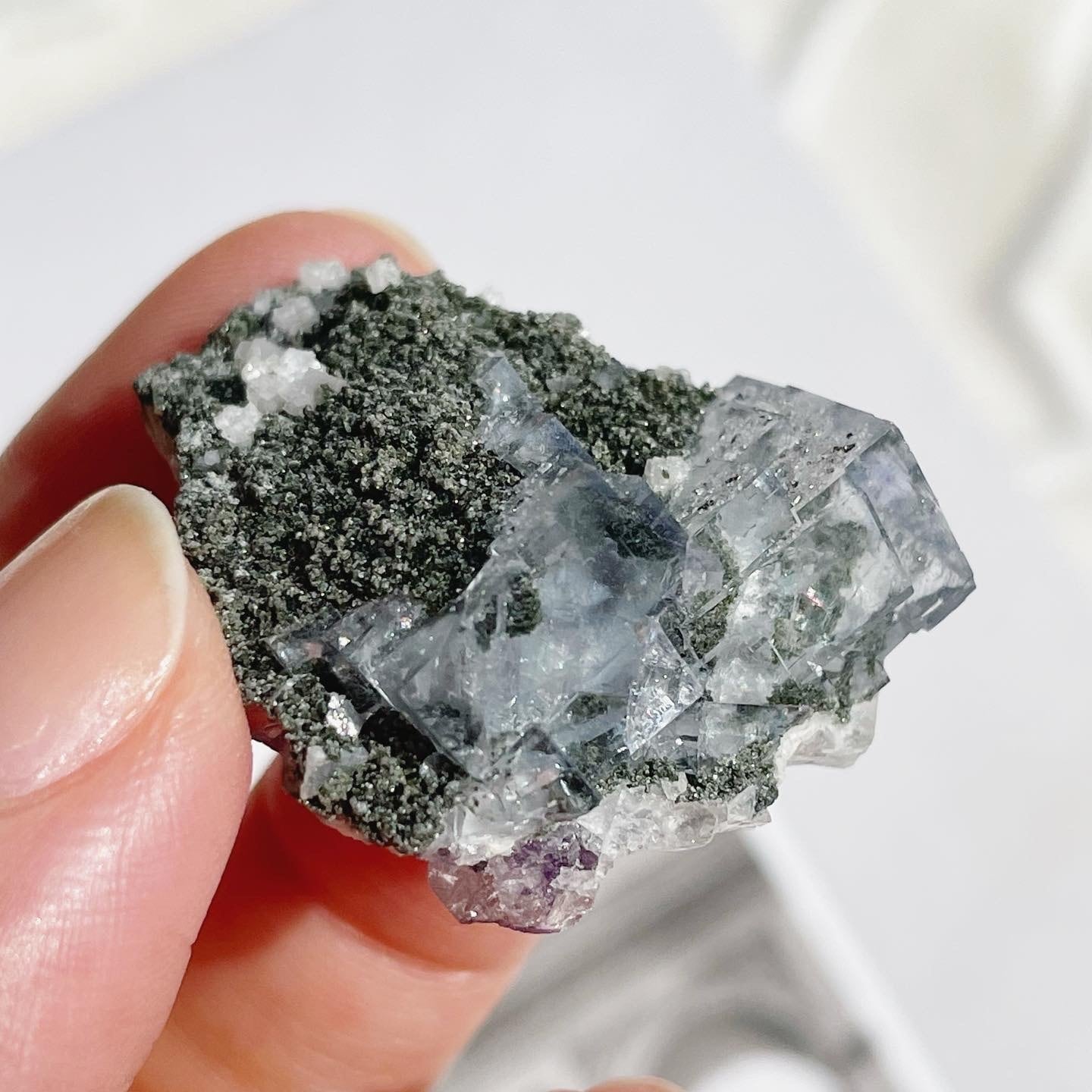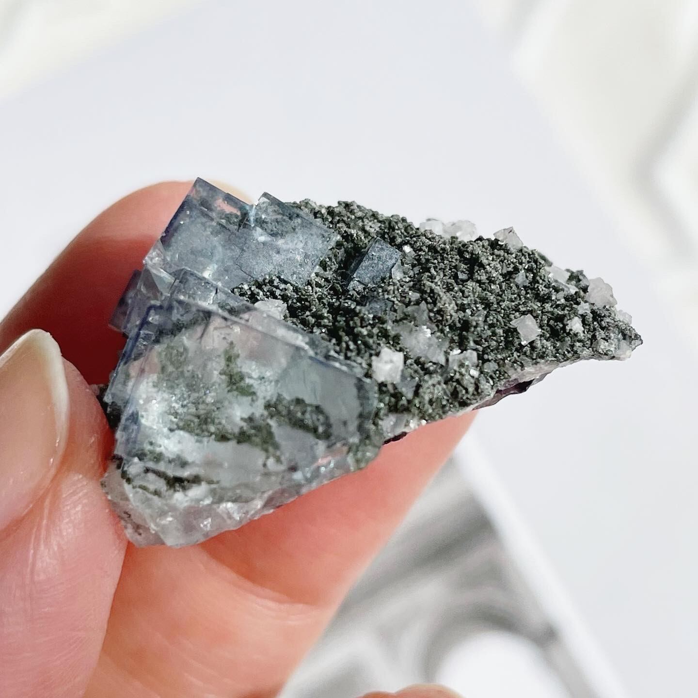 キューブ型のブルーフローライトとカルサイトの共生原石。