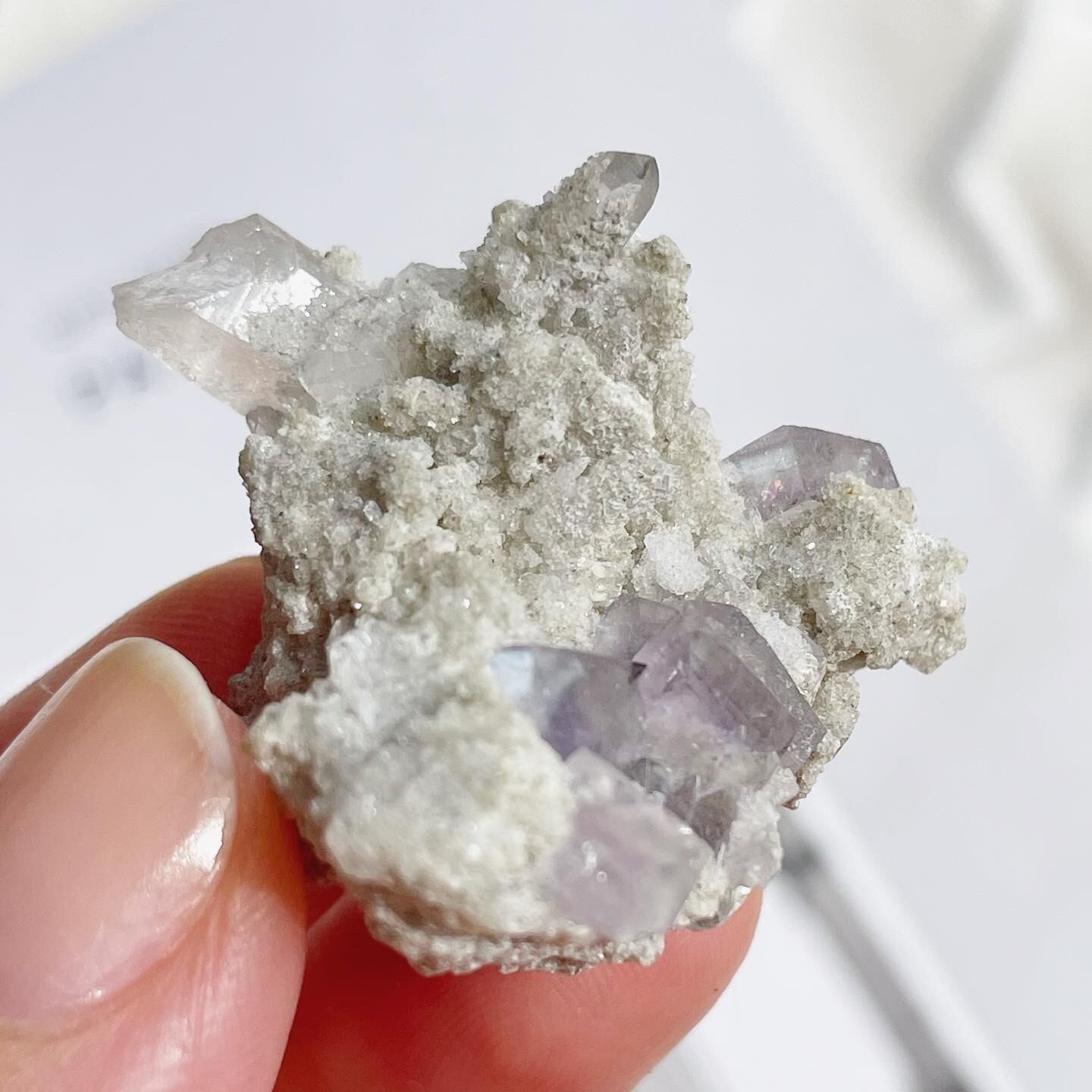 淡いラベンダーカラーのキューブ型フローライトにクリアクォーツ、カルサイト。裏面に小さなブラックトルマリンが共生した原石。