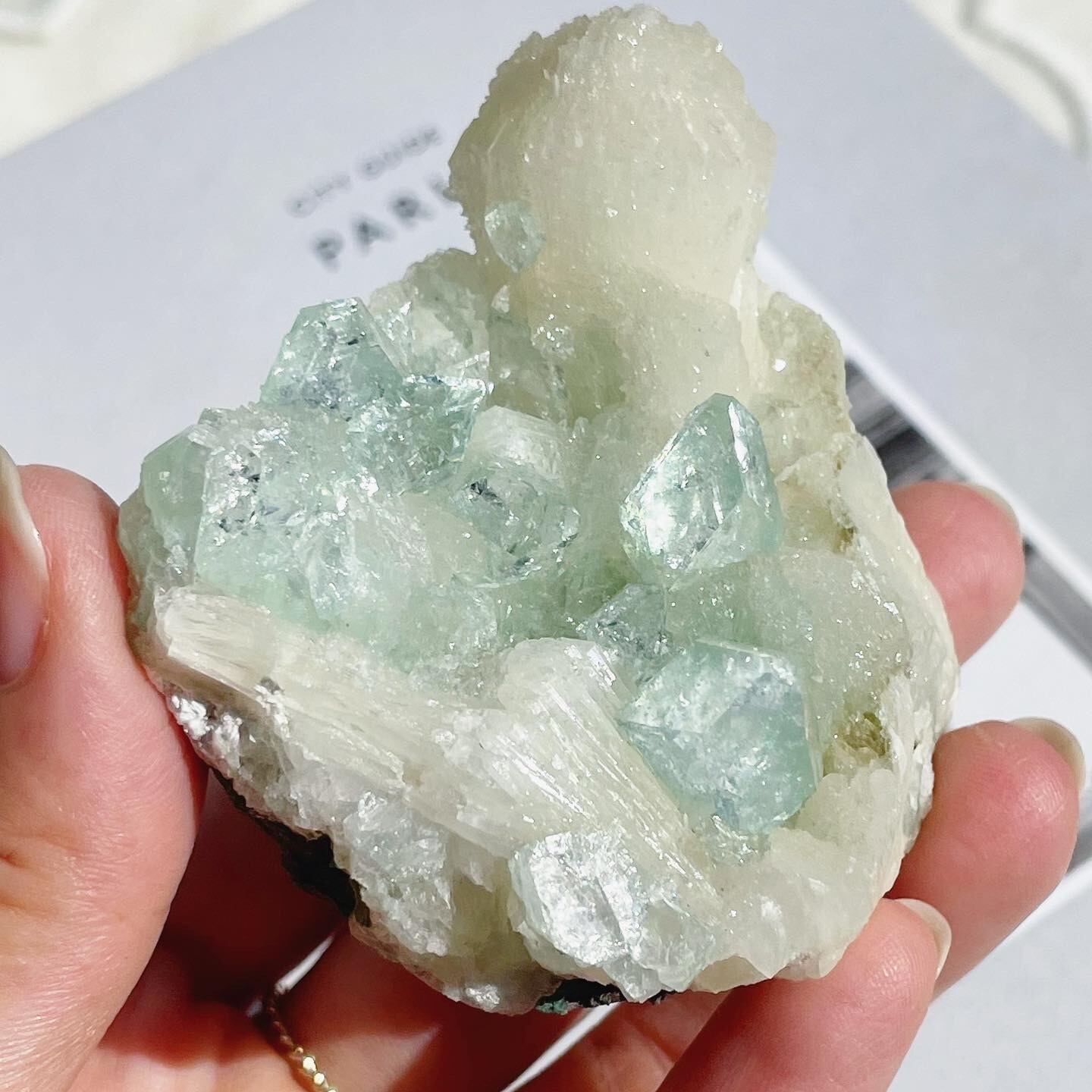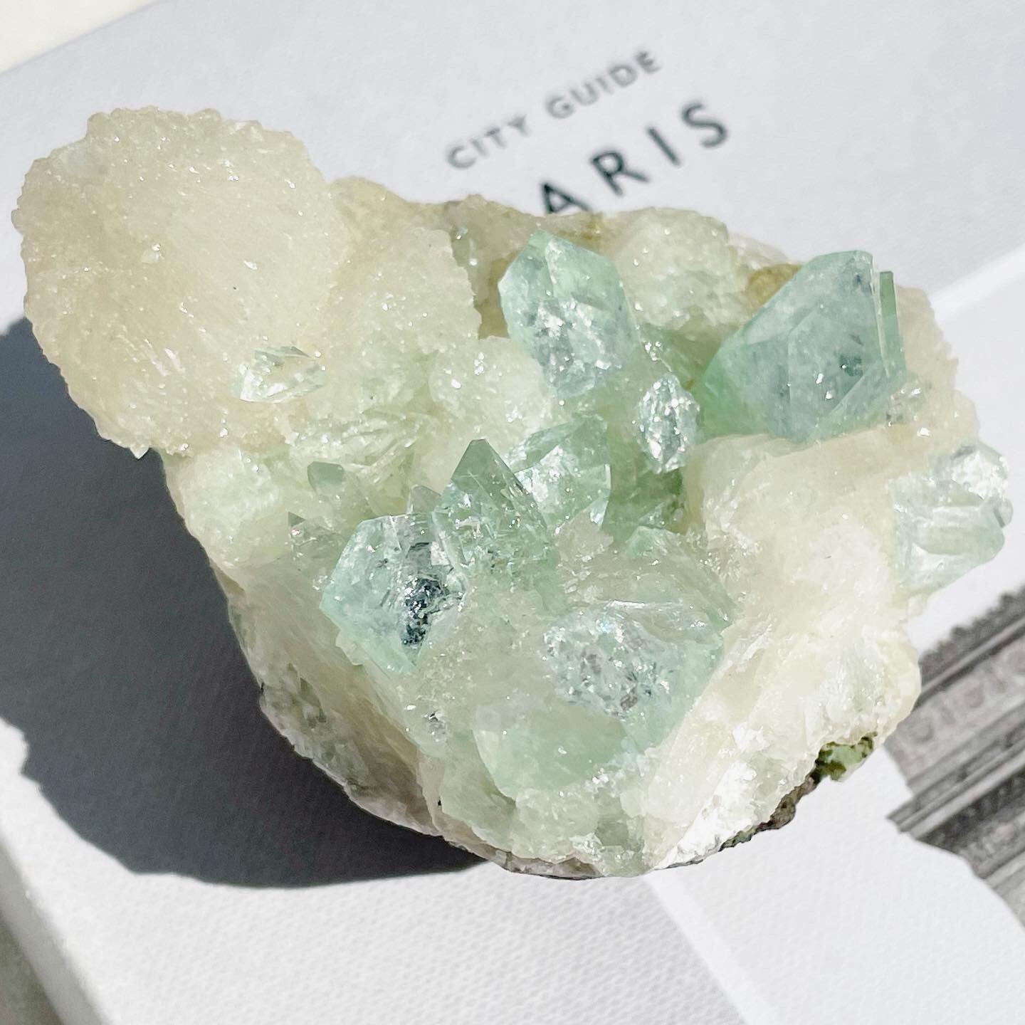 透明度の高いミントグリーン、宝石の様なグリーンアポフィライトの結晶と、ホワイトカラーのスティルバイトが共生するクラスター。