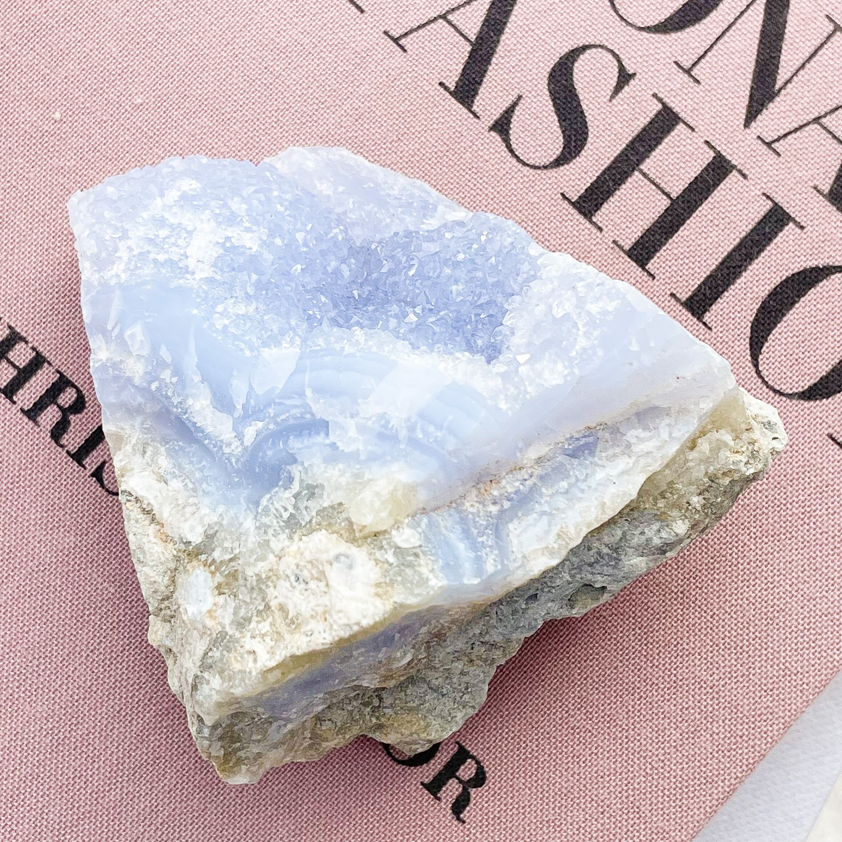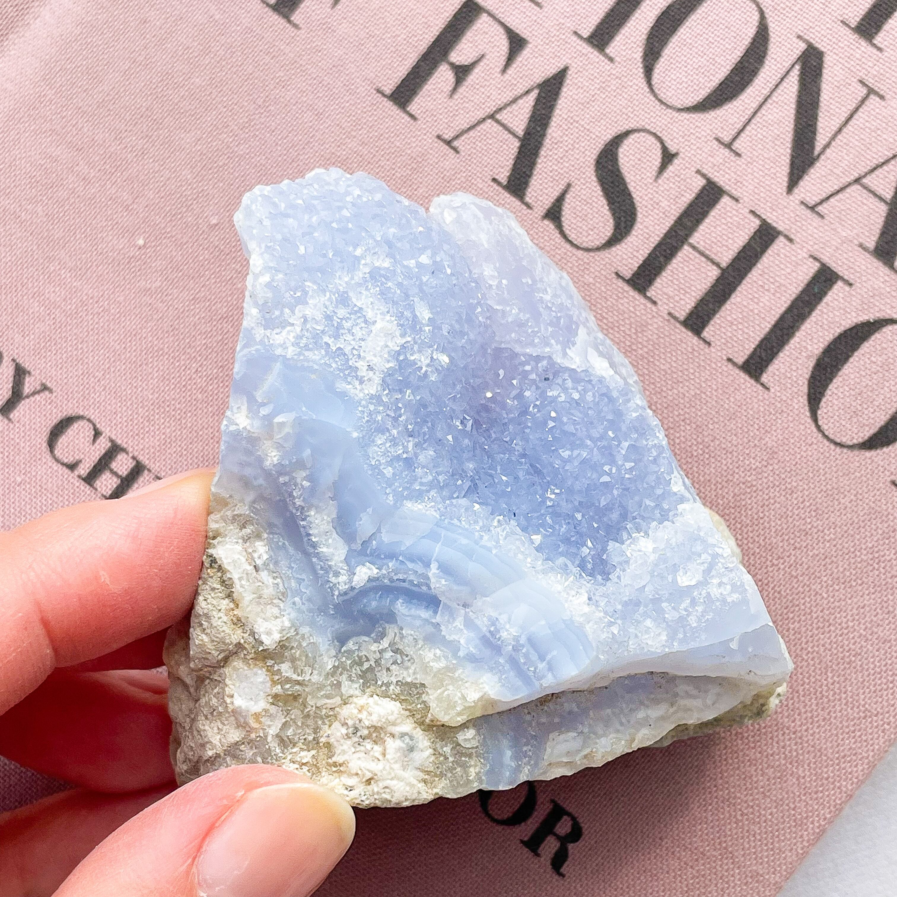 ブルーレースアゲートらしいブルーの色の層。シーグラスのように柔らかく光を透過します。群青色のドゥルージーが堪能できる大きめなピース♡