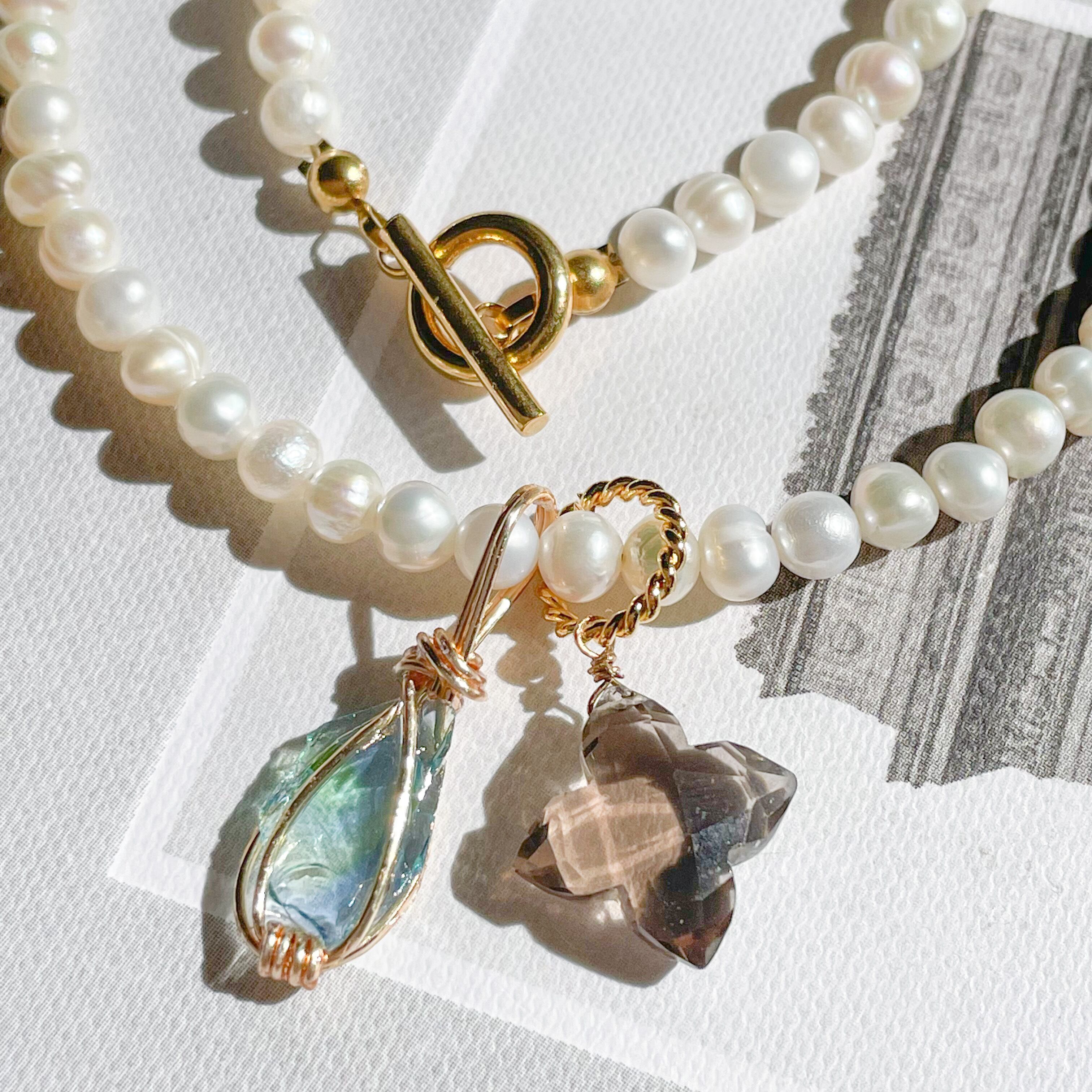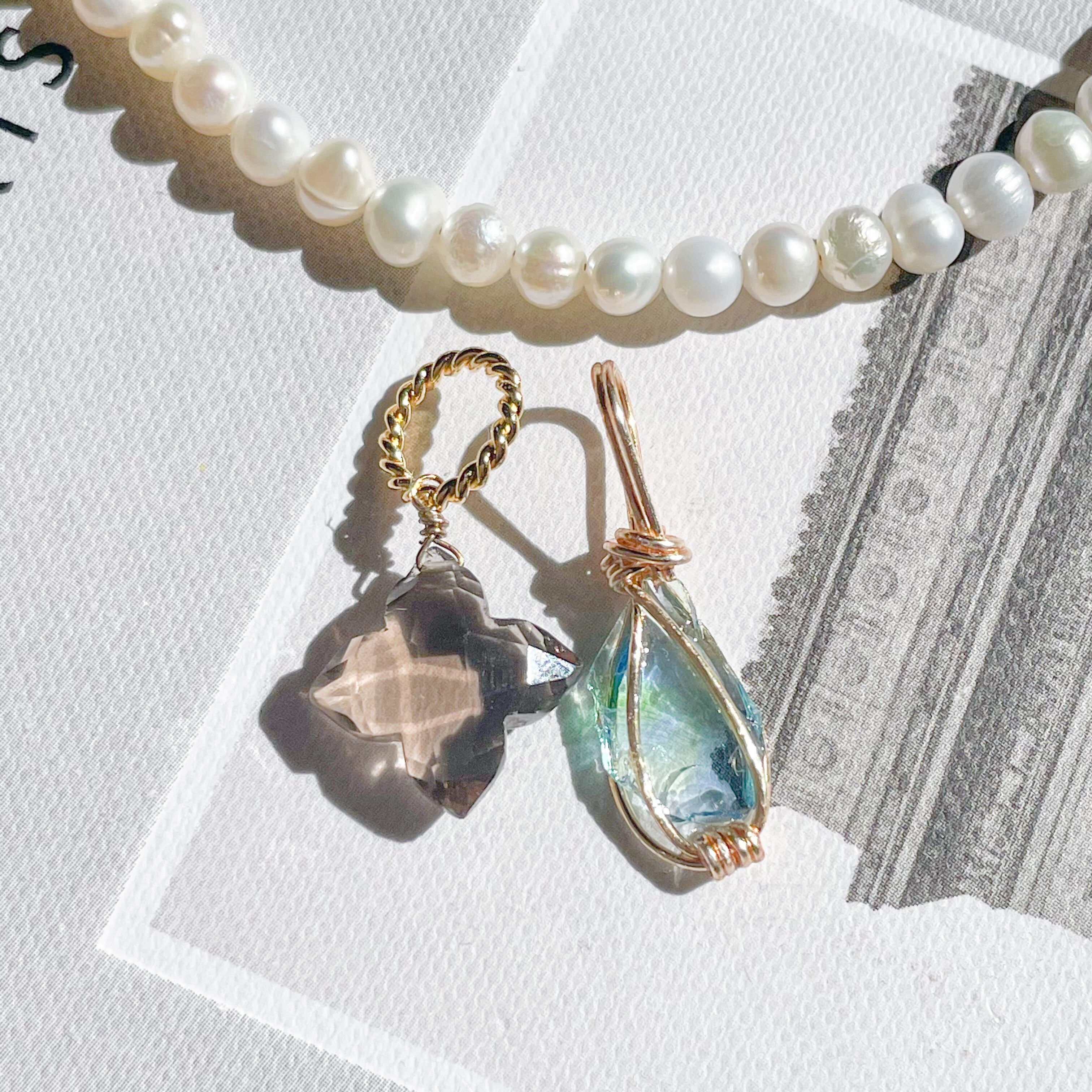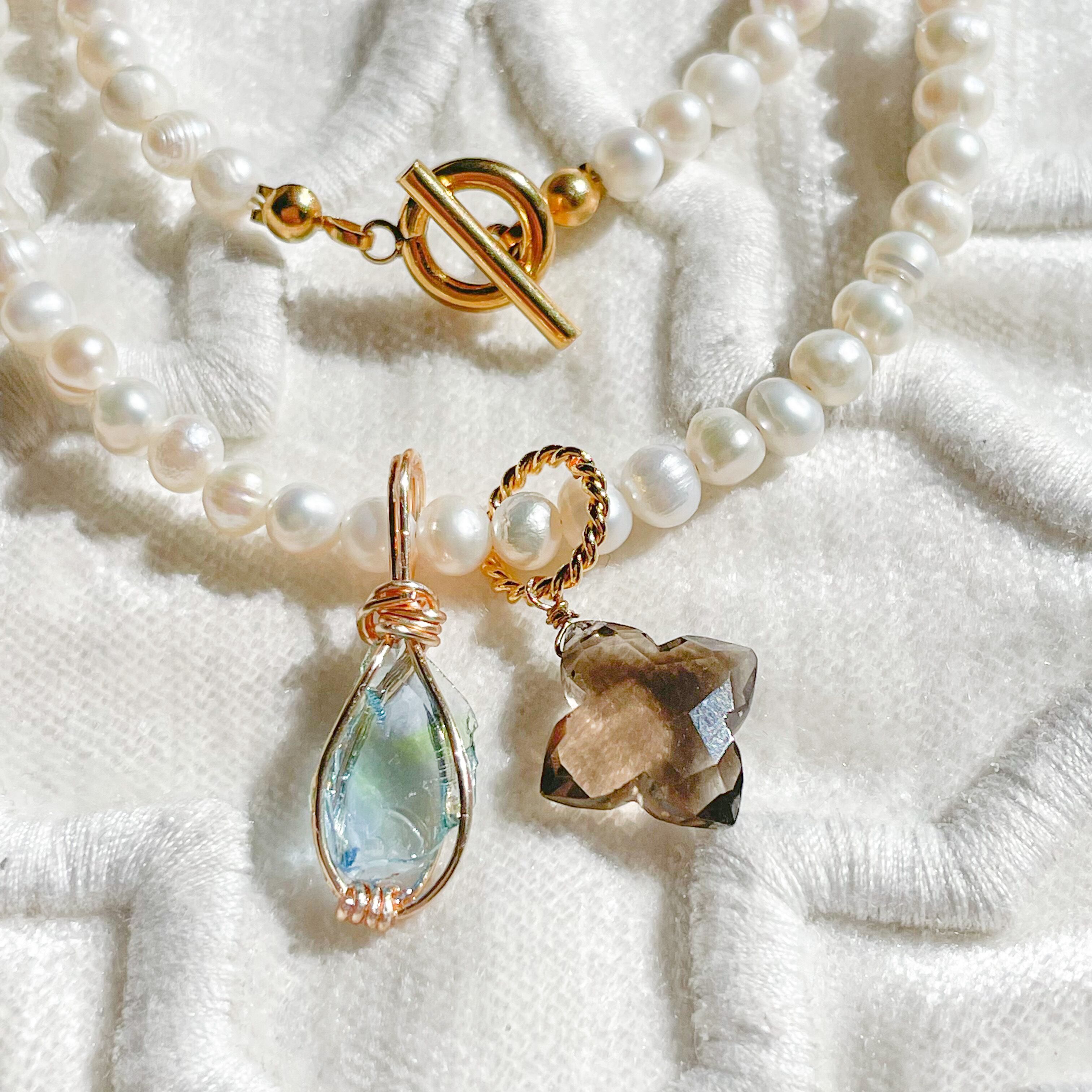 淡水パールネックレスにアンダラクリスタルとスモーキークォーツのトップをセットし、付け方次第で何通りにもなるセットとなってます♡♡