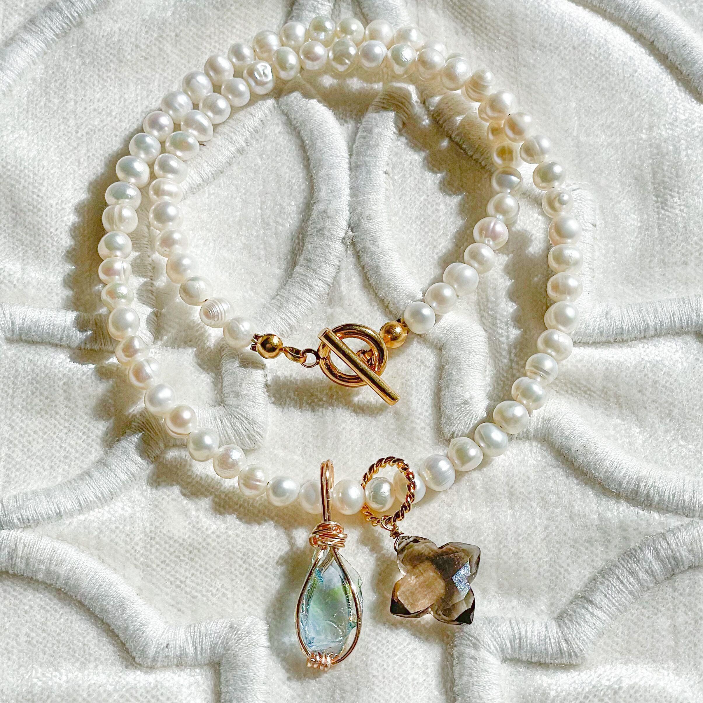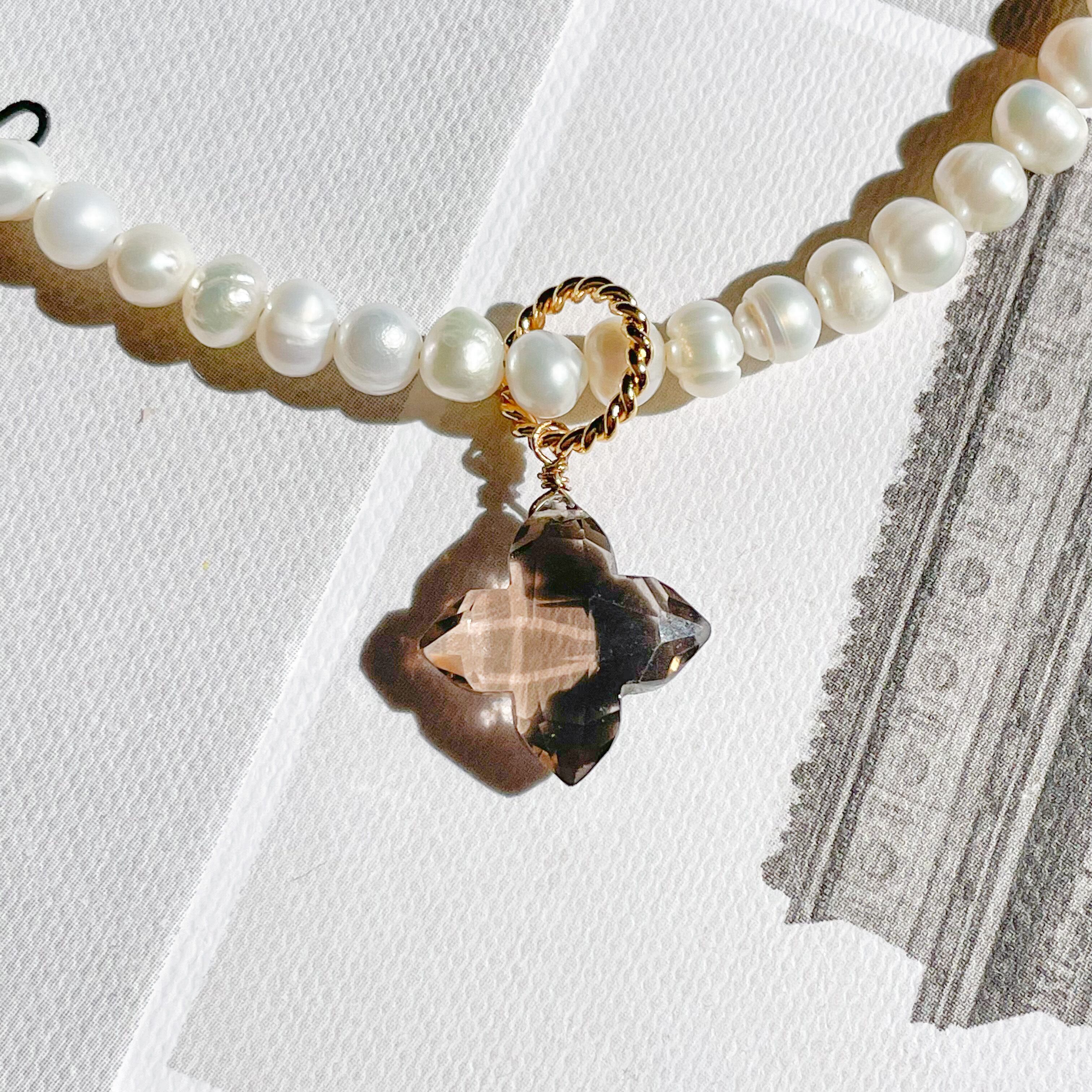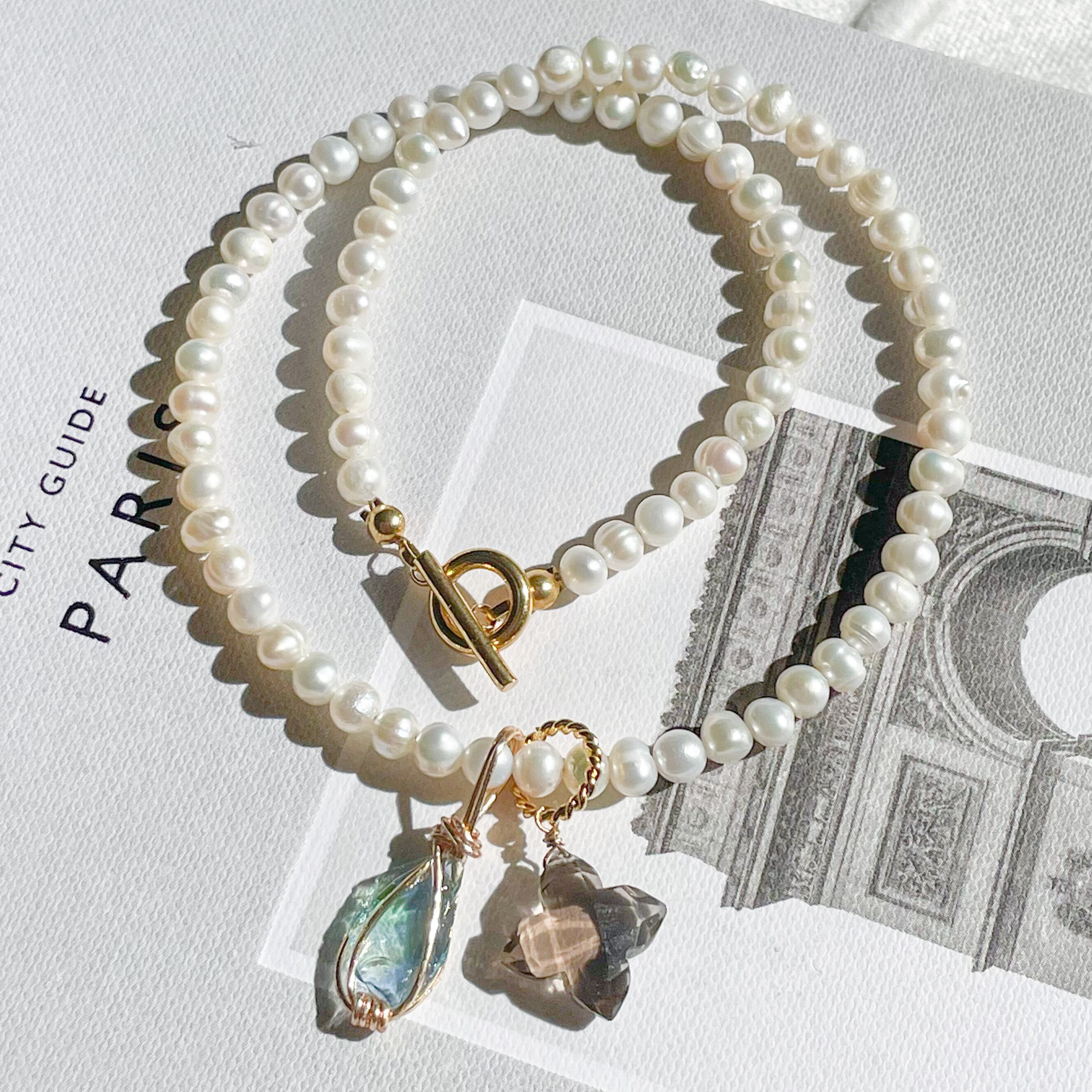 淡水パールネックレスにアンダラクリスタルとスモーキークォーツのトップをセットし、付け方次第で何通りにもなるセットとなってます♡♡