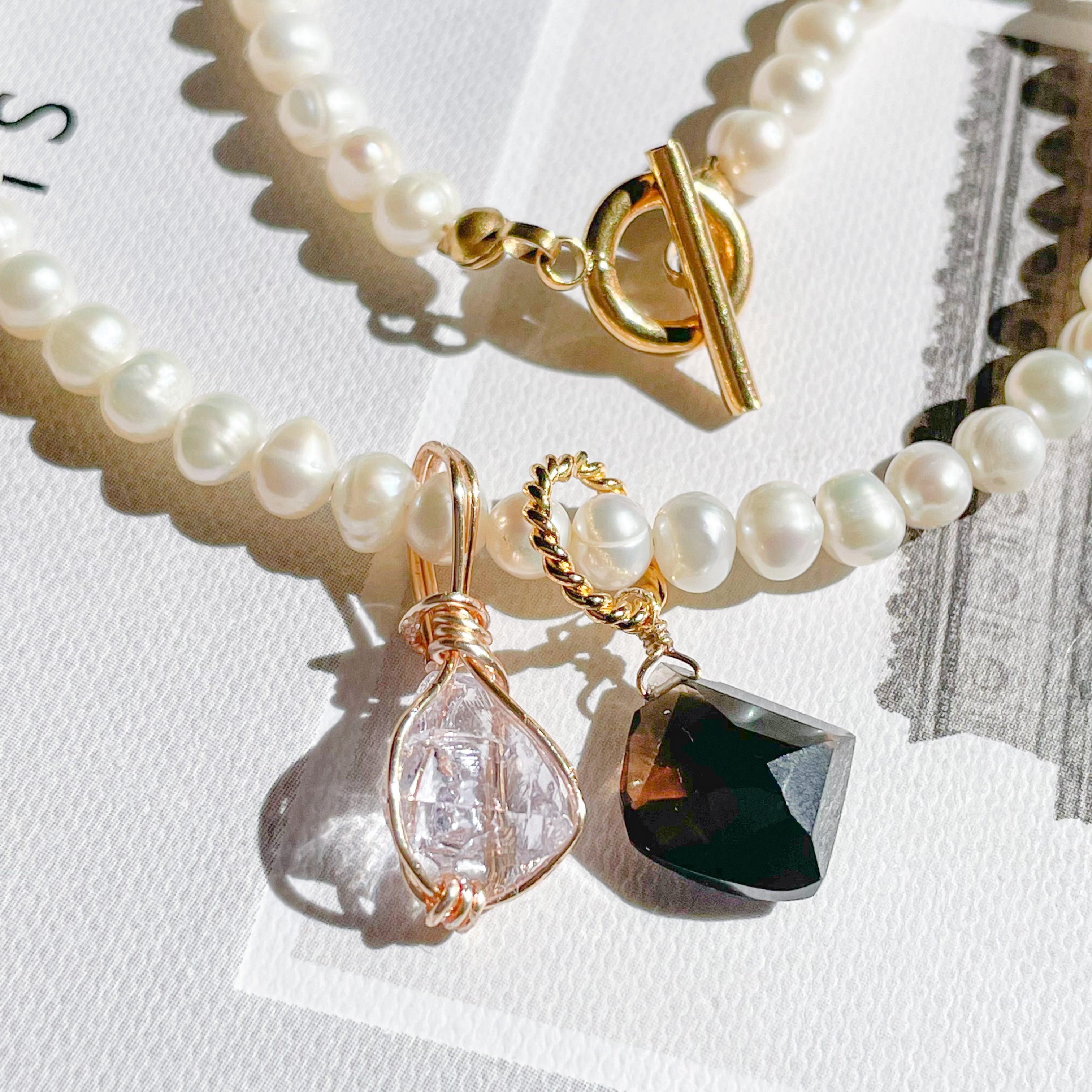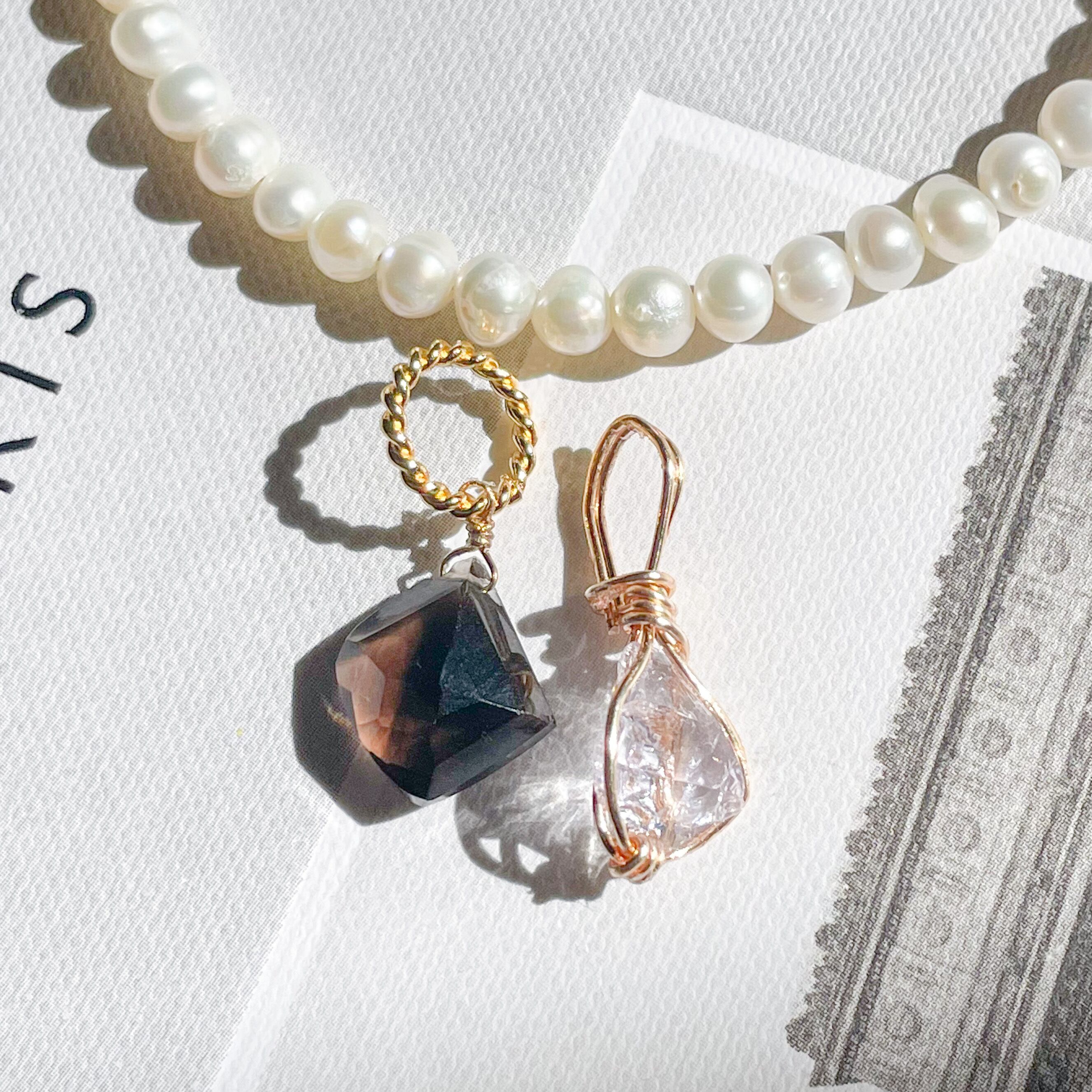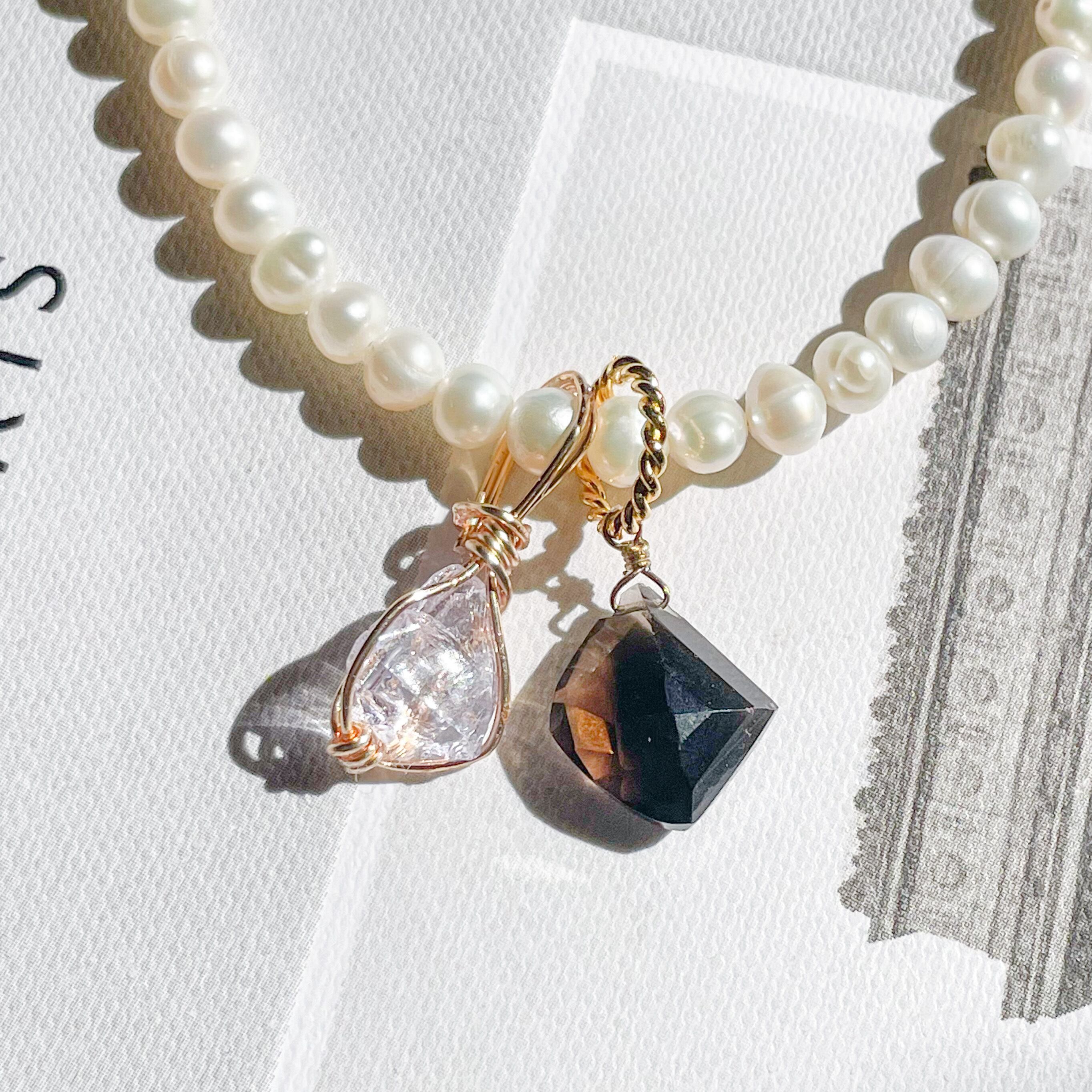 淡水パールネックレスにアンダラクリスタルとスモーキークォーツのトップをセットし、付け方次第で何通りにもなるセットとなってます♡♡