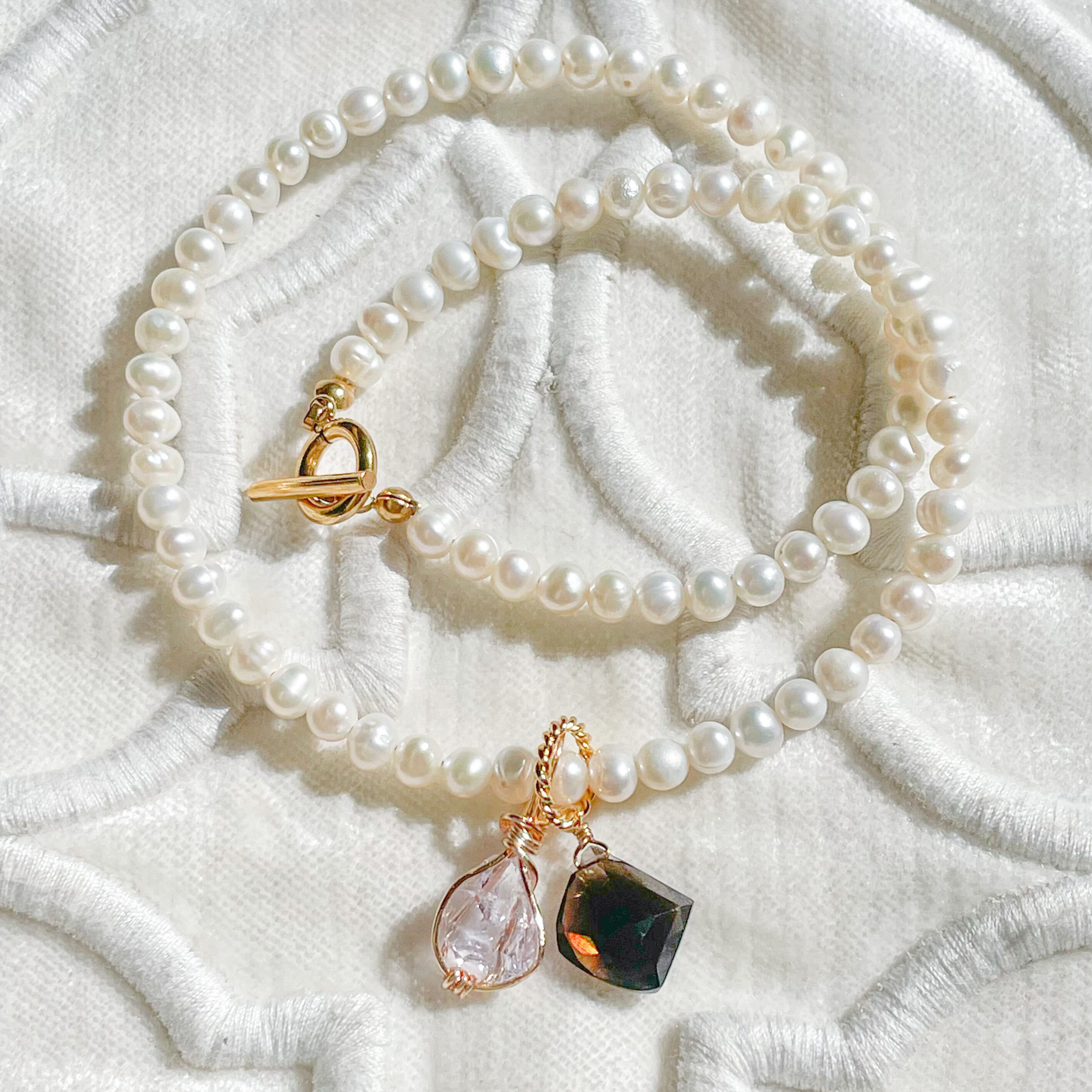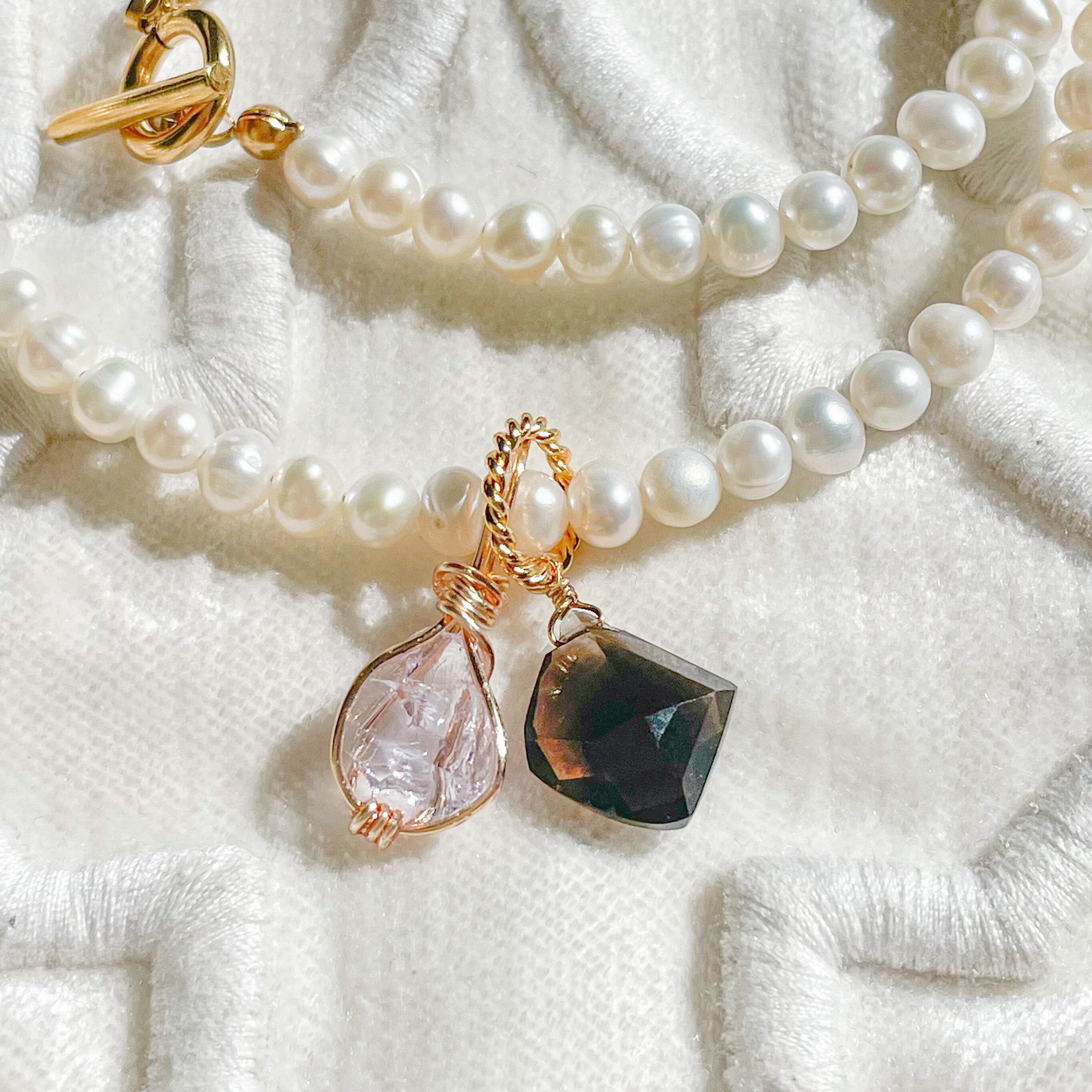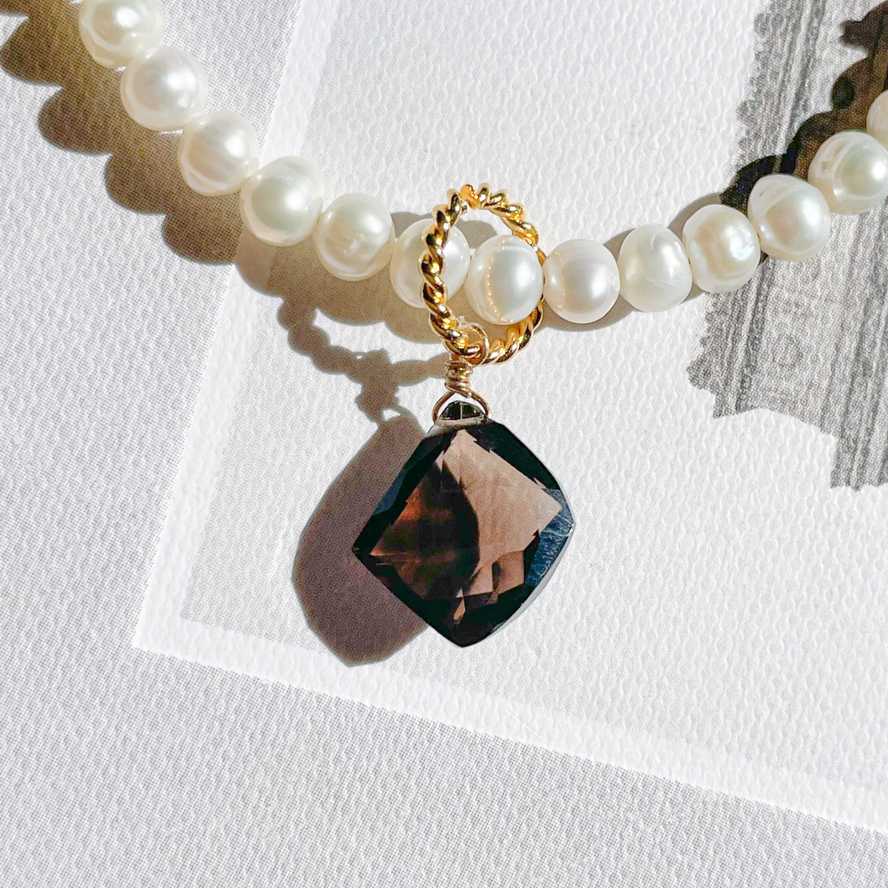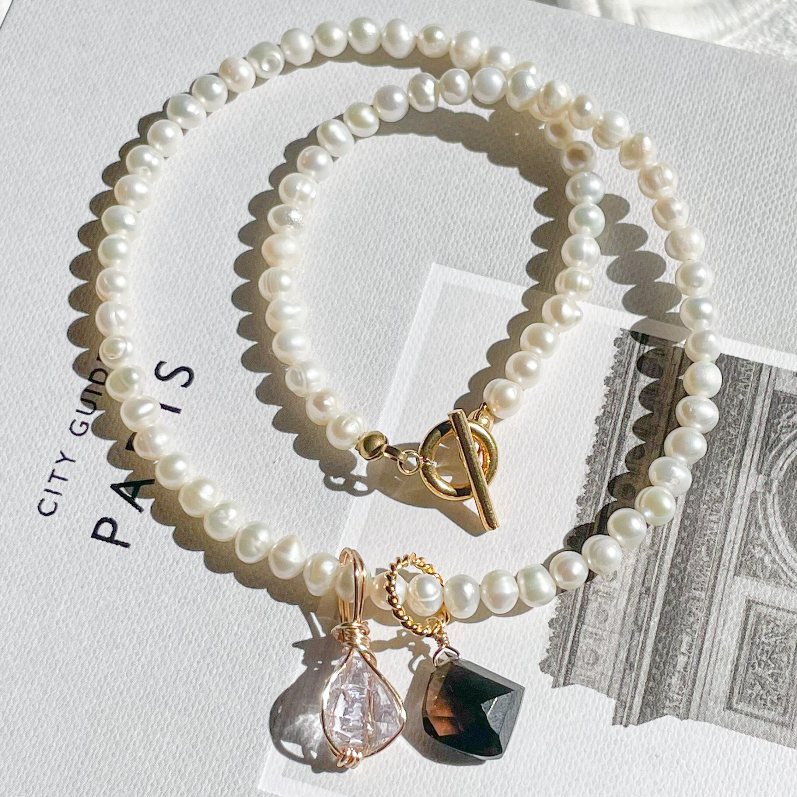 淡水パールネックレスにアンダラクリスタルとスモーキークォーツのトップをセットし、付け方次第で何通りにもなるセットとなってます♡♡