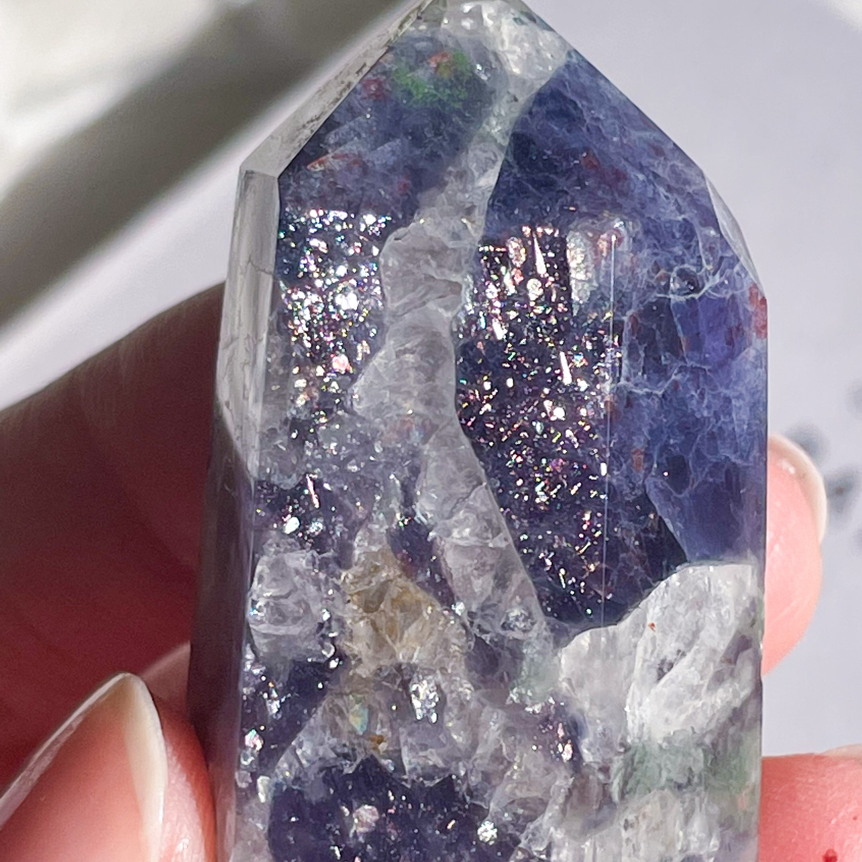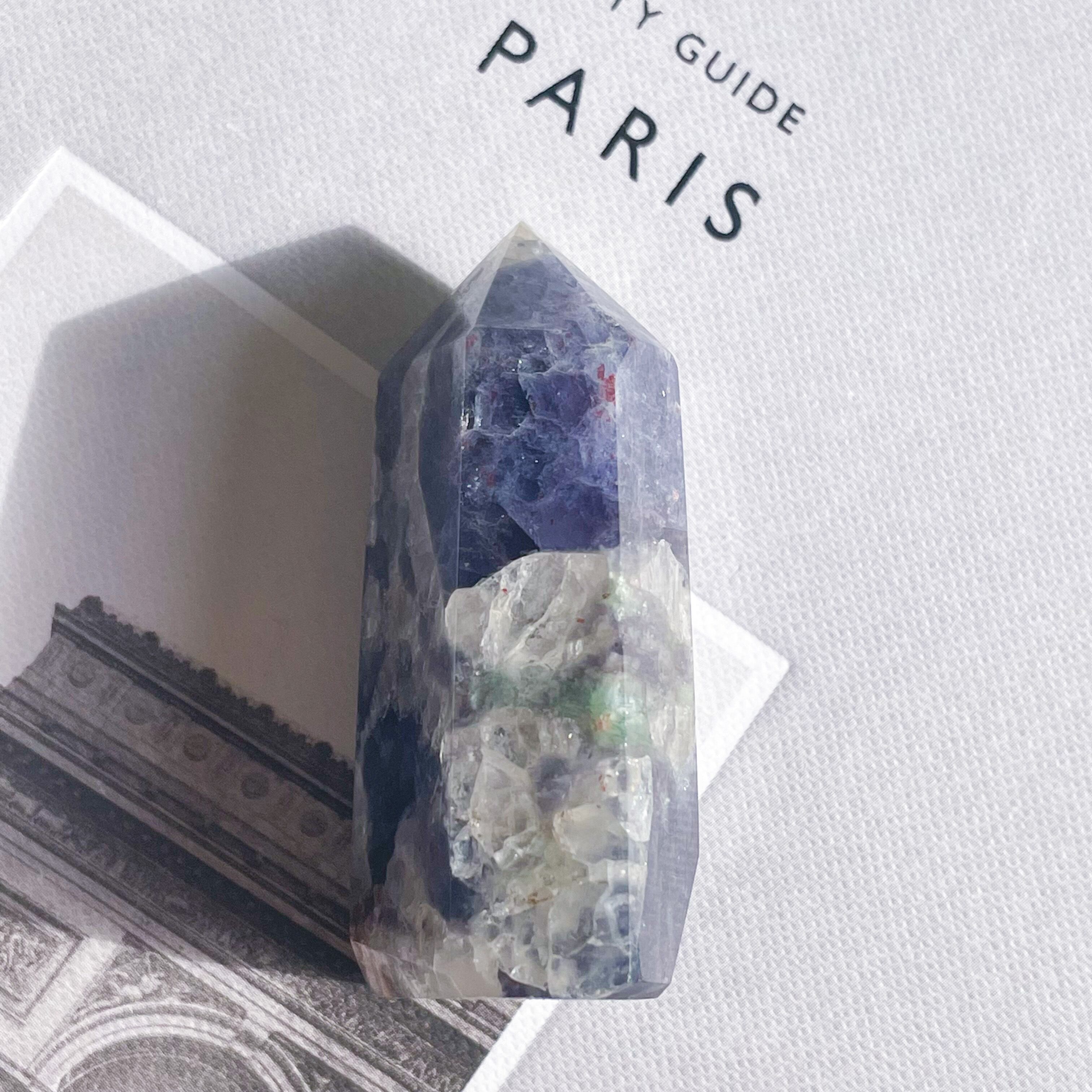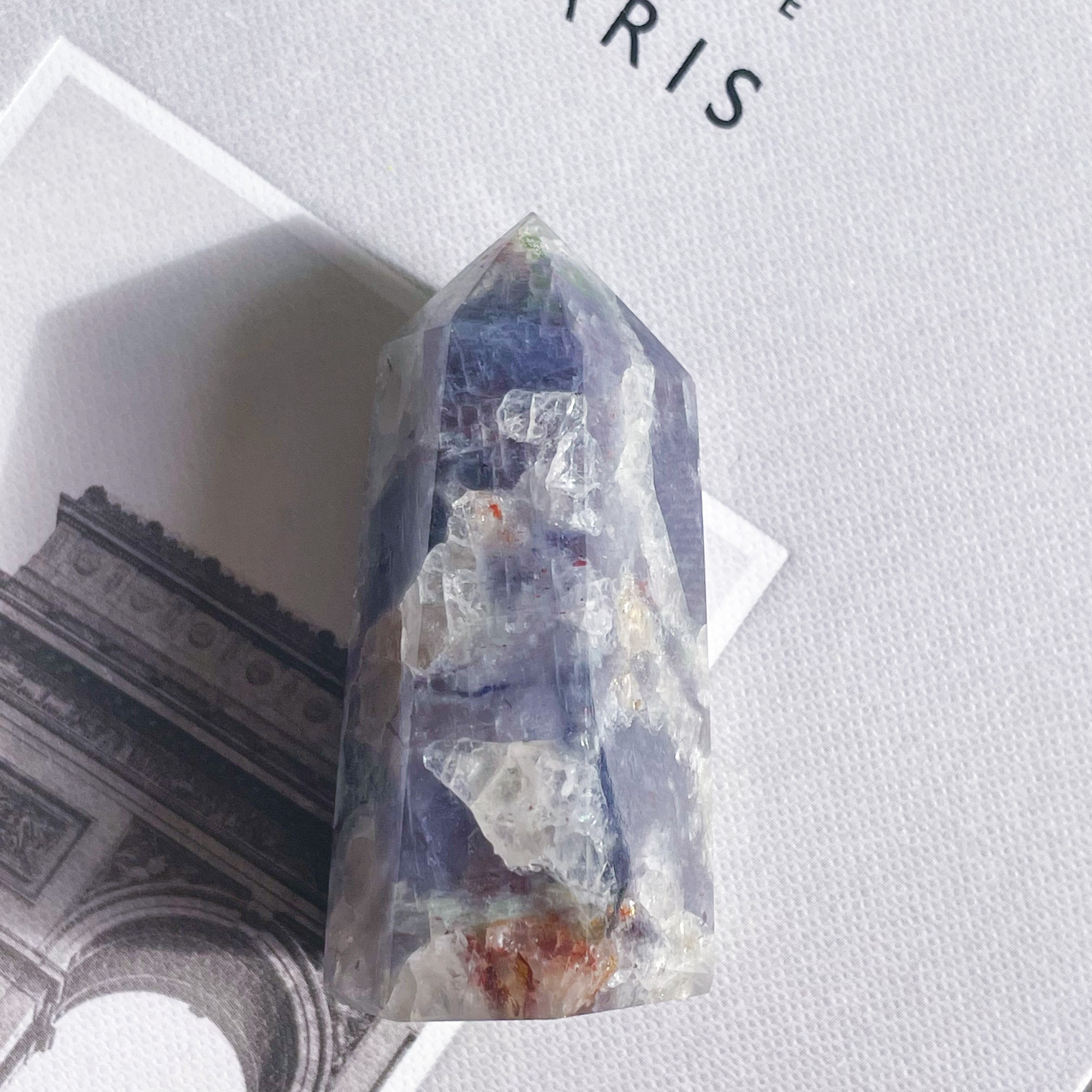 クォーツに、アイオライトが美しくはめ込まれたような、ステンドグラスを思わせるポイントです。