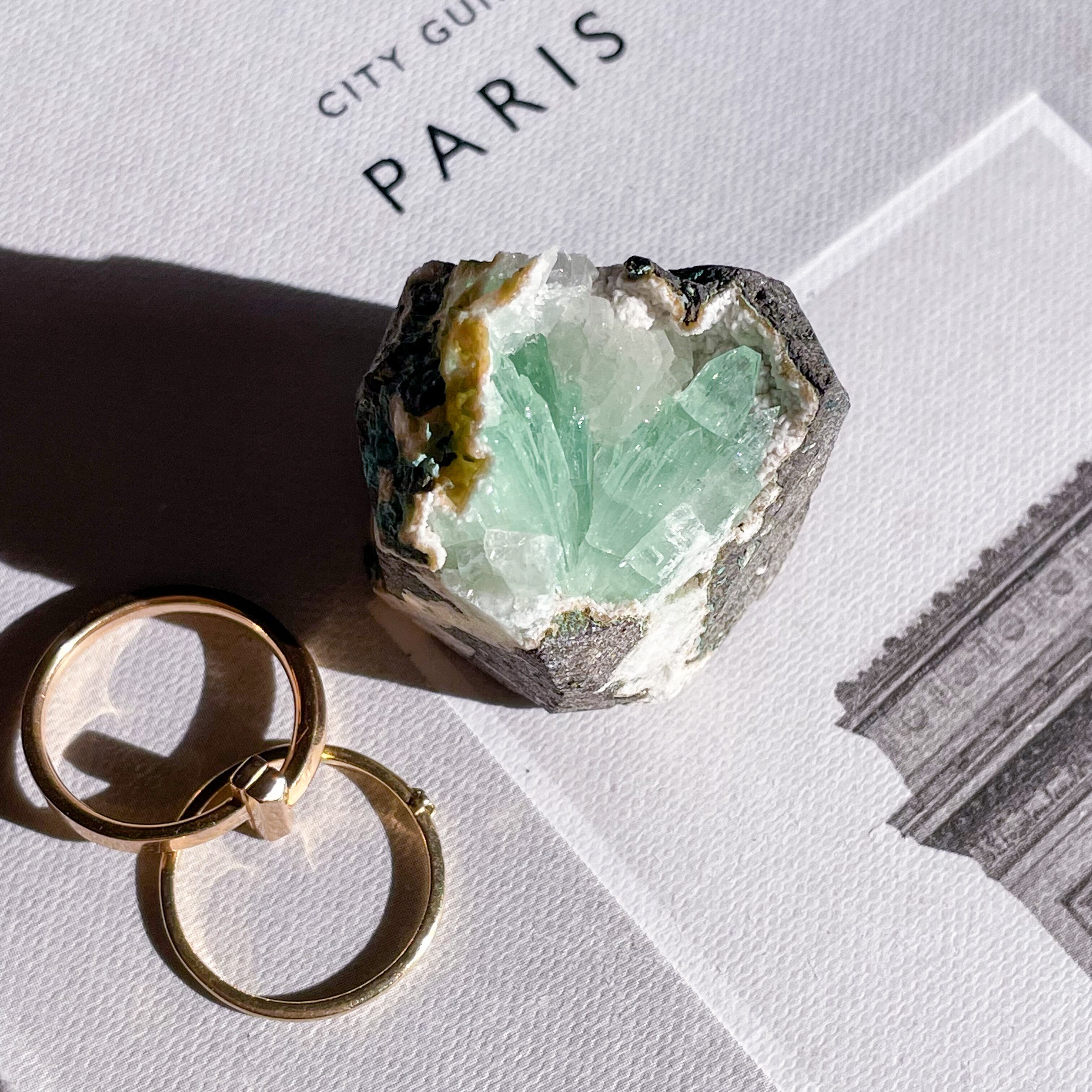 グリーンアポフィライト自体が流通量の少ない天然石ですが、今回のシリーズはジェムのような、透明度のあるグリーンの結晶からなる大変希美しいピースを集めました。