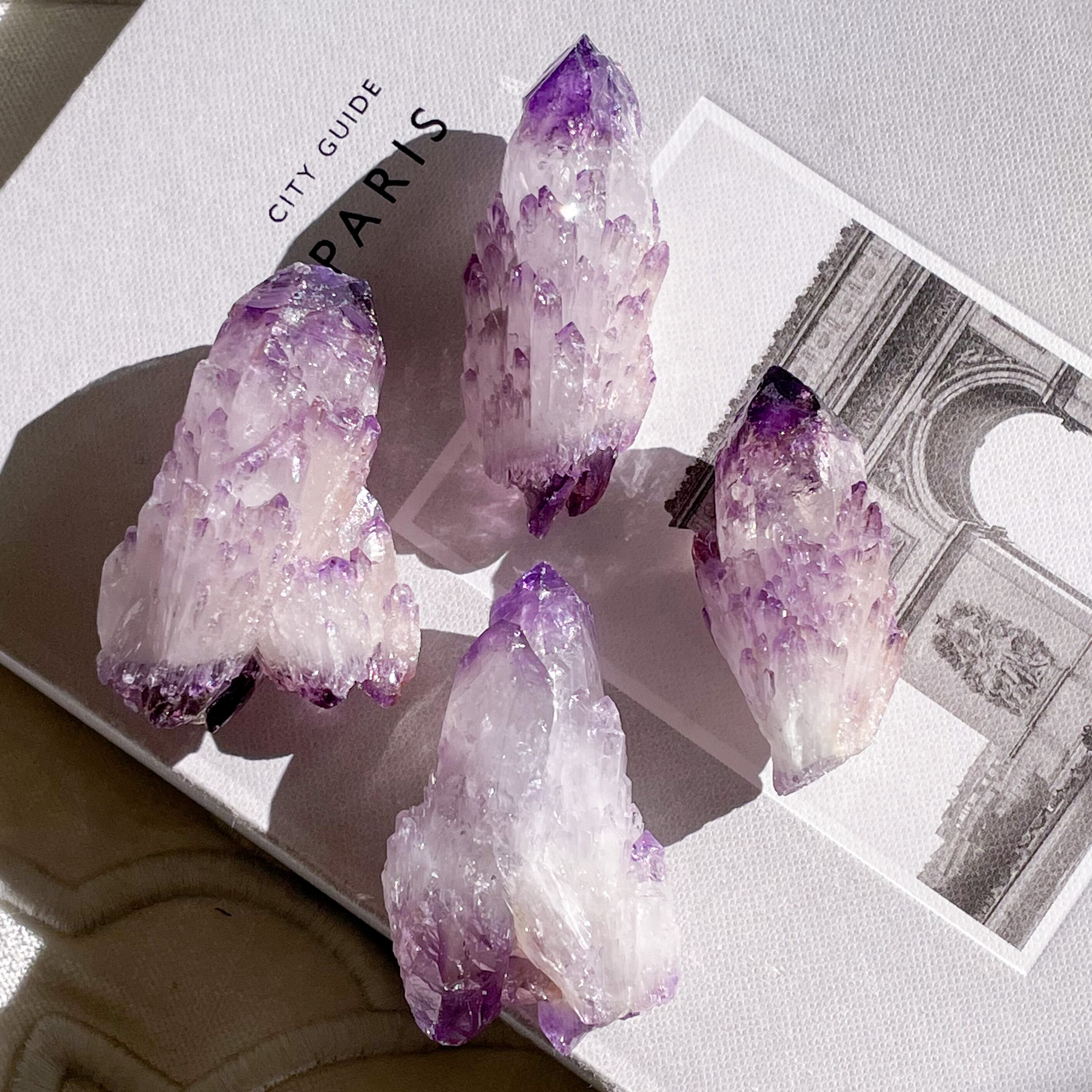結晶の両端が鮮やかなパープルになっており、ダブルポイント(両剣)水晶が集まったクラスターになっています。