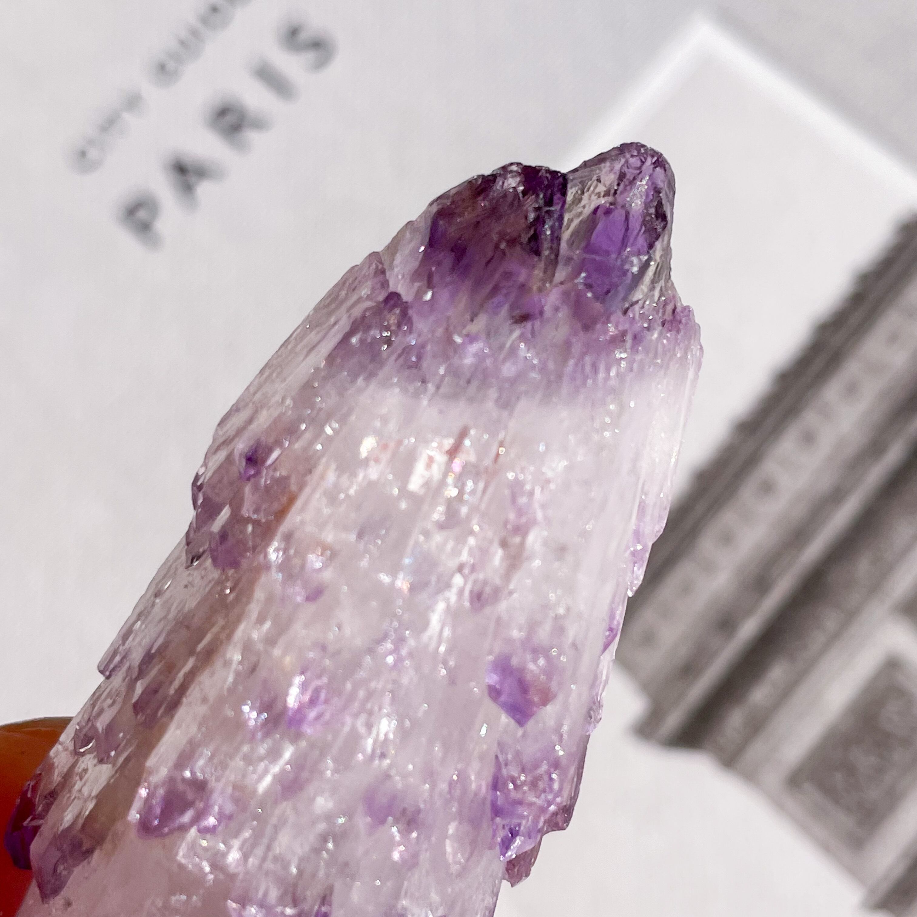 結晶の両端が鮮やかなパープルになっており、ダブルポイント(両剣)水晶が集まったクラスターになっています。