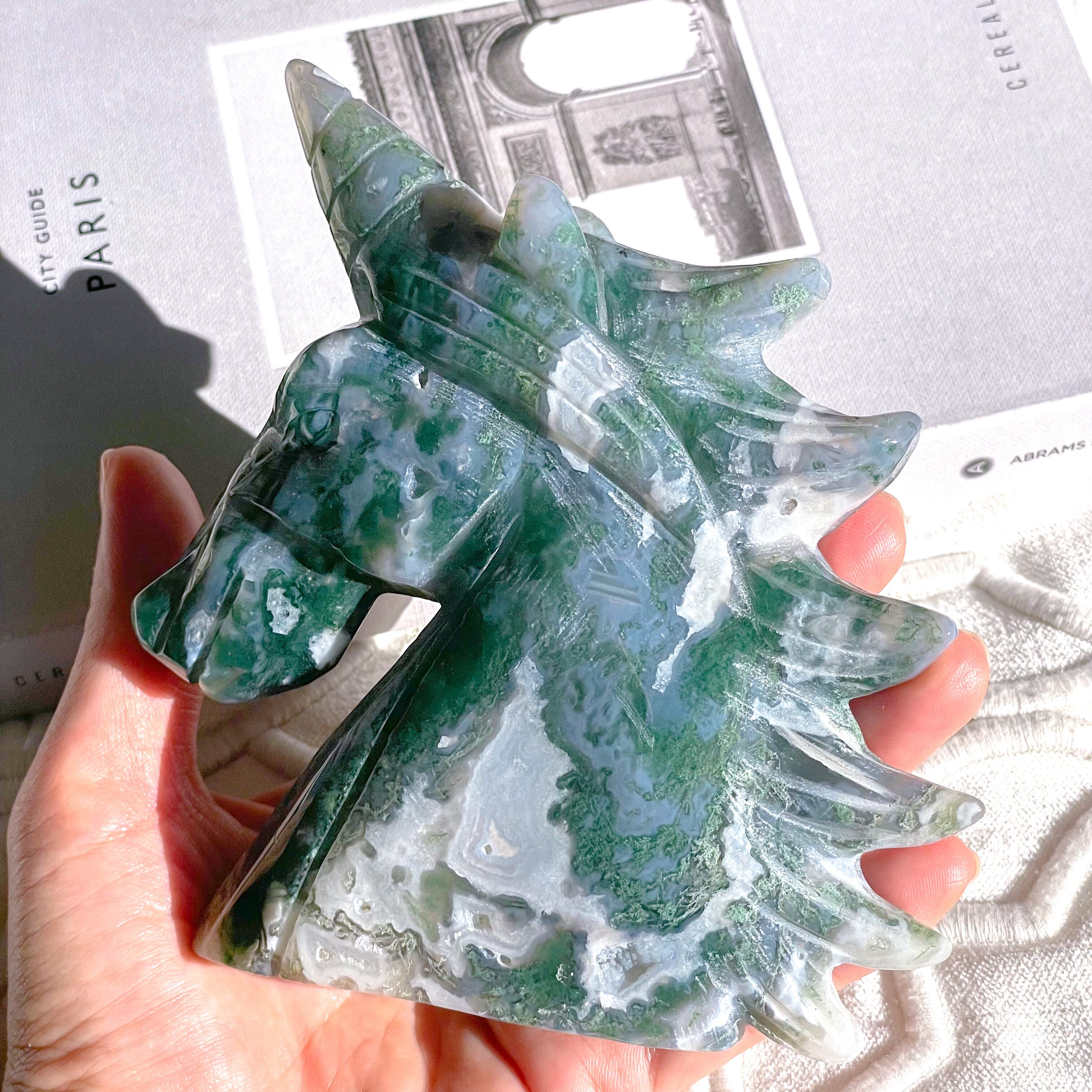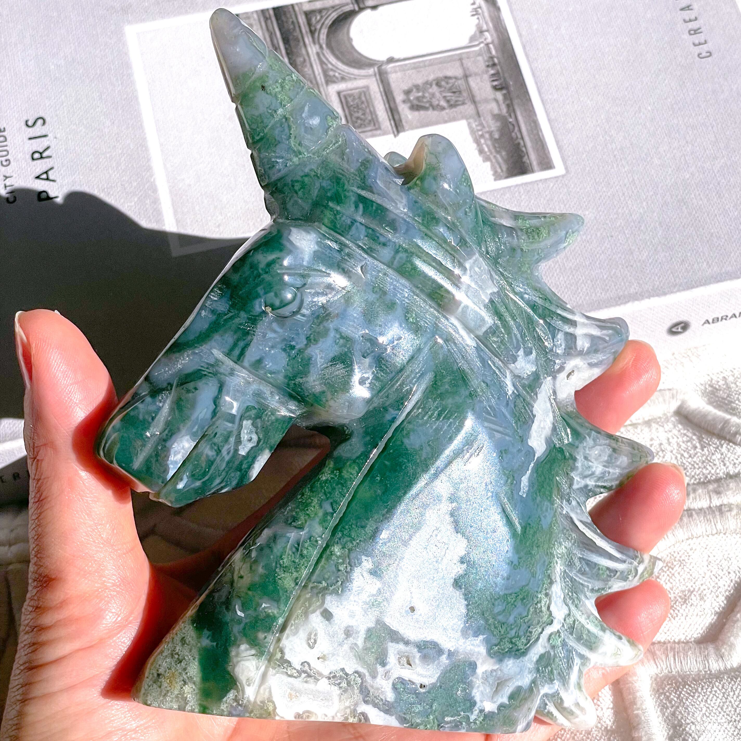 モスアゲートが美しく掘り出された、優しいお顔のユニコーンです。