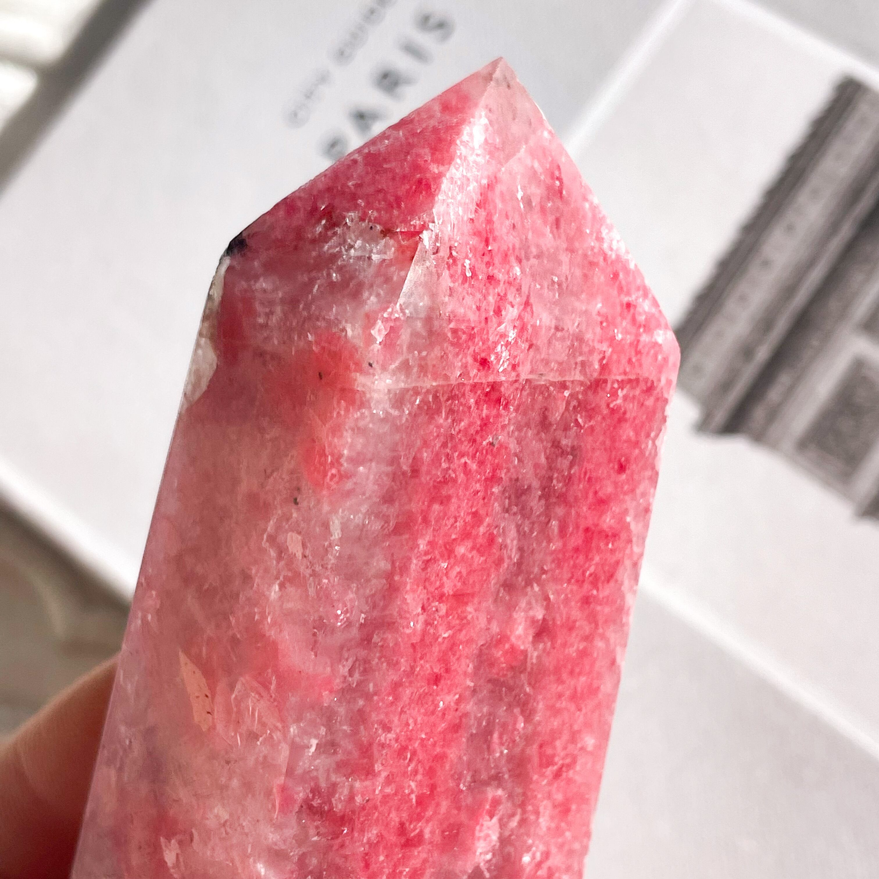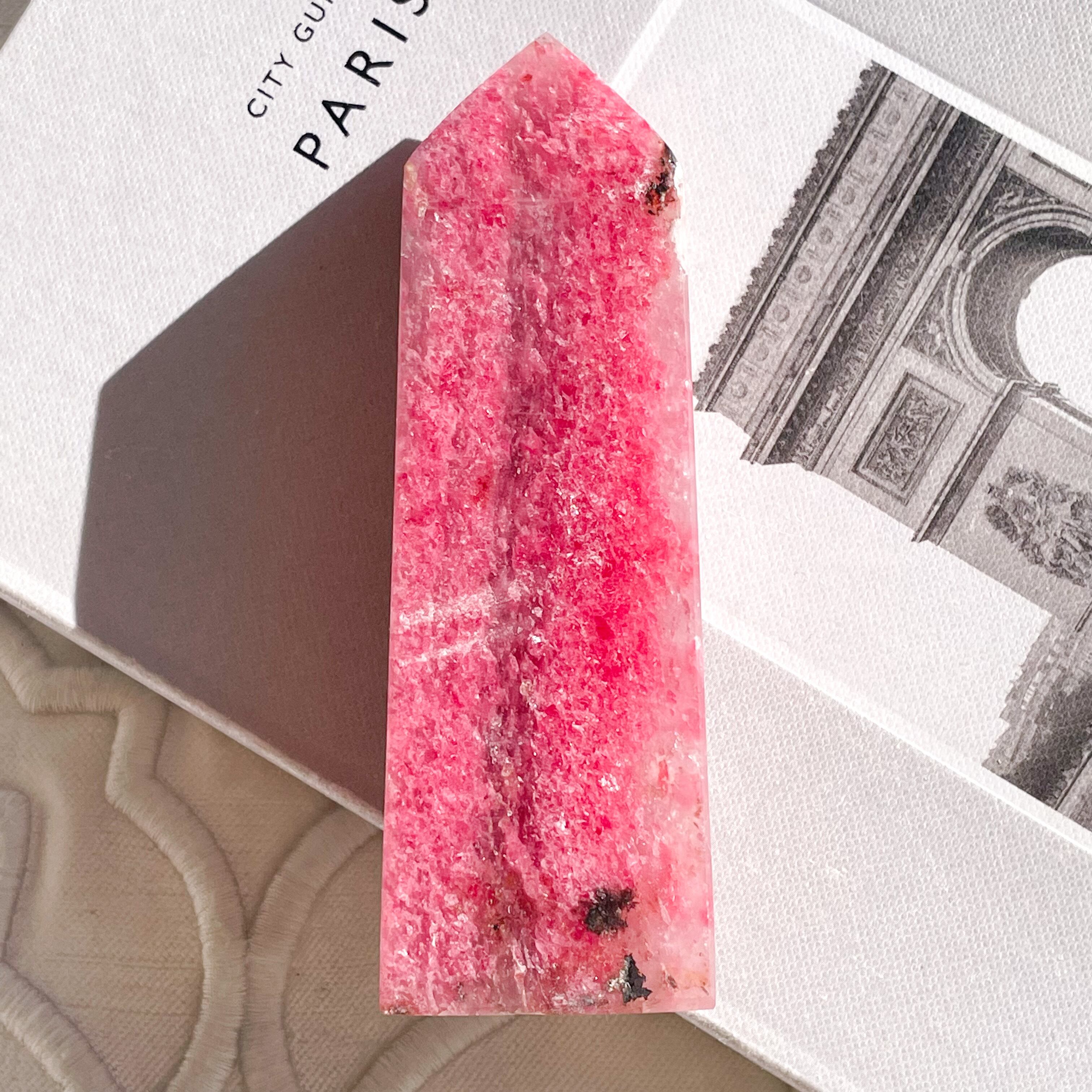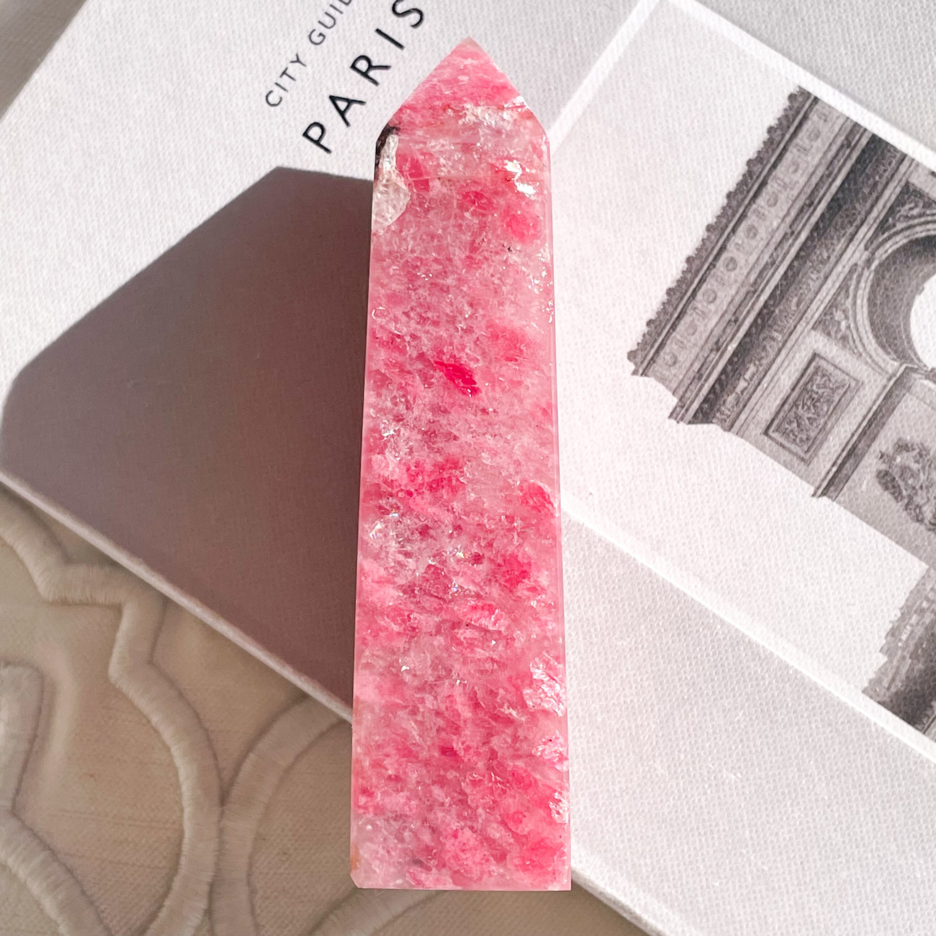 ピンク〜レッドカラーの色合いが薔薇を連想させる美しいストーン。黒いインクルージョンはほとんどみられず、美しいビビッドなローズカラーに目を奪われるタワーです。