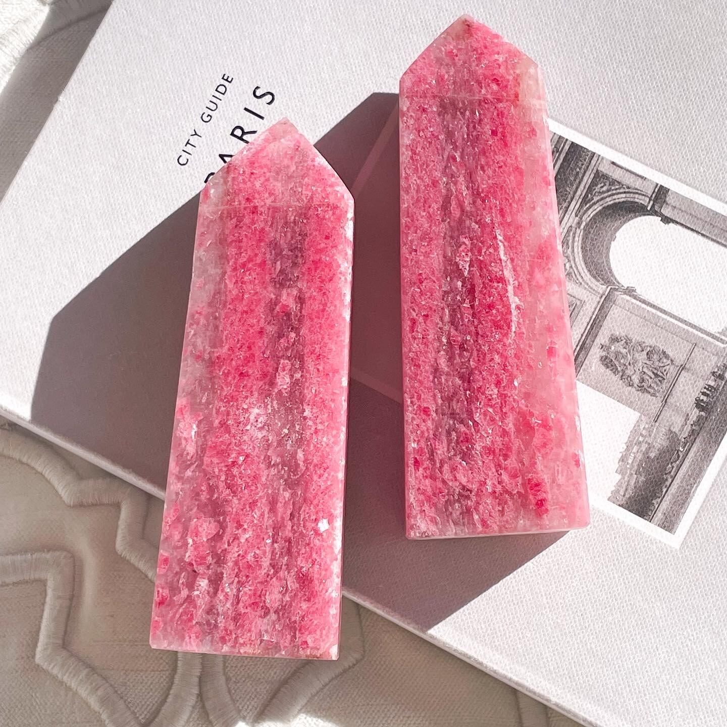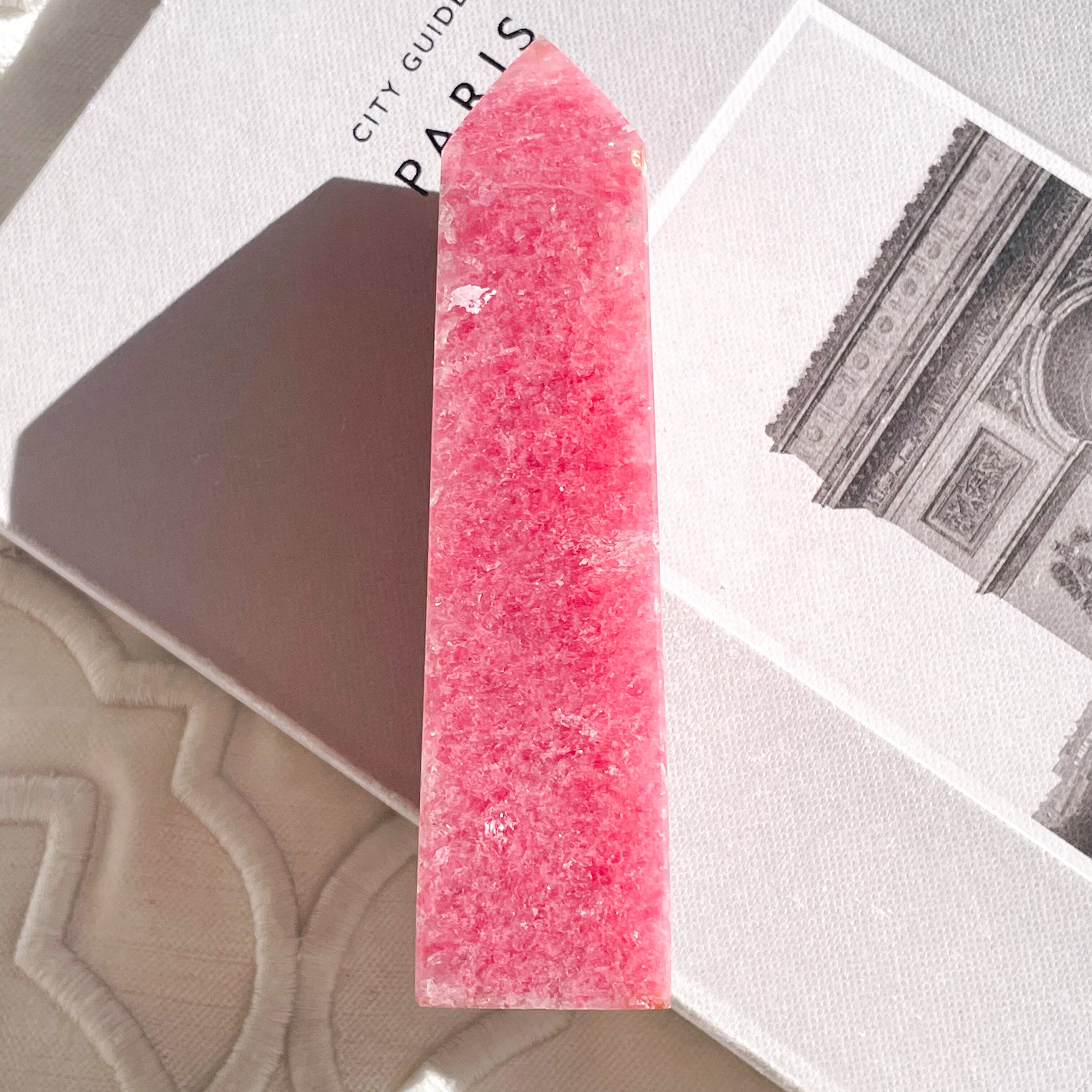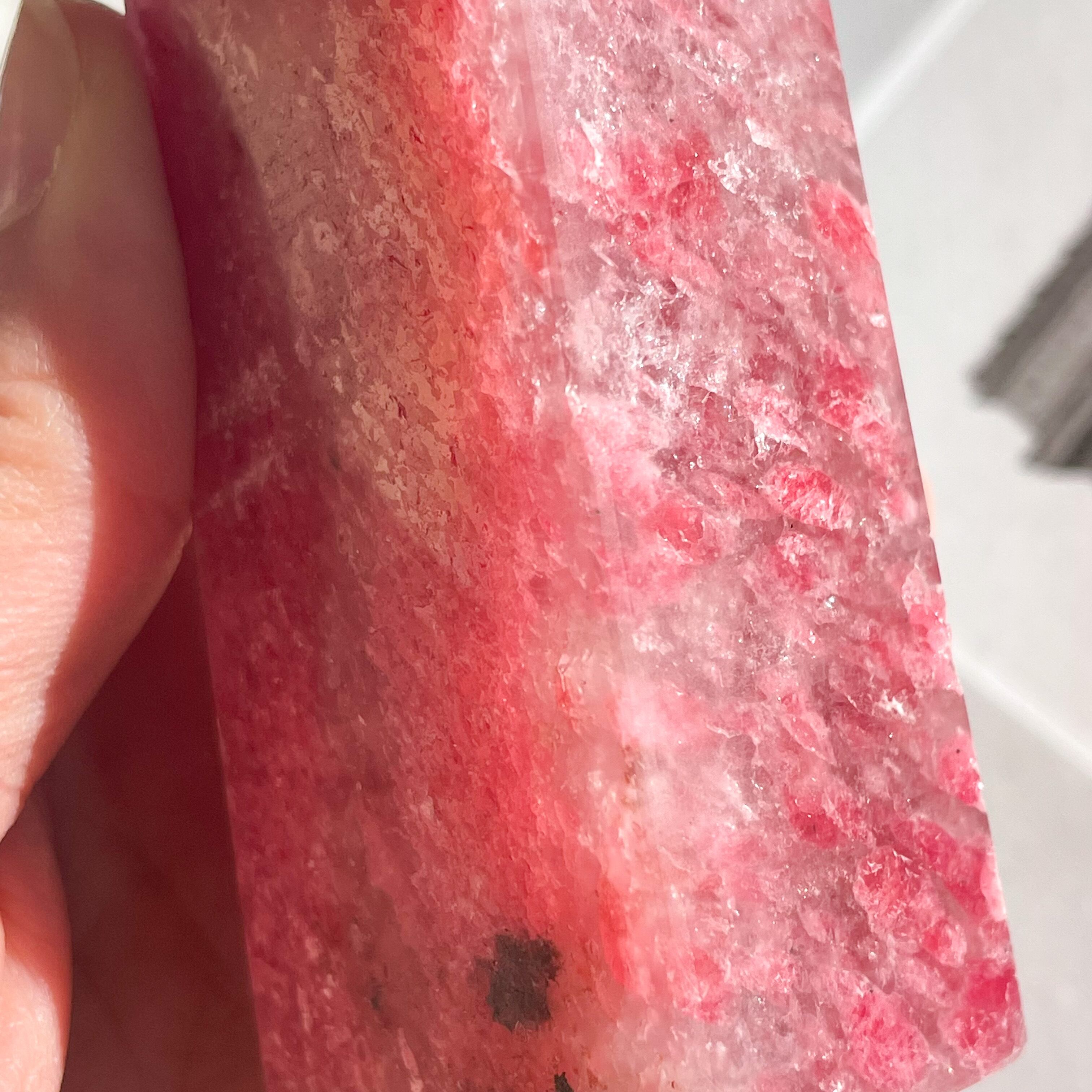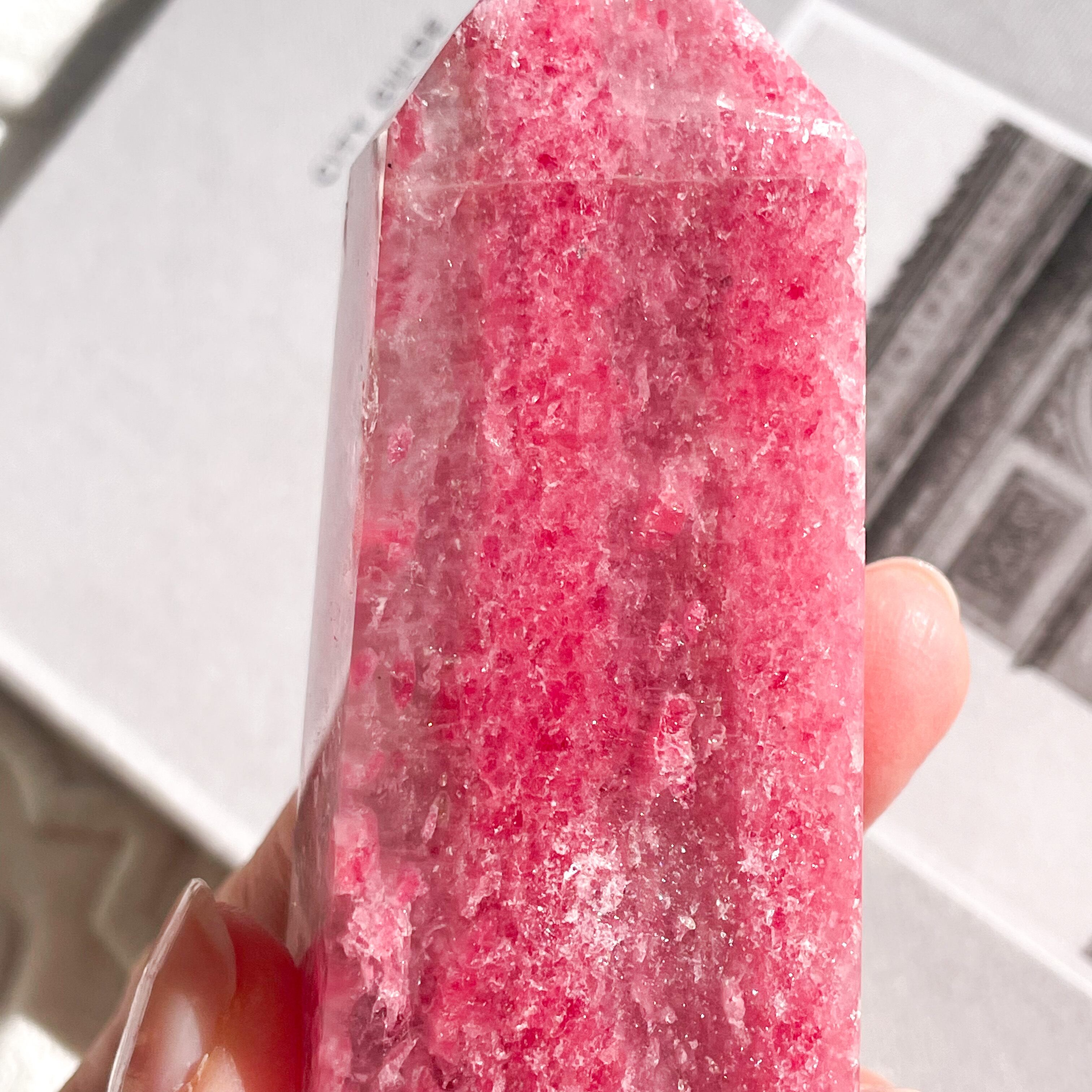 ピンク〜レッドカラーの色合いが薔薇を連想させる美しいストーン。黒いインクルージョンはほとんどみられず、美しいビビッドなローズカラーに目を奪われるタワーです。