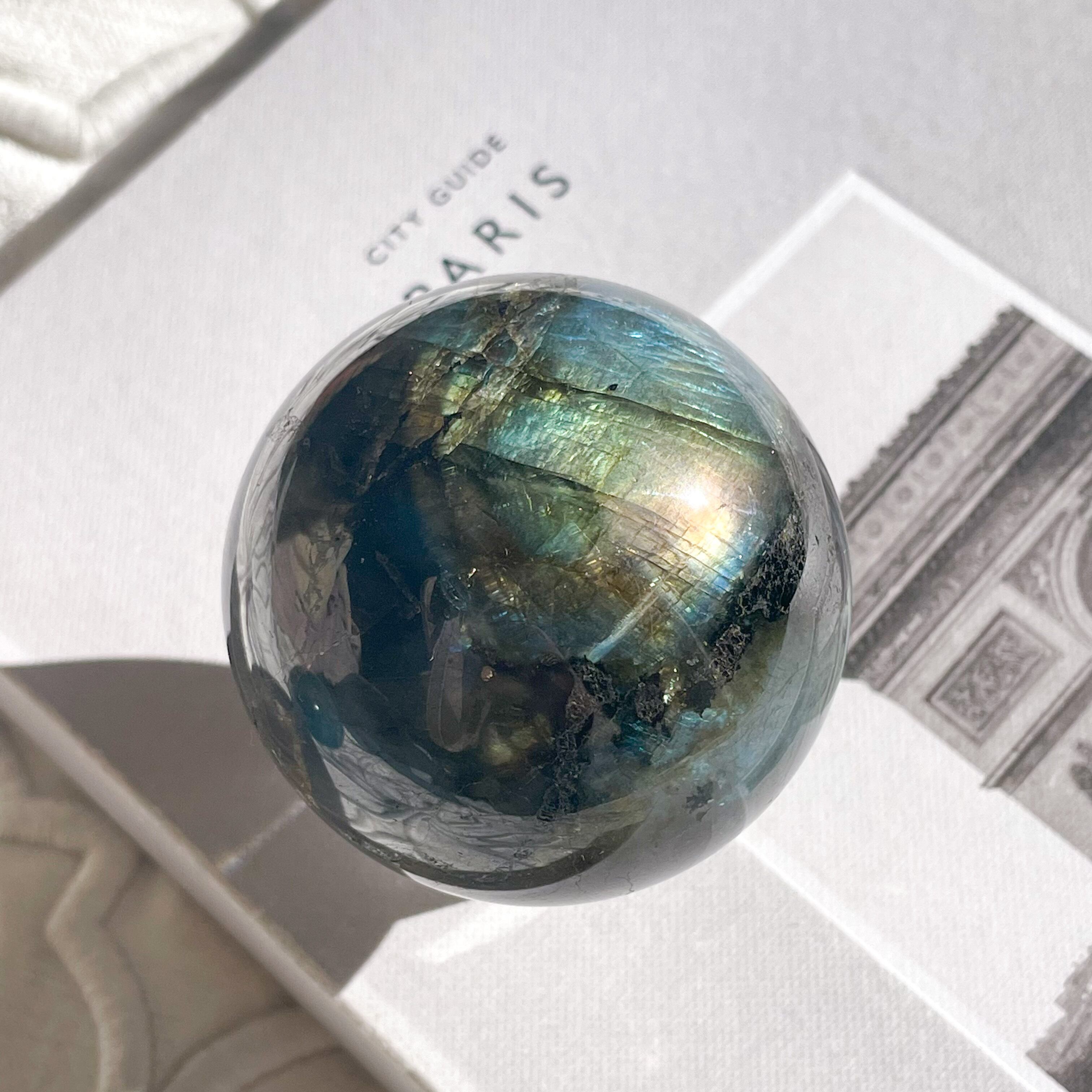 ダークグレイに輝くシラーは、パープル、ピンク、オレンジ、イエロー、グリーン、ライトブルー、そして深いブルー。7色に放たれる光が神秘的な、新月のようなスフィアです。