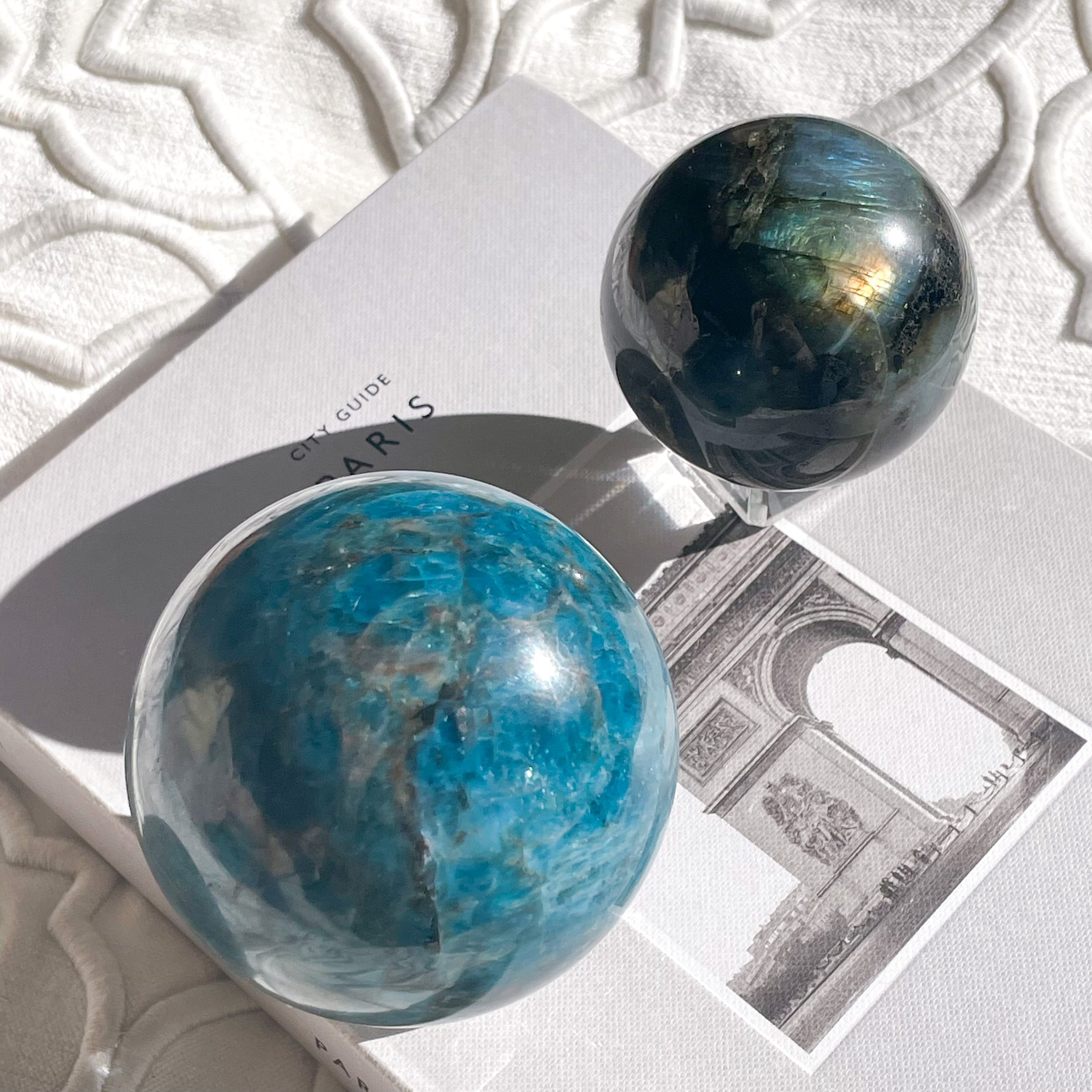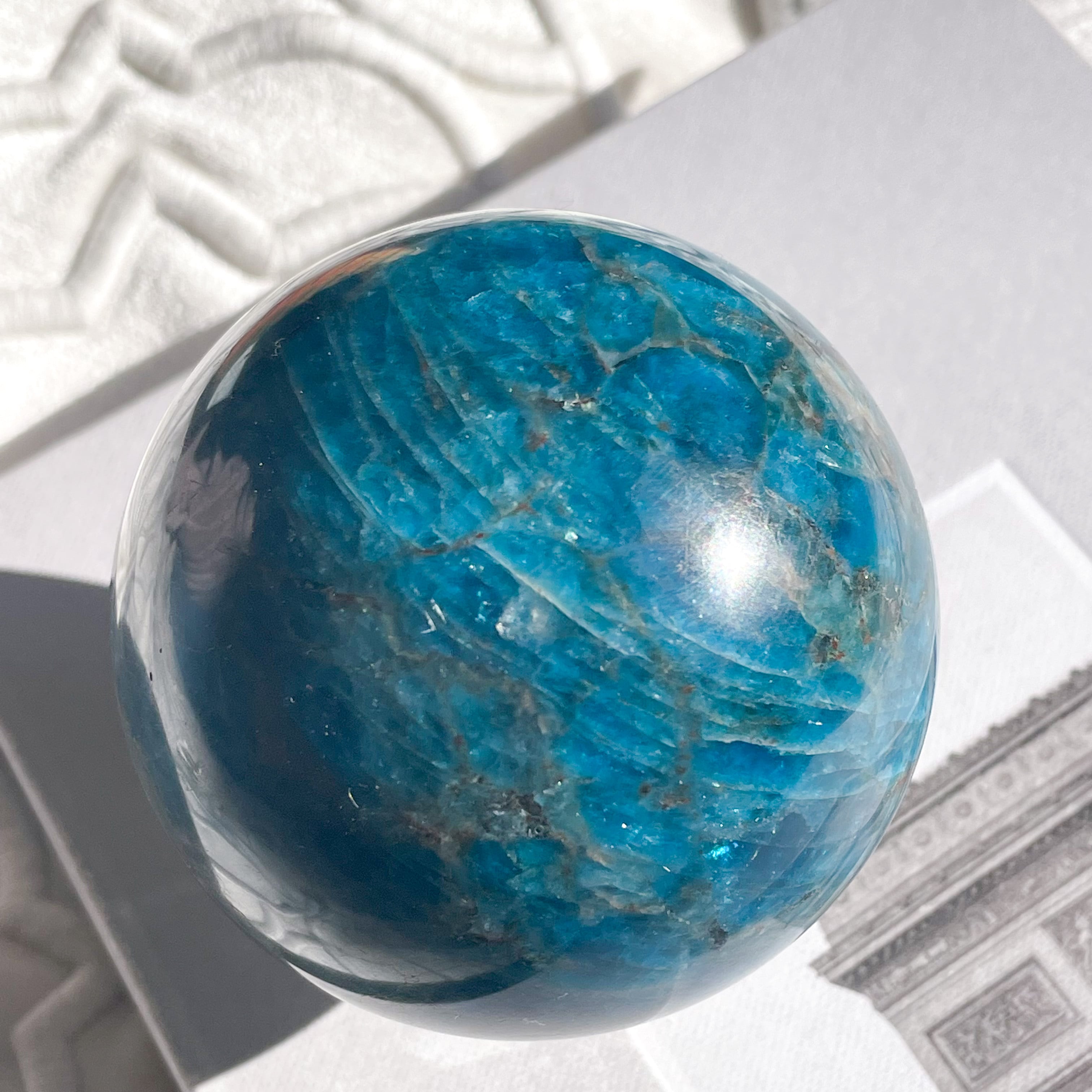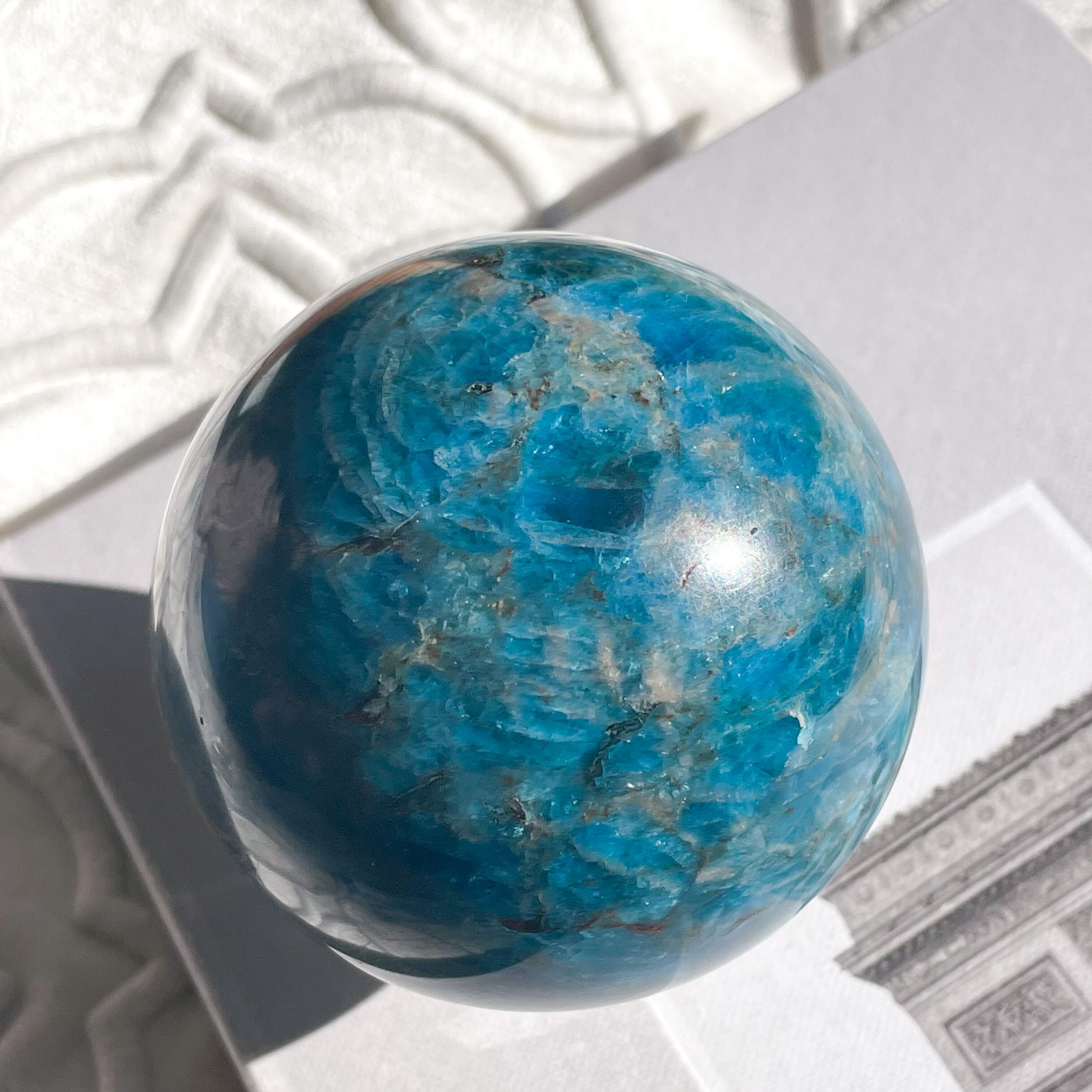 ブラジル産ブルーアパタイトのスフィア。水の星、地球を想わせる美しさです。