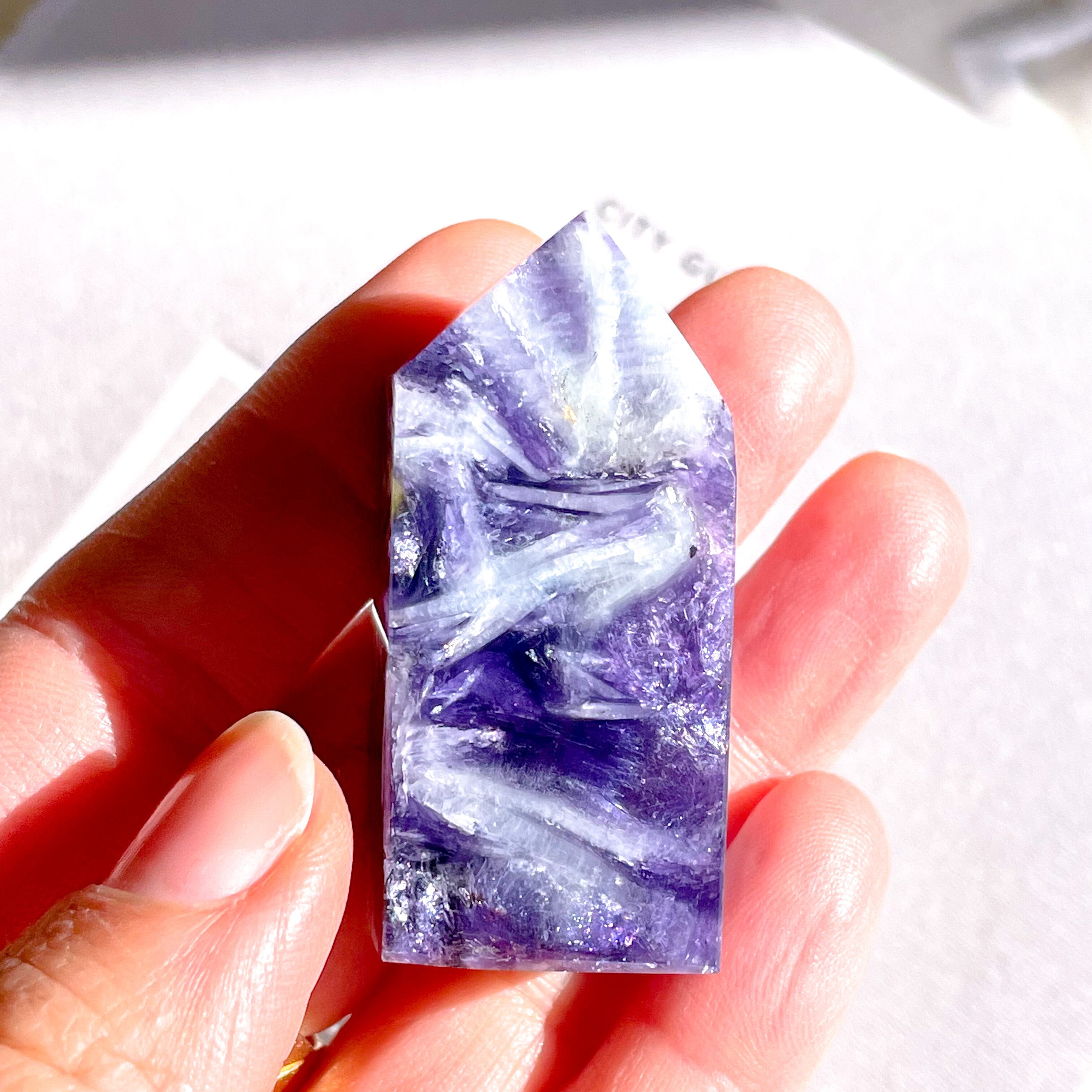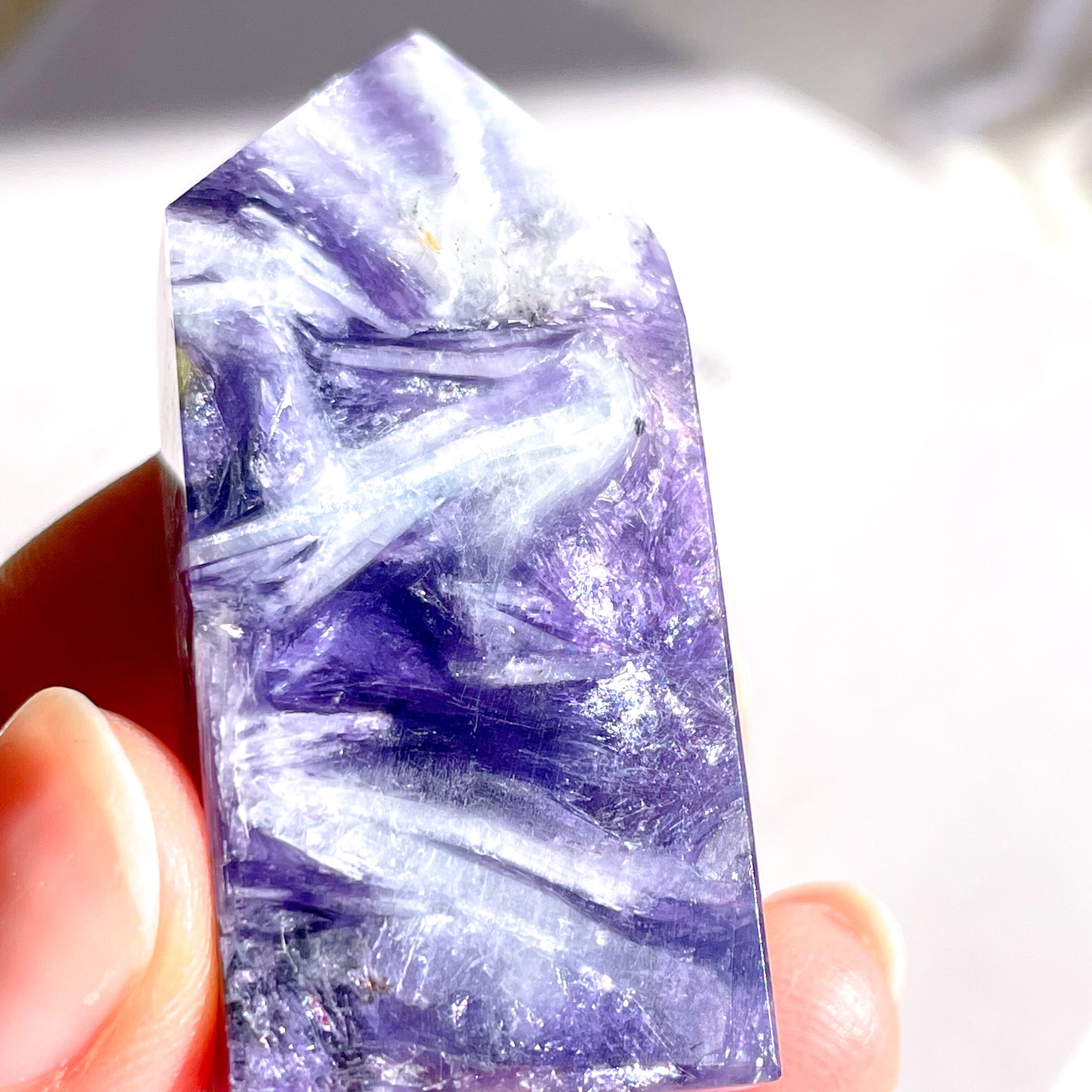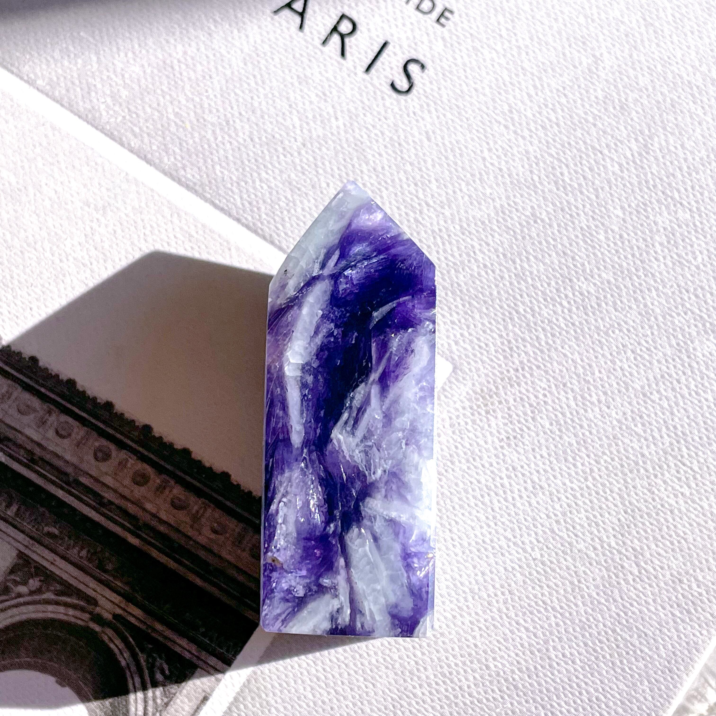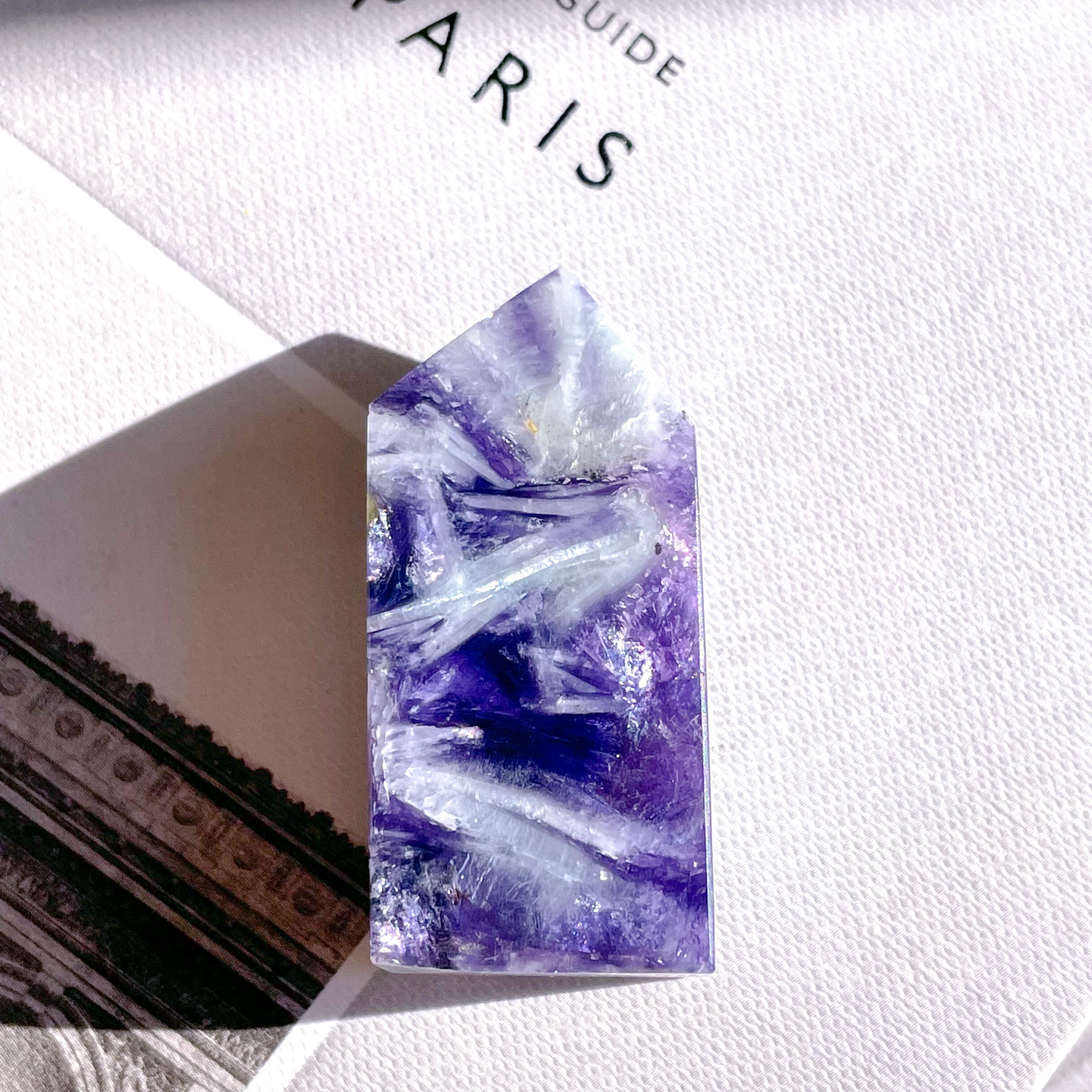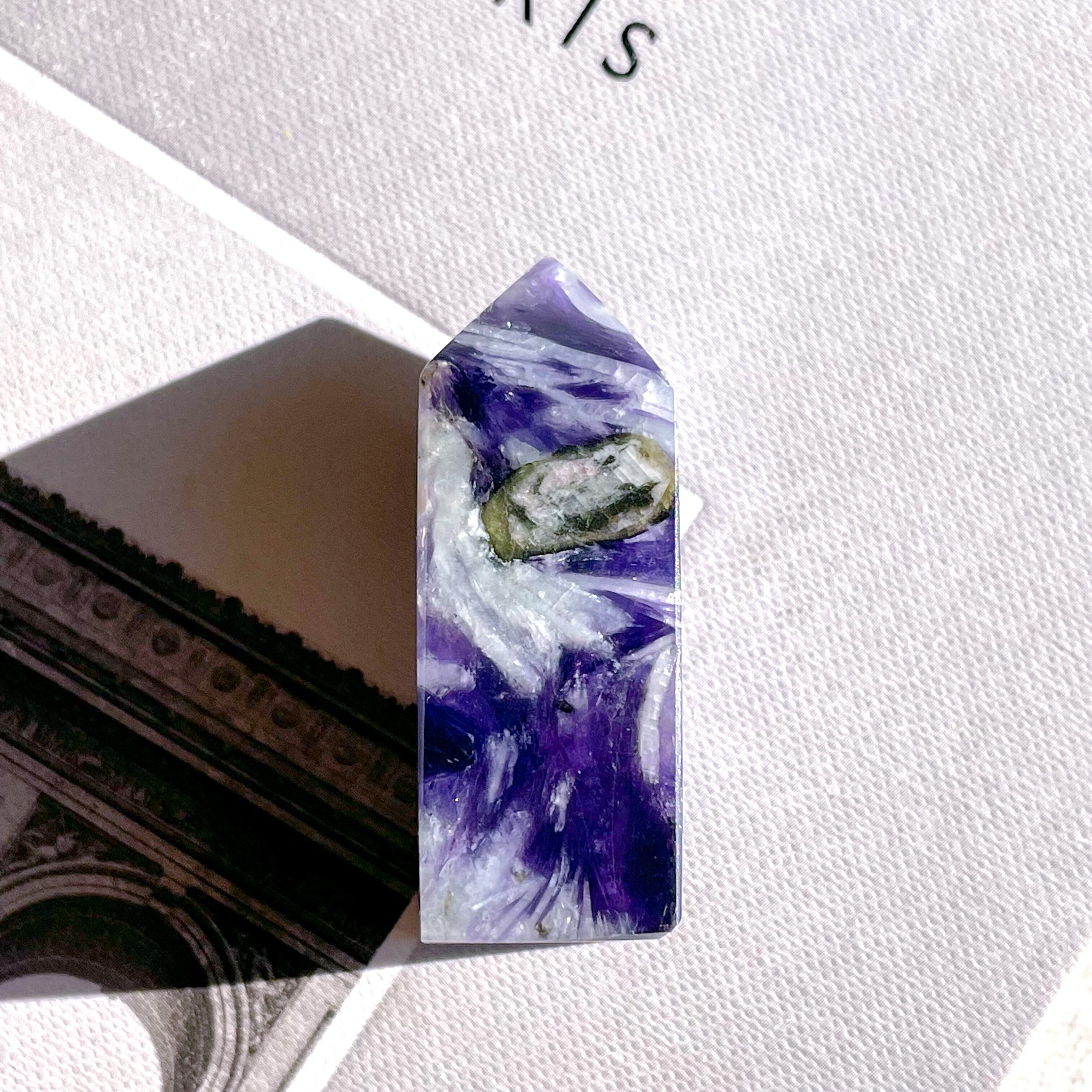 深いパープル、レピドライト特有の雲母がキラキラときらめきます。淡いペールブルーのアクアマリンと共生して美しい模様を描き、吸い込まれてしまいそうな美しいピース。