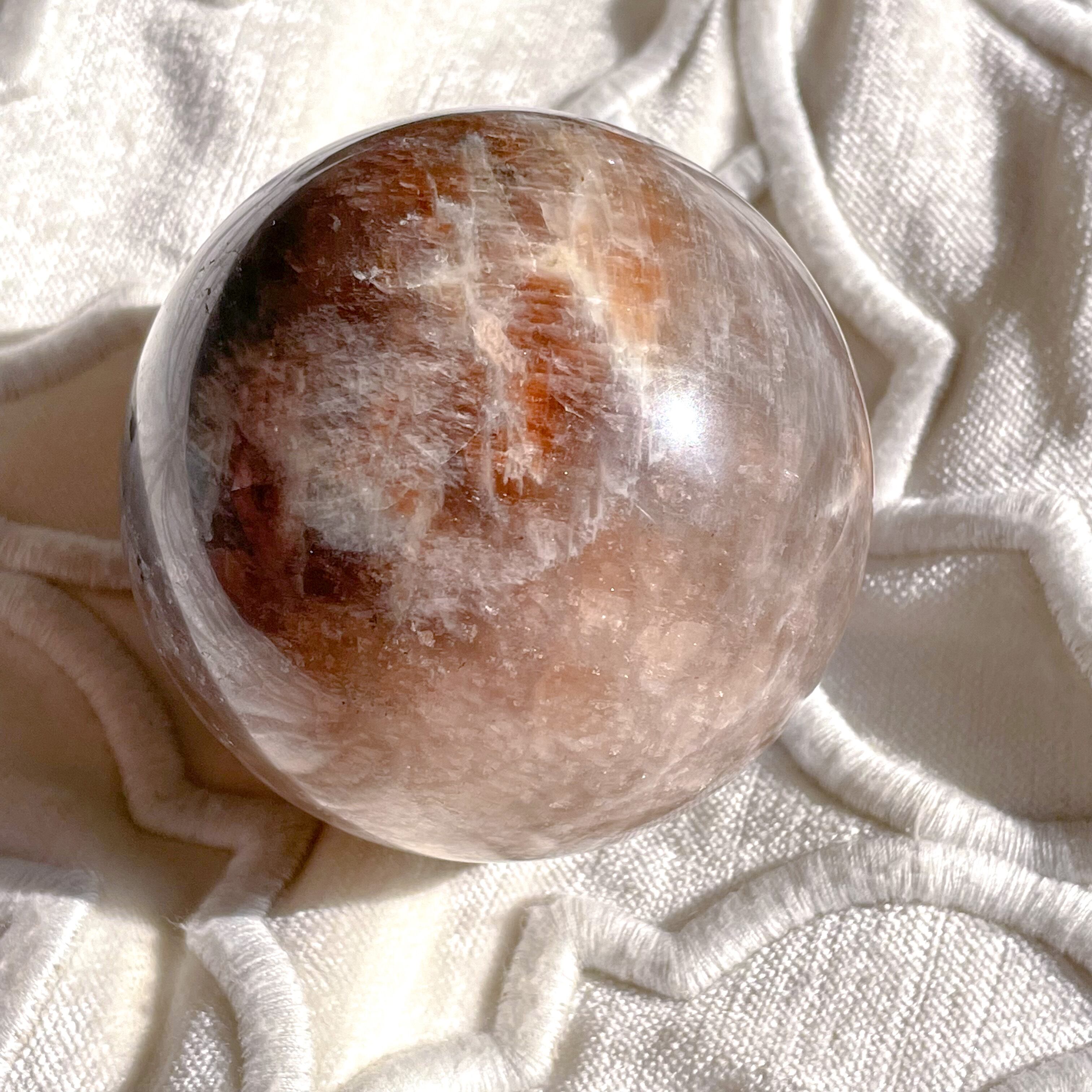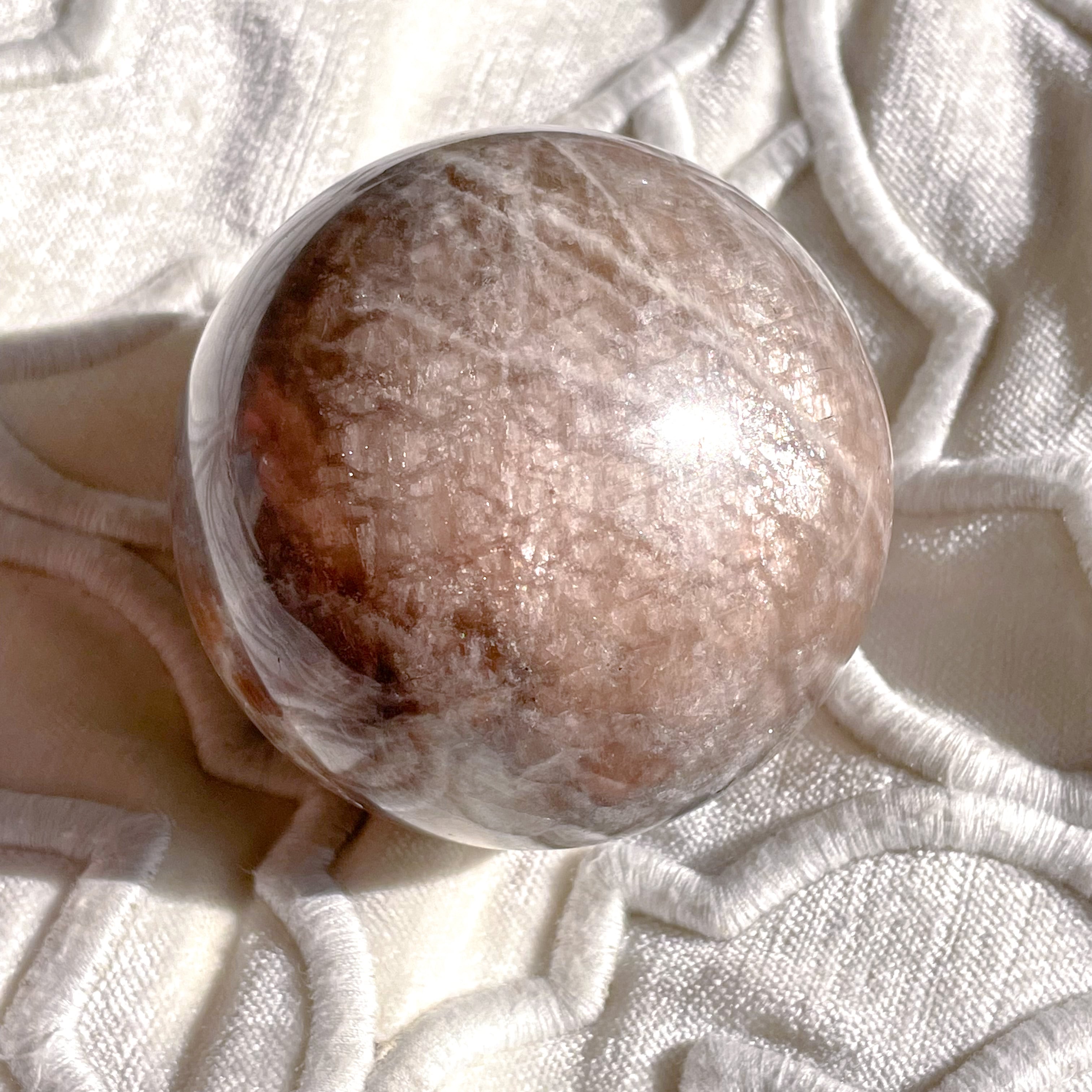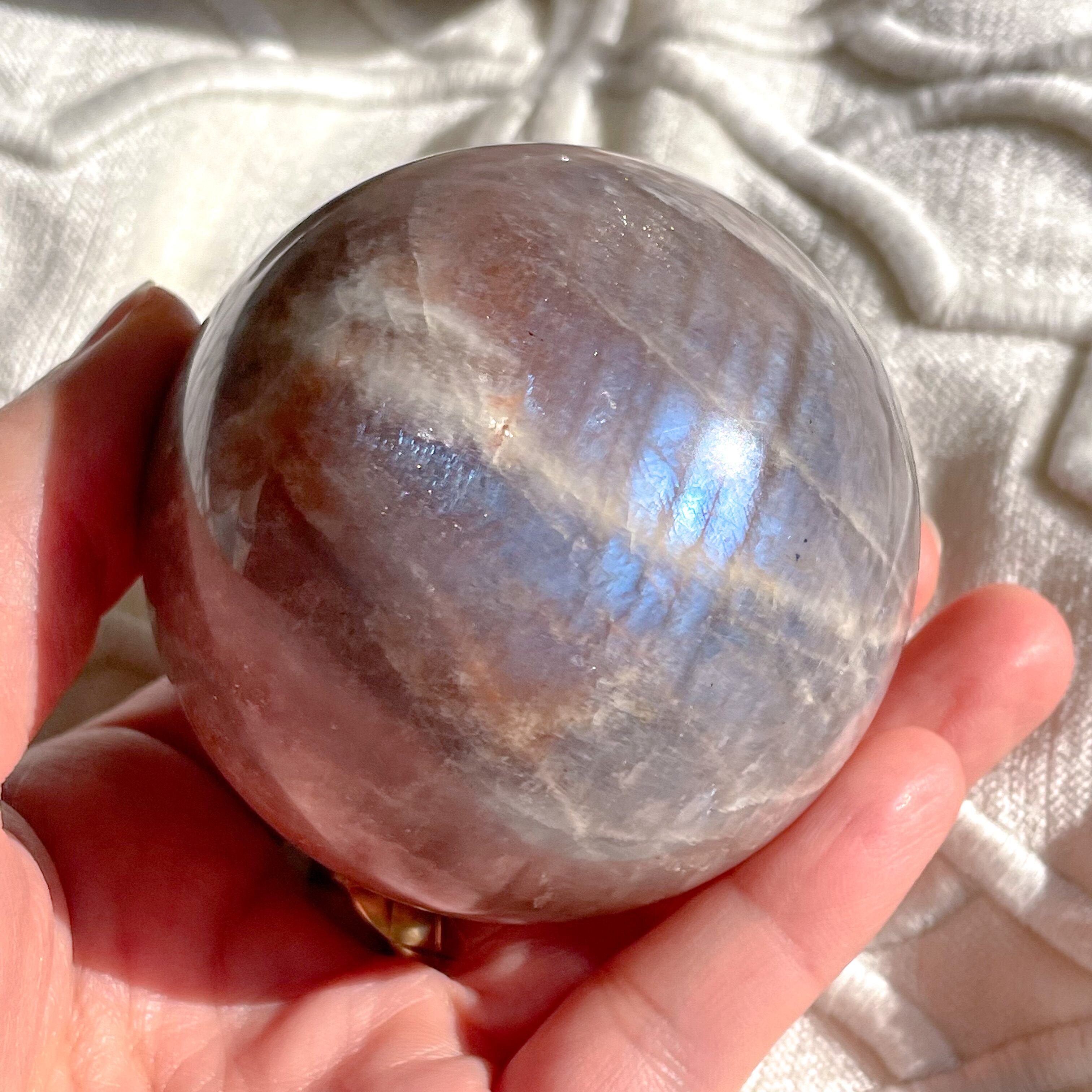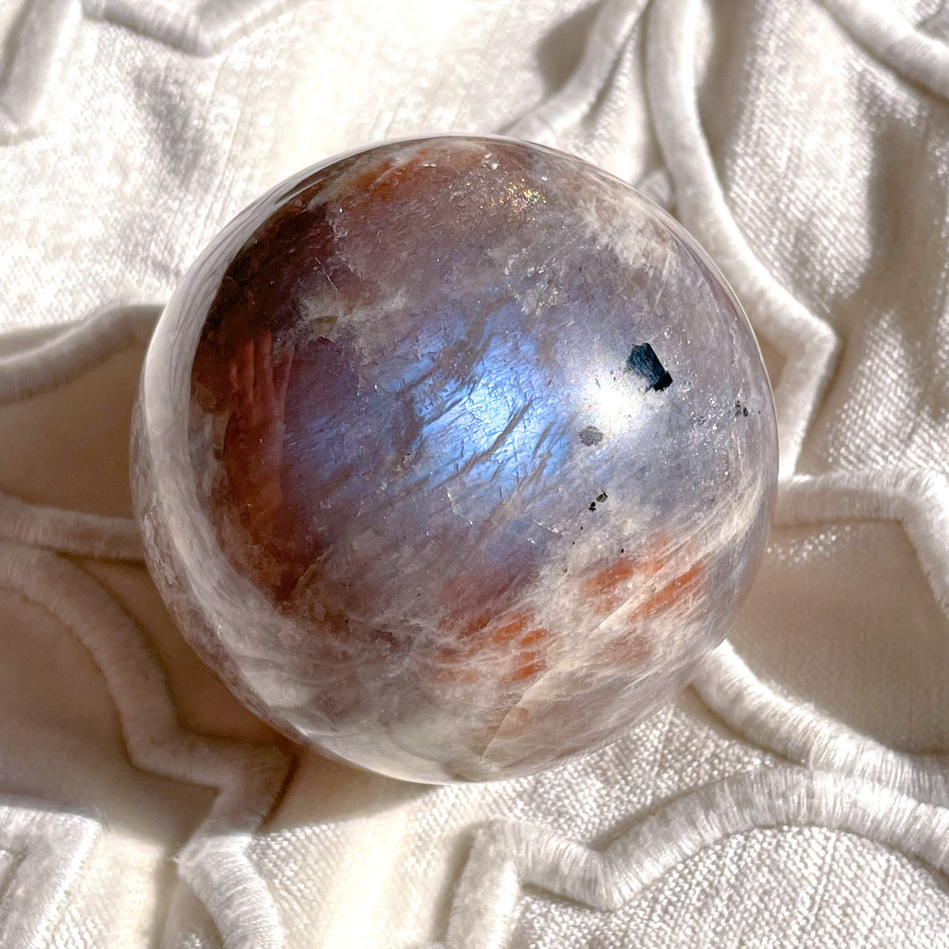 サンストーンの特徴である、シャンパンゴールド色に煌めくアベンチュレッセンス効果と、ムーンストーンに特徴的な、静かな光・青色のイリデッセンス効果、このふたつを併せ持つ、神秘的なストーンです♡