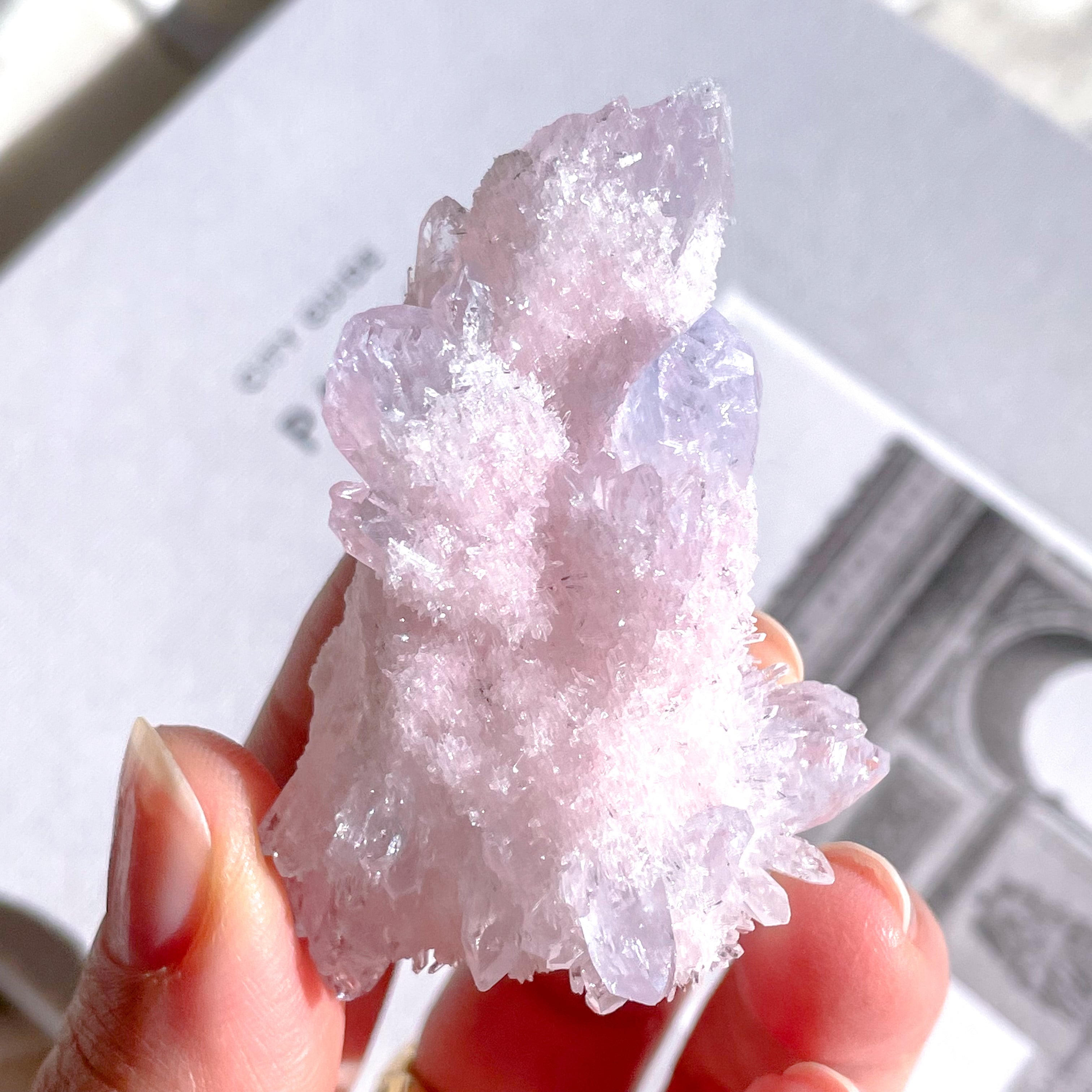 淡いパープルの結晶に、パステルカラーのピンクの結晶群が、砂糖菓子のように散りばめられています。