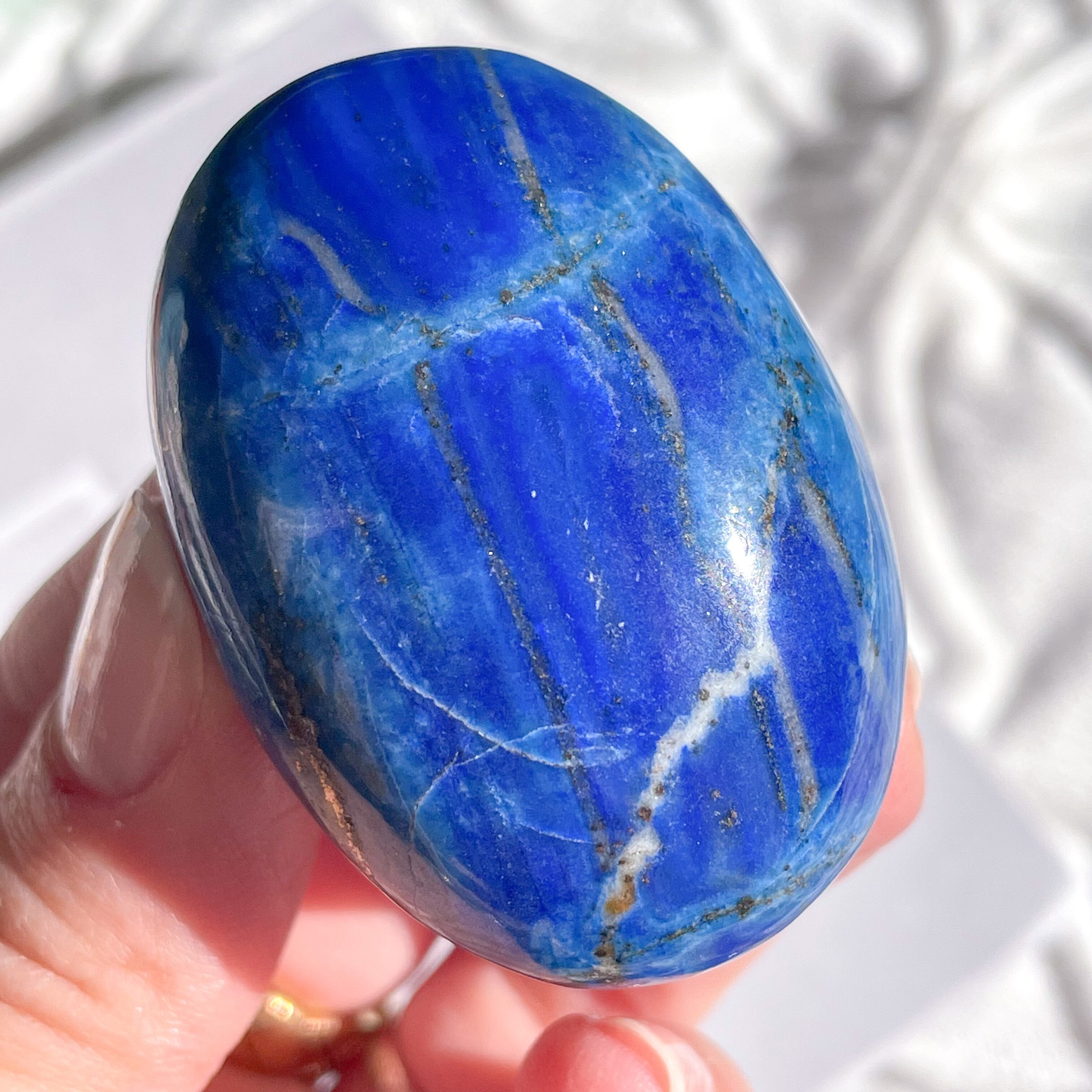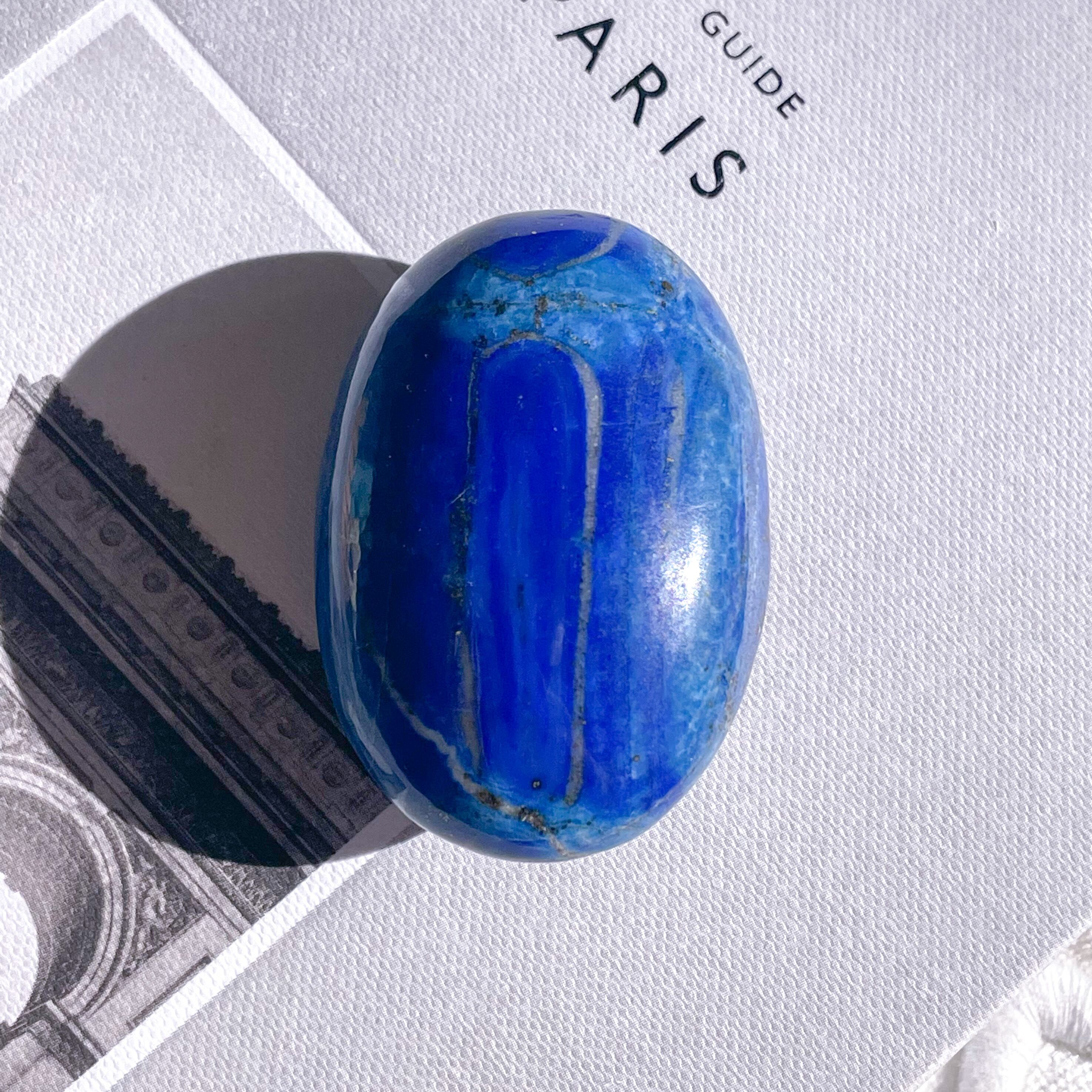 鮮やかな発色。深いブルーの中に、ライン上に入るホワイトとパイライトのコントラストが映えるラピスラズリ♡